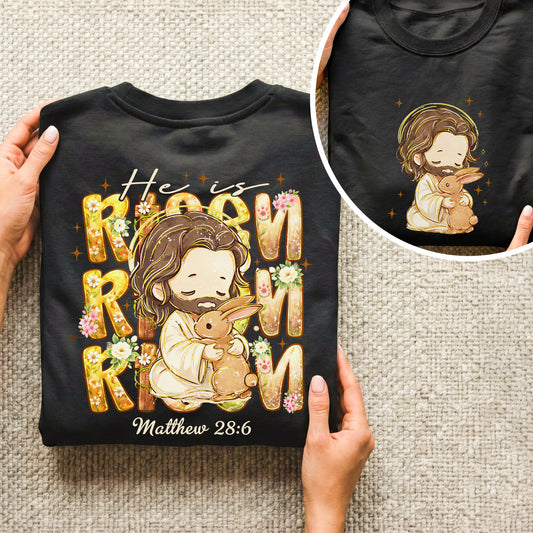 Chibi Jesus And Rabbit Matthew 28:6 - Two Sides - He is Risen - Unisex Tshirt / Hoodie / Sweatshirt