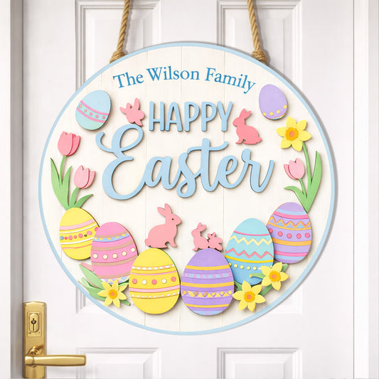 Personalized Happy Easter Door Sign Colorful Egg And Bunny Family