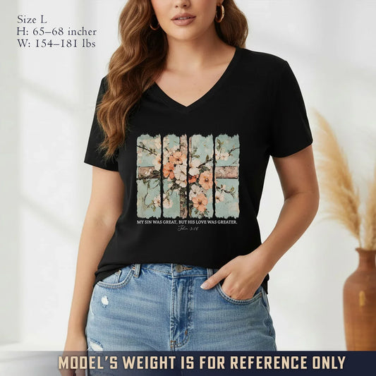 My Sin Was Great, His Love Was Greater V-Neck Christian Shirt - Faith Floral