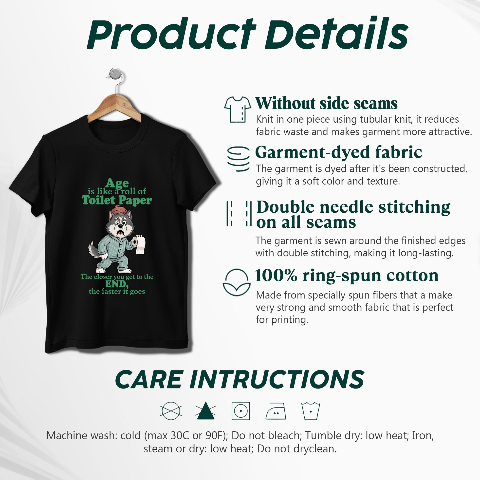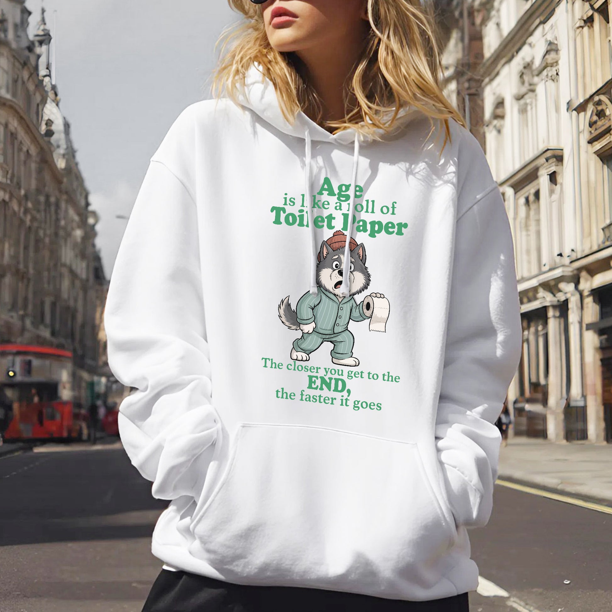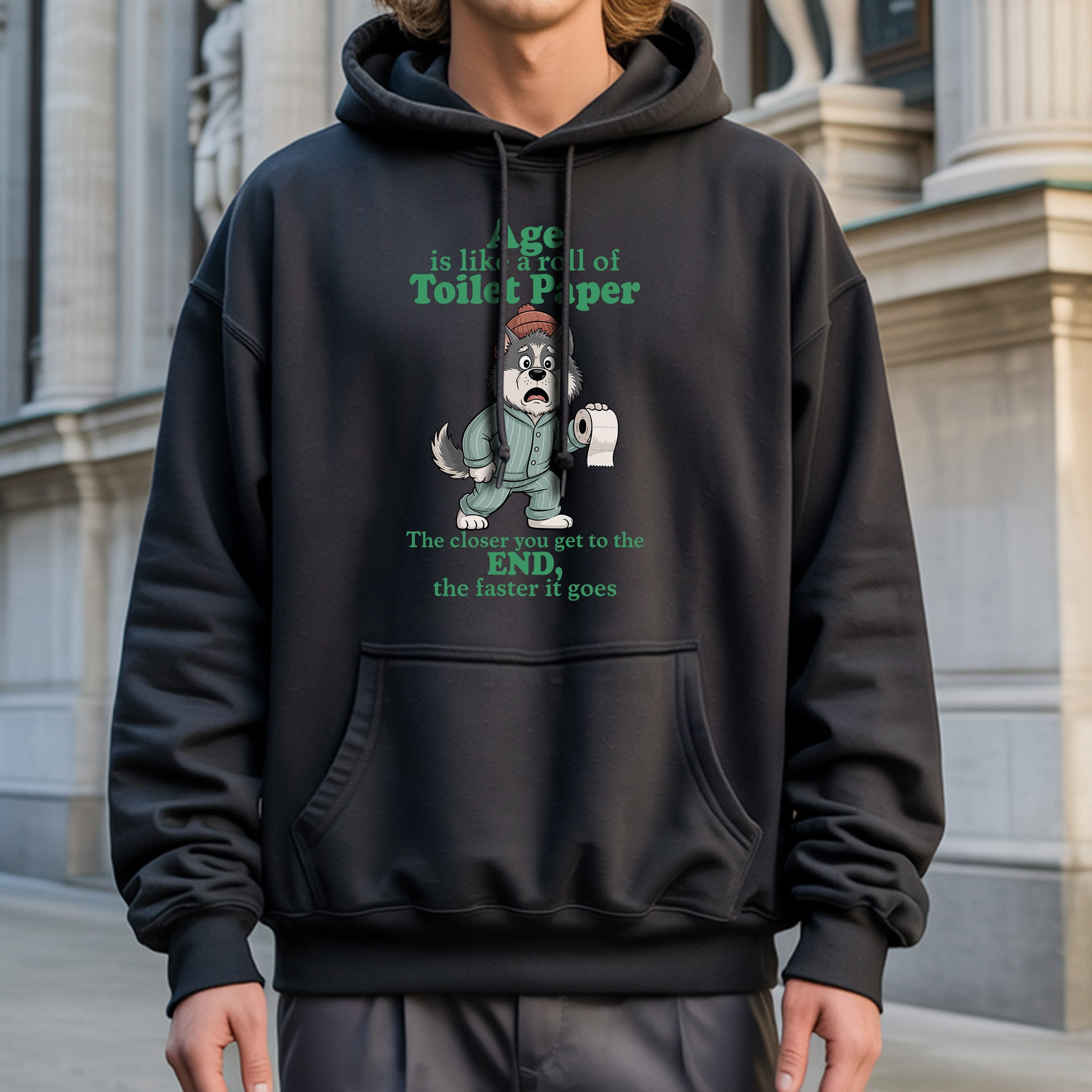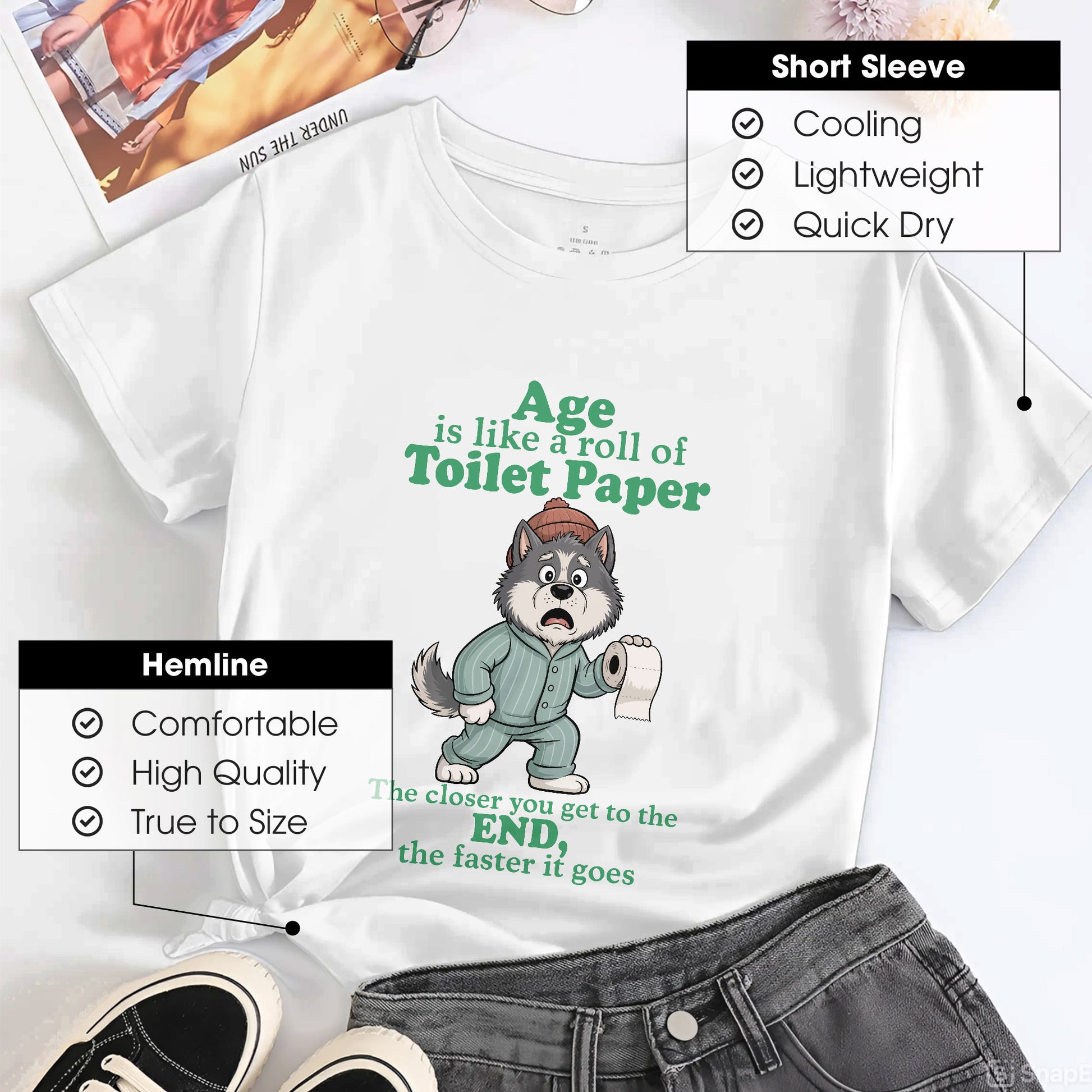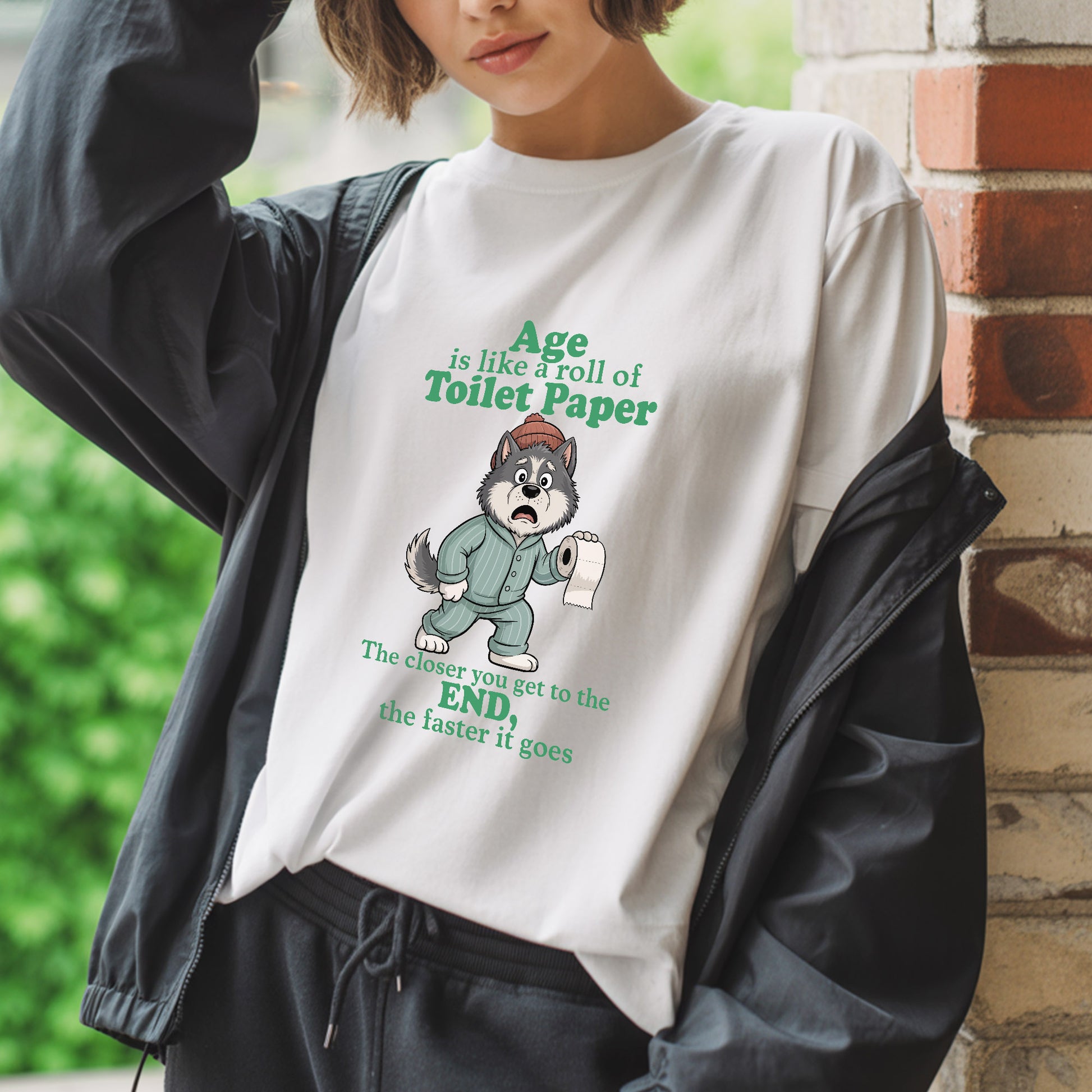 Embrace the hilarious truth about aging with our brilliantly relatable "Age Is Like A Roll Of Toilet Paper" T-Shirt that perfectly captures how time seems to accelerate as we get older! This cleverly designed tee features an adorable wolf in cozy pajamas and a winter hat, holding a roll of toilet paper with a slightly panicked expression that perfectly embodies the realization that time is moving faster than we'd like to admit. The profound yet humorous message "The closer you get to the END, the faster it goes" speaks to the universal experience of how days, months, and years seem to fly by at an increasingly rapid pace as we age, much like how a toilet paper roll seems to disappear faster when you're down to the last few sheets. The analogy is both brilliant and slightly concerning, as it captures that moment when you realize that time isn't just passing – it's practically sprinting, and you're left wondering where all those years went and why nobody warned you that life would feel like it's on fast-forward mode once you hit a certain age. Made from premium soft cotton that's as comforting as denial about your actual age, this tee is perfect for women who appreciate dark humor about the passage of time, understand that aging is both a privilege and a slightly terrifying experience, or want to share a laugh with others who are also wondering when life switched from regular speed to warp drive. Perfect for the woman who's noticed that birthdays seem to come around faster each year, loves to find humor in life's inevitable truths, or wants to wear a shirt that perfectly captures the bittersweet reality that while we're grateful for every year we get, we'd also like time to slow down just a little bit so we can actually enjoy them, this thought-provoking tee serves as both a conversation starter and a gentle reminder to make the most of every moment – because apparently, the toilet paper roll of life doesn't come with a pause button.