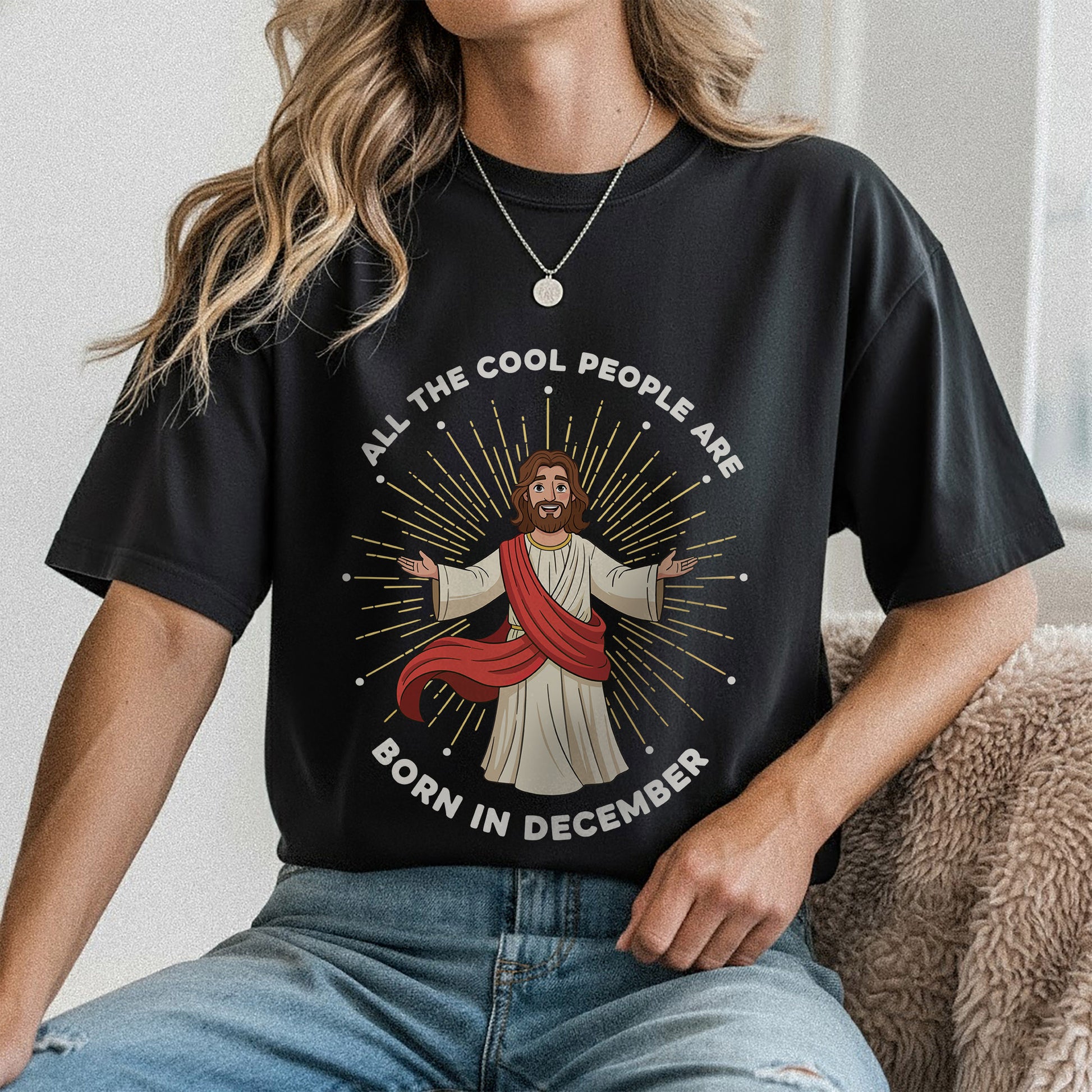 Celebrate the season of Christ's birth with our "All the Cool People Are Born in December" Jesus design. Featuring a vibrant and joyful illustration of Jesus, this fun and meaningful piece is perfect for anyone born in December and anyone who loves to celebrate Christmas. This shirt makes a great gift and is ideal for spreading holiday cheer with a message that honors the true reason for the season.