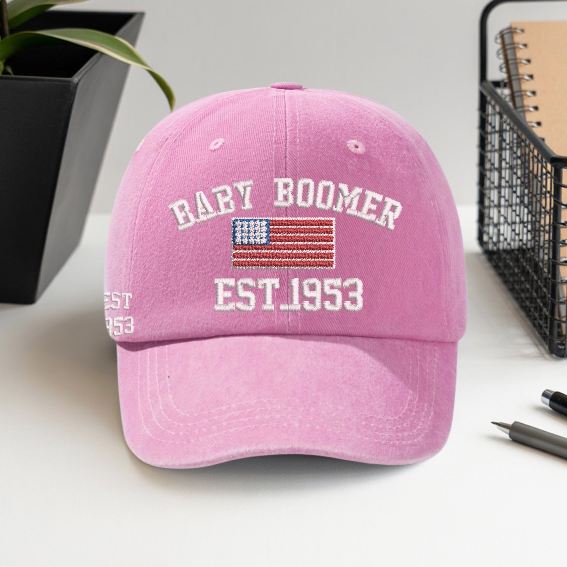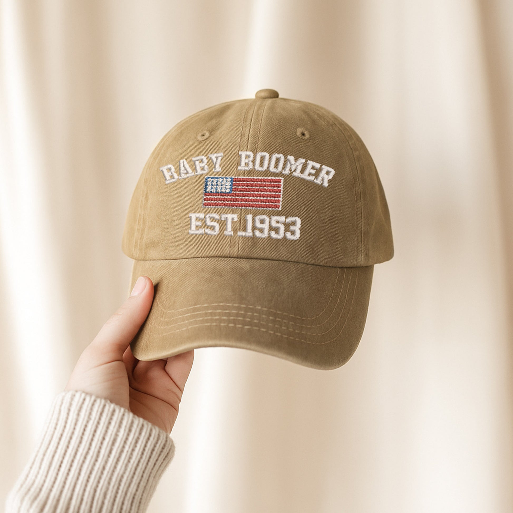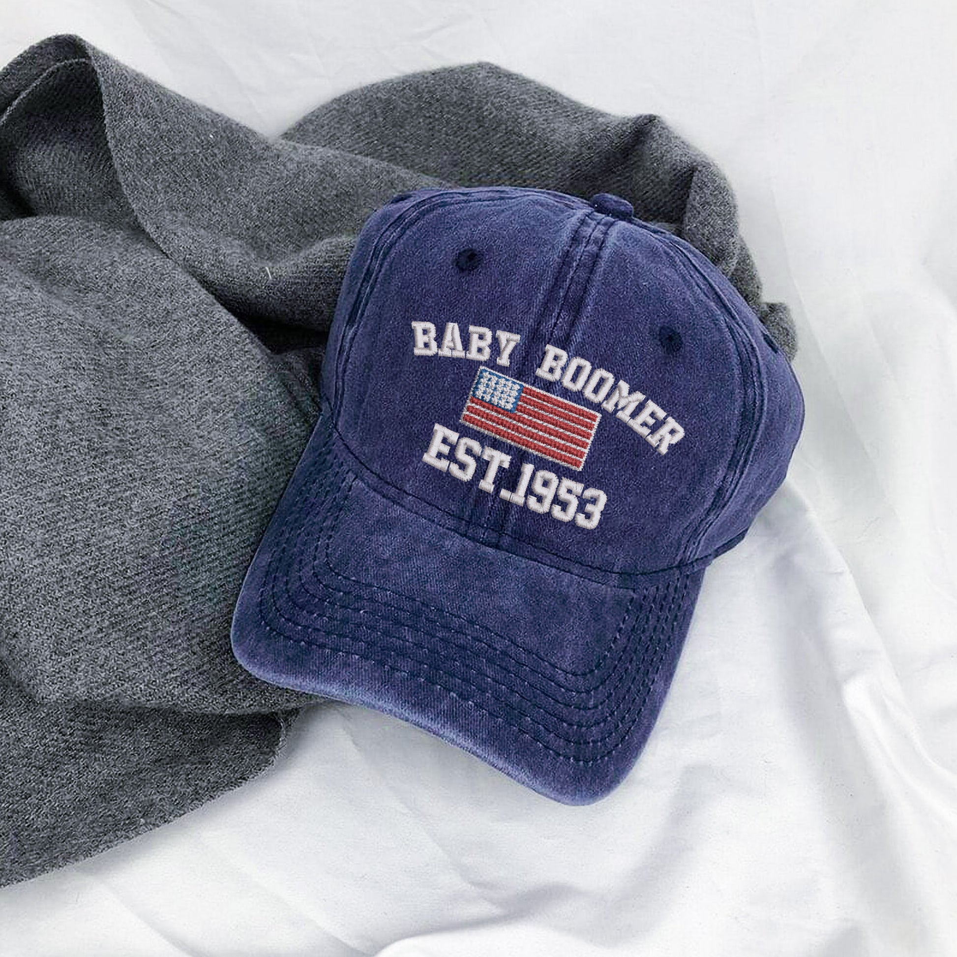 Celebrate your roots with the Baby Boomer American Heritage Cap, featuring a bold “EST. 1953” embroidery and the iconic American flag. This customizable year hat is perfect for honoring your birth year, family milestones, or boomer legacy. With classic black styling and durable stitching, it's designed for those who value American tradition and want to showcase their story with pride. A timeless accessory for everyday wear or as a meaningful gift for anyone proud of their boomer heritage.