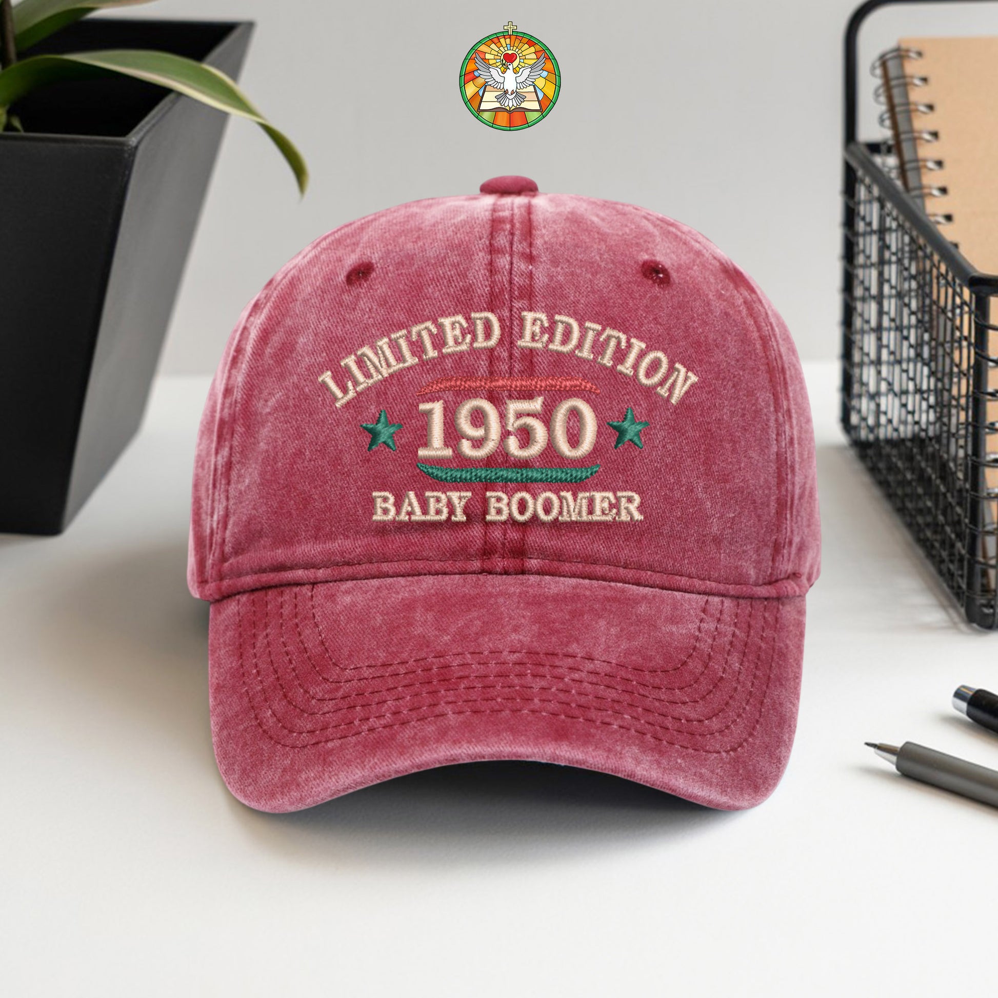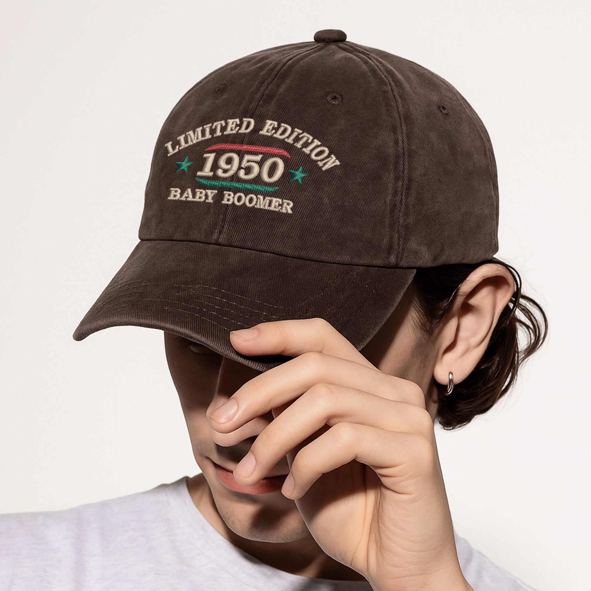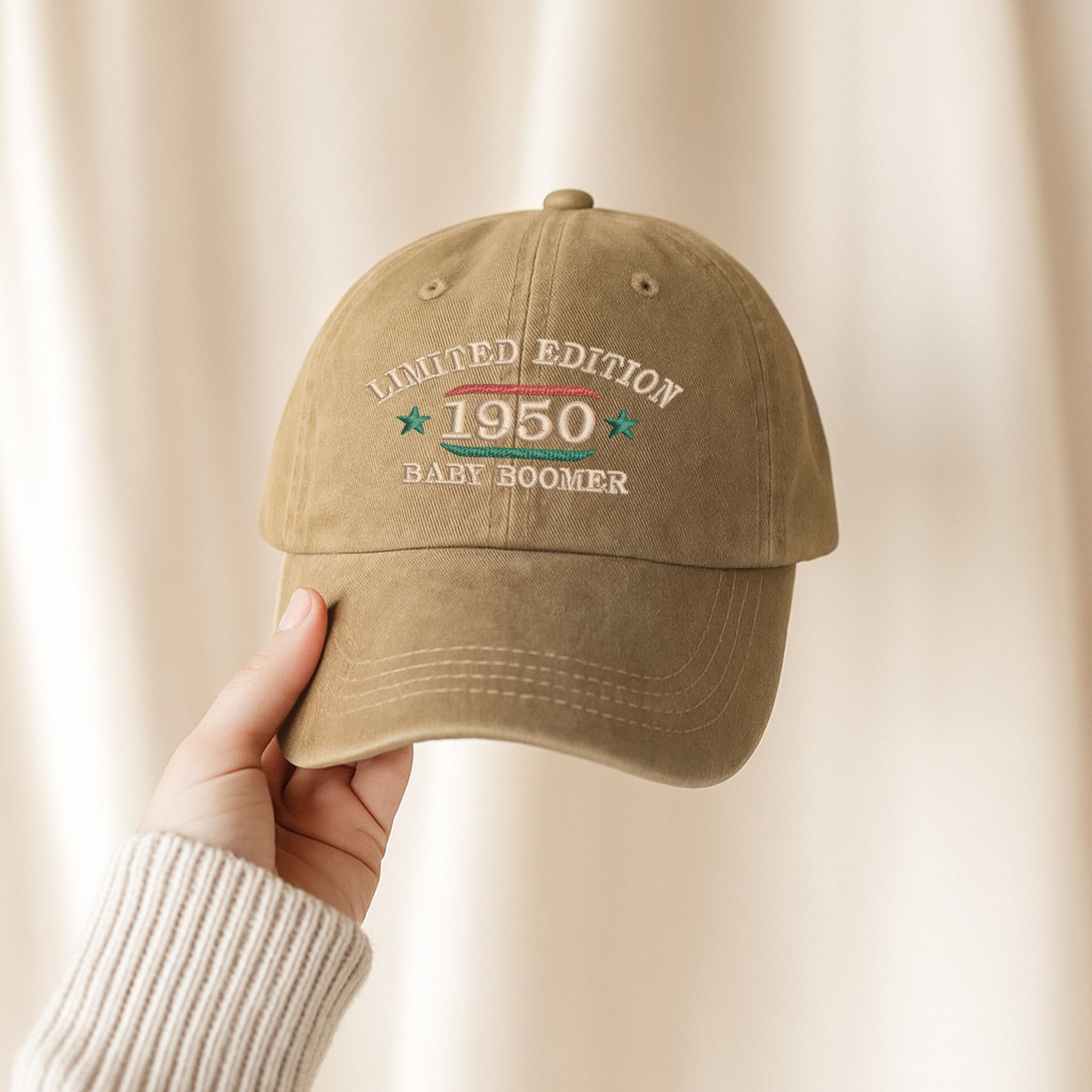 Showcase timeless style and personal heritage with the Baby Boomer Limited Edition Cap, featuring a bold “1950” embroidery surrounded by classic accents and the iconic Baby Boomer label. This is a customizable year cap—choose any special year to make it your own, celebrating birthdays, milestones, or family legacy. With its vintage black finish and sturdy design, this hat is perfect for those who value American tradition and want a personalized keepsake to honor their generation and story.