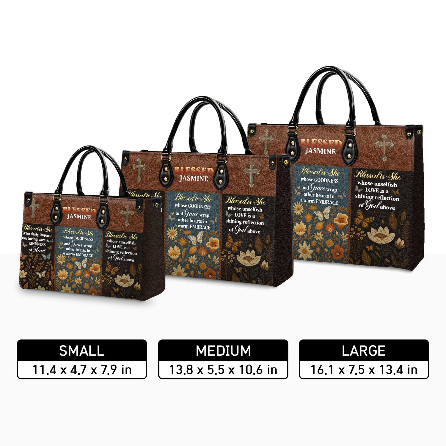 Carry your virtues with blessed confidence with our "Blessed Is She" Personalized Leather Handbag. This exquisite virtue-inspired accessory beautifully combines feminine strength with spiritual elegance, featuring three panels celebrating the blessed woman - she who imparts nurturing kindness of heart, whose goodness and grace embrace others warmly, and whose unselfish love reflects God above, all adorned with golden florals and butterflies against rich earth tones that symbolize the beauty of a woman's godly character. Perfect for the faithful woman who embodies Christian virtues while maintaining sophisticated style, this handcrafted handbag serves as both a daily companion and a meaningful reminder that blessed is she who walks in kindness, grace, and love.