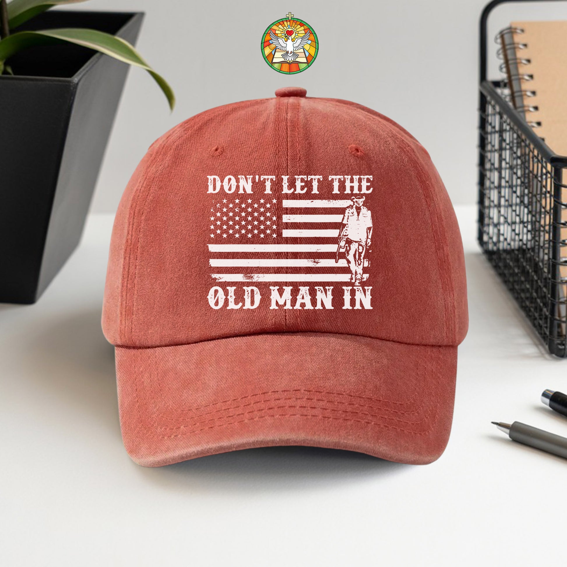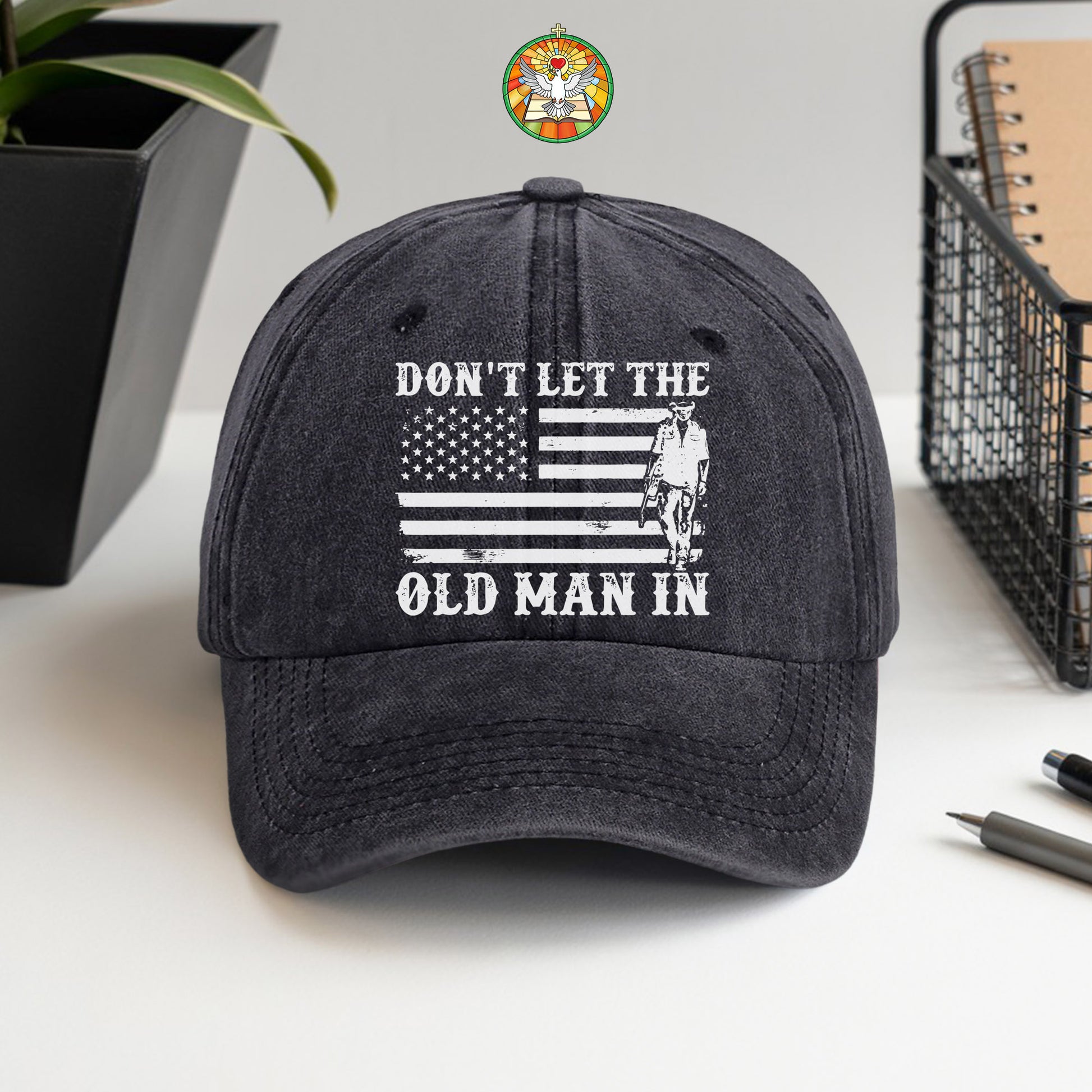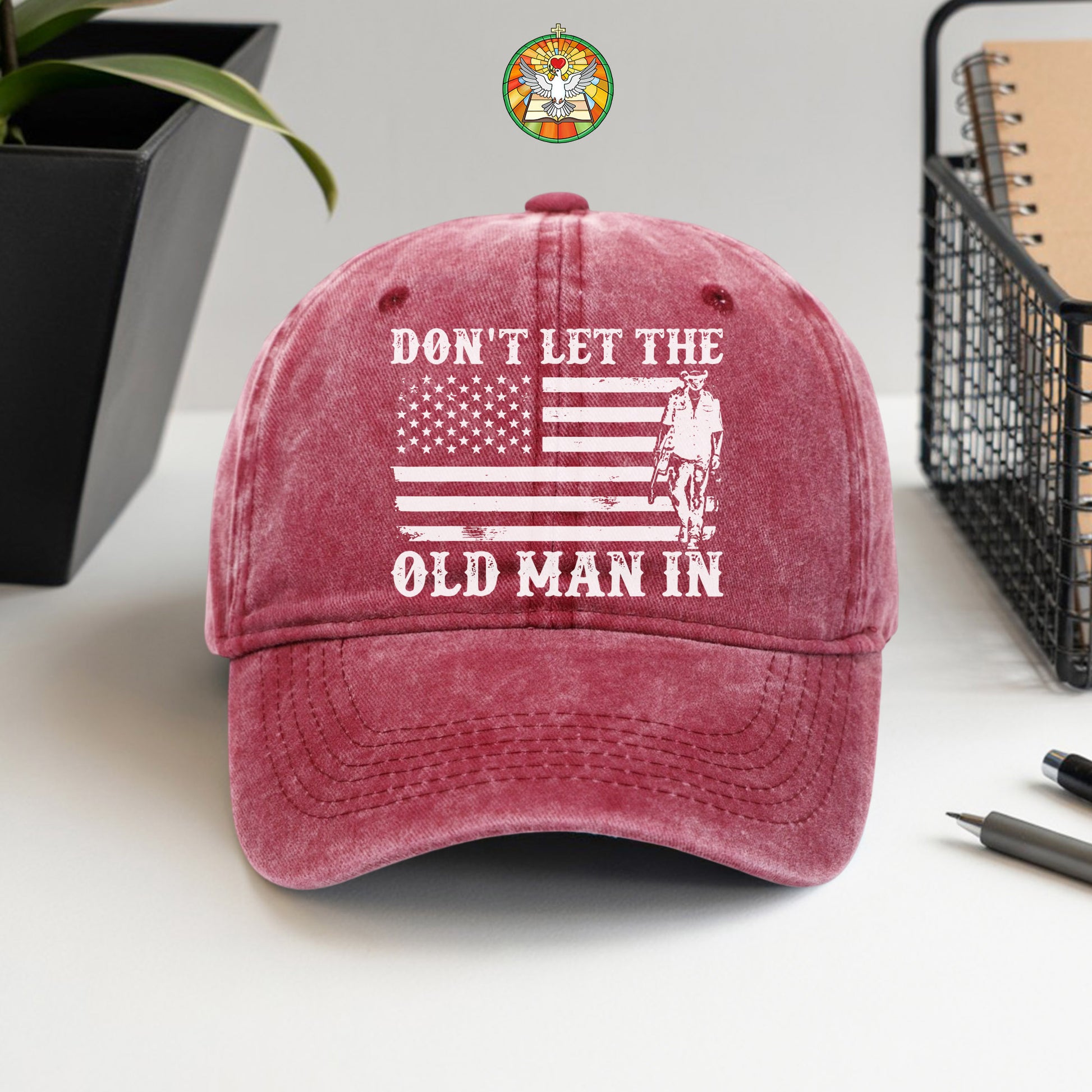 The baseball cap has become a popular fashion accessory and is suitable for all ages and genders. This meaningful cap features "DON'T LET THE OLD MAN IN" with American flag and cowboy imagery, celebrating the spirit of staying young at heart and maintaining vitality. Perfect for those who refuse to let age define their limitations, those who embrace the cowboy spirit of resilience and determination, and patriots who believe in the American dream of endless possibility. It's a powerful reminder to stay young in spirit, maintain your fighting edge, and never surrender to the limitations that age might impose. It is comfortable, stylish, versatile and perfect for your casual outfits while sharing your youthful determination. This is the perfect gift for young-at-heart individuals, supporters of cowboy culture, or anyone who believes in defying age limitations, suitable for all occasions: outdoor adventures, patriotic events, holidays, and everyday youthful spirit!