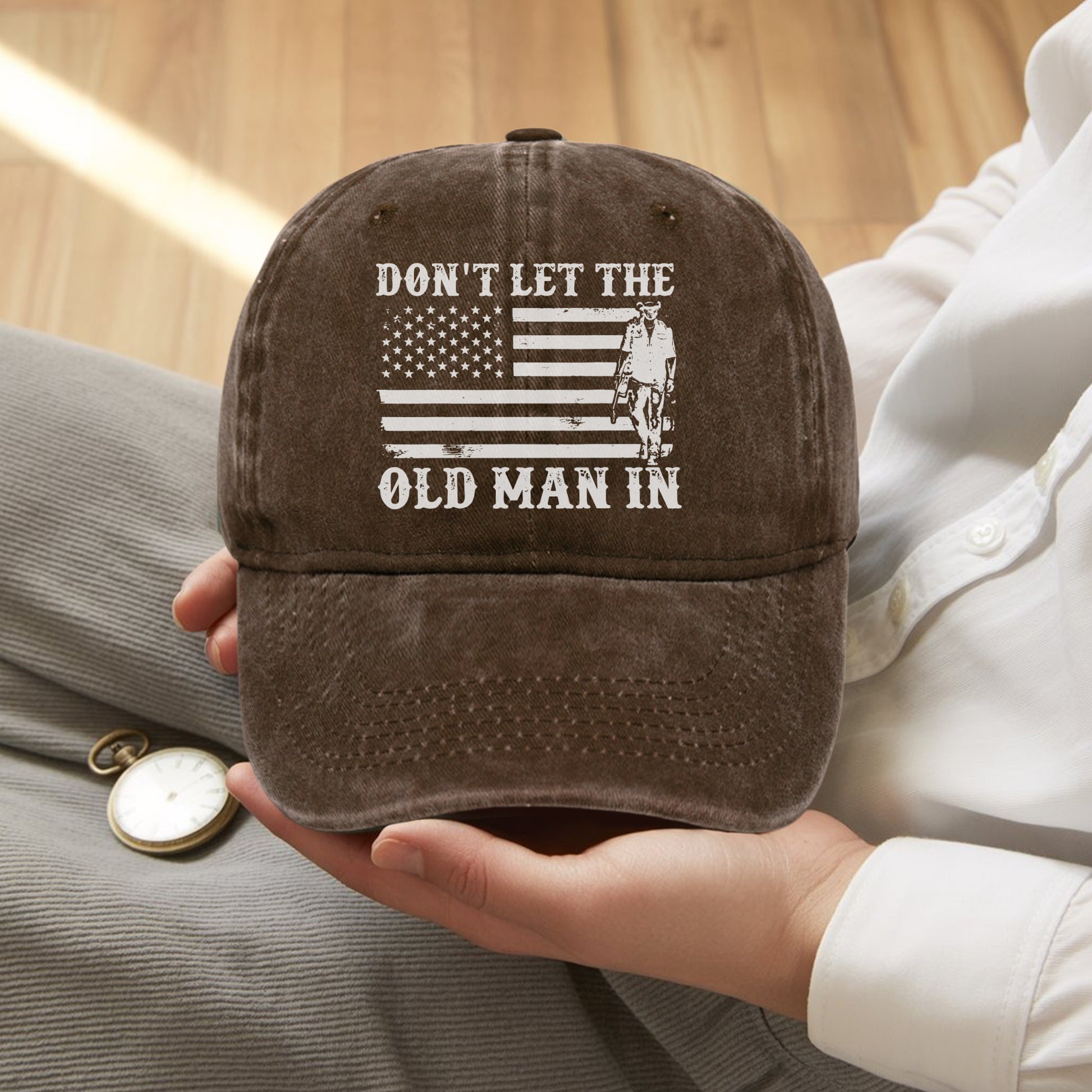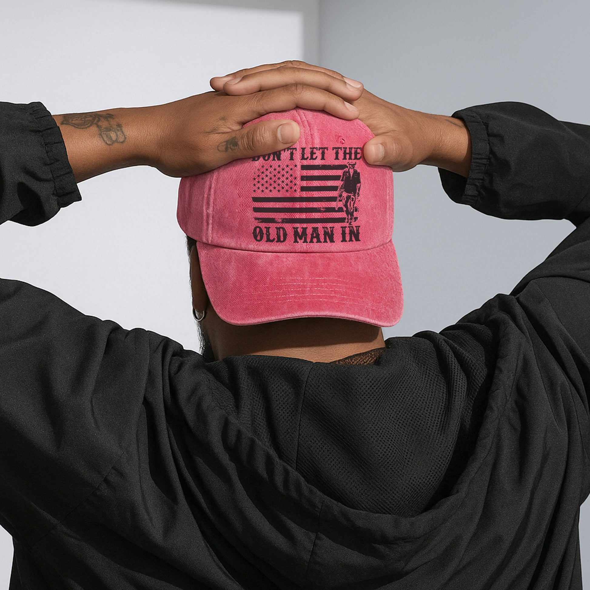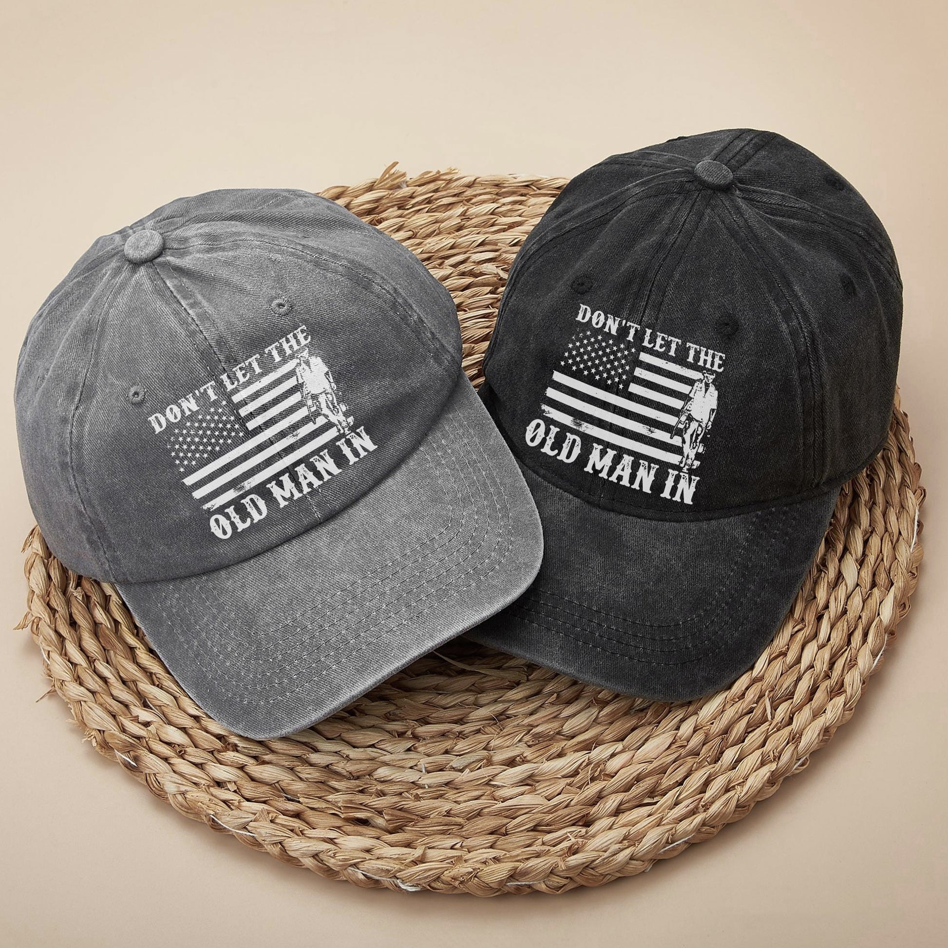 The baseball cap has become a popular fashion accessory and is suitable for all ages and genders. This meaningful cap features "DON'T LET THE OLD MAN IN" with American flag and cowboy imagery, celebrating the spirit of staying young at heart and maintaining vitality. Perfect for those who refuse to let age define their limitations, those who embrace the cowboy spirit of resilience and determination, and patriots who believe in the American dream of endless possibility. It's a powerful reminder to stay young in spirit, maintain your fighting edge, and never surrender to the limitations that age might impose. It is comfortable, stylish, versatile and perfect for your casual outfits while sharing your youthful determination. This is the perfect gift for young-at-heart individuals, supporters of cowboy culture, or anyone who believes in defying age limitations, suitable for all occasions: outdoor adventures, patriotic events, holidays, and everyday youthful spirit!