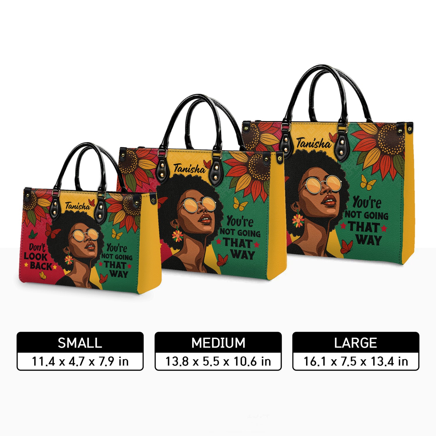 Carry your forward momentum with vibrant confidence with our "Don't Look Back" Personalized Leather Handbag. This exquisite motivation-inspired accessory beautifully combines positive affirmation with cultural pride, featuring a stunning portrait of a confident woman with magnificent natural afro and stylish yellow sunglasses, surrounded by colorful sunflowers and butterflies against a bold red, yellow, and green background that symbolizes heritage pride and the bright future ahead. Perfect for the woman who embraces progress and refuses to dwell on the past while maintaining colorful style, this handcrafted handbag serves as both a daily companion and a powerful reminder that your journey is always forward – the view ahead is much more promising than what's behind you.