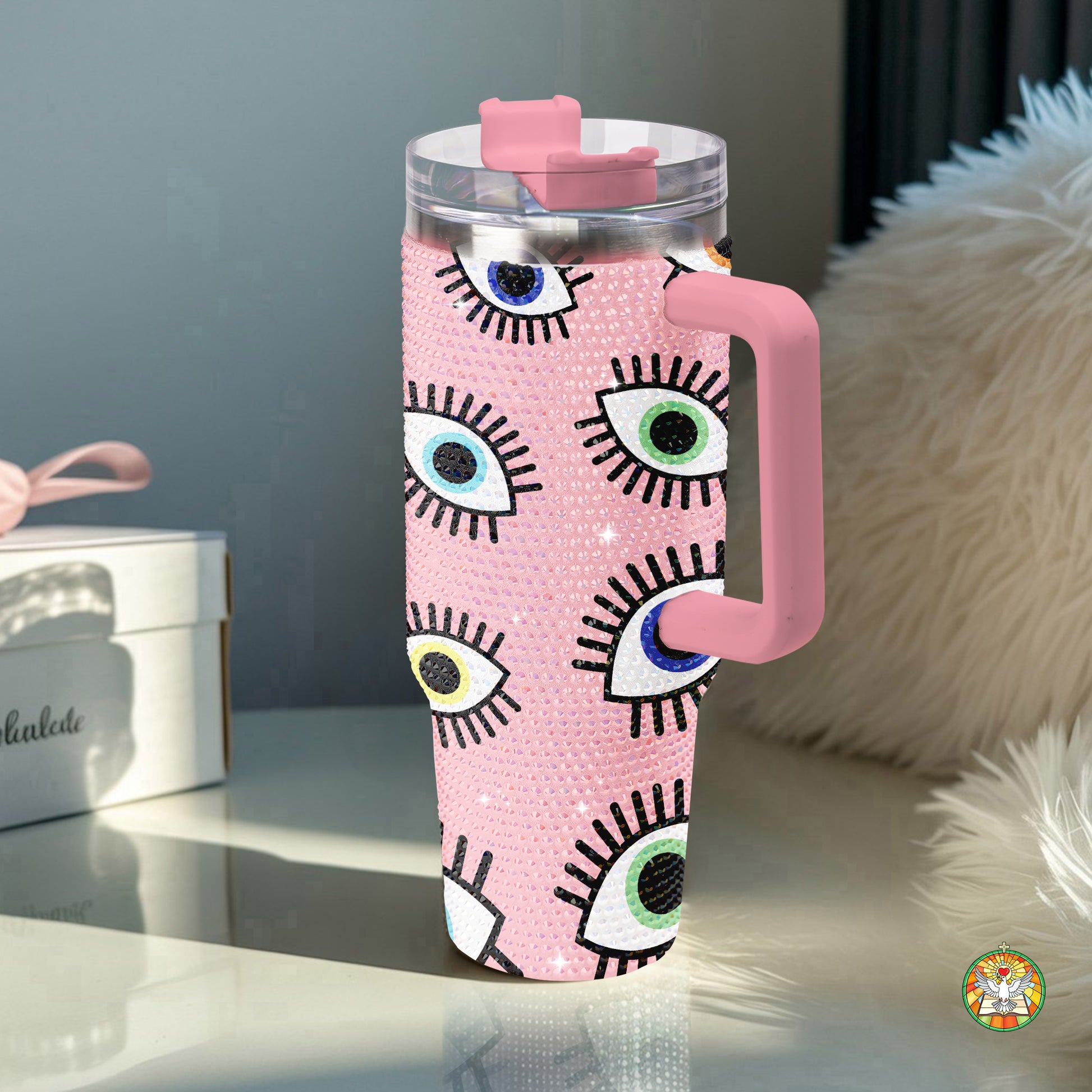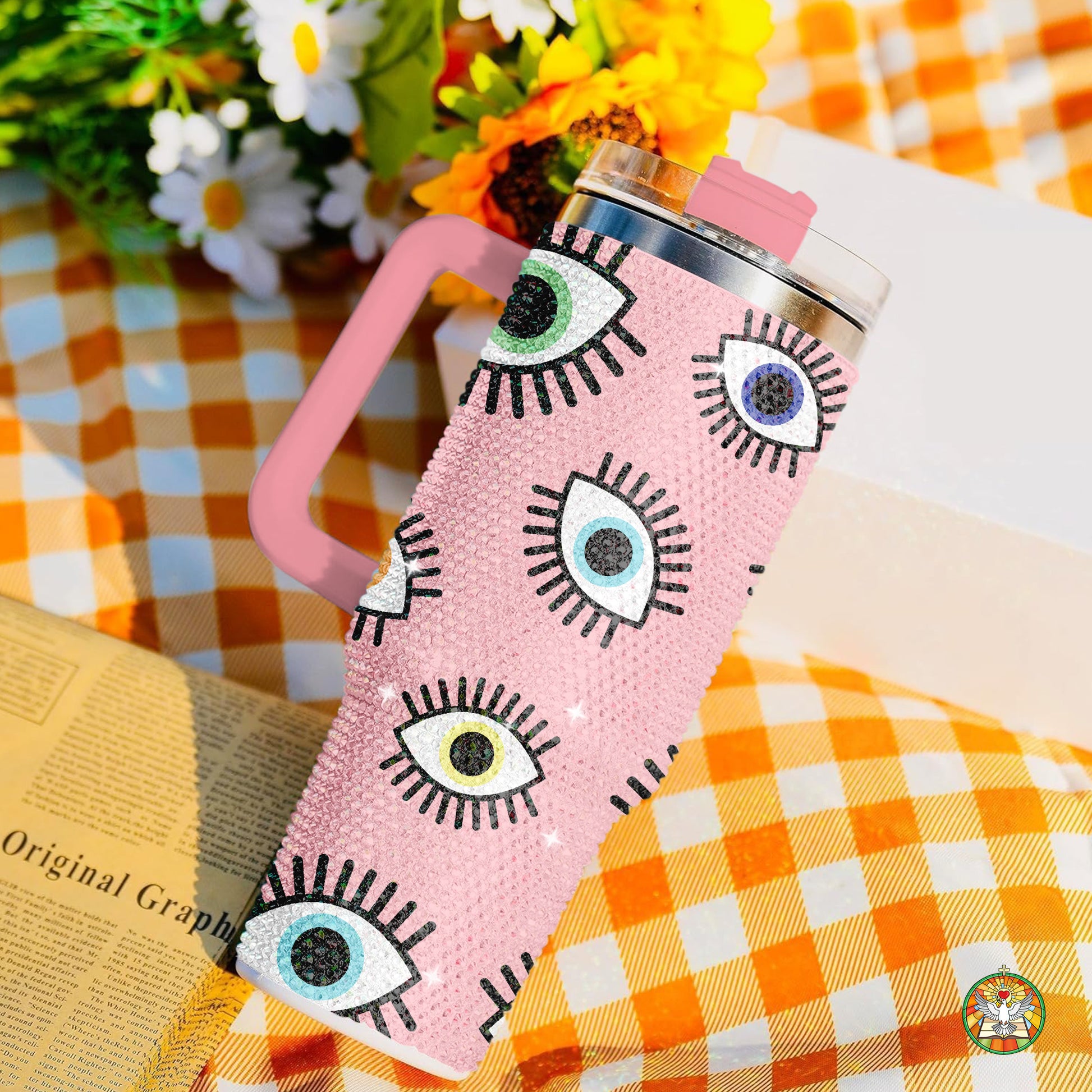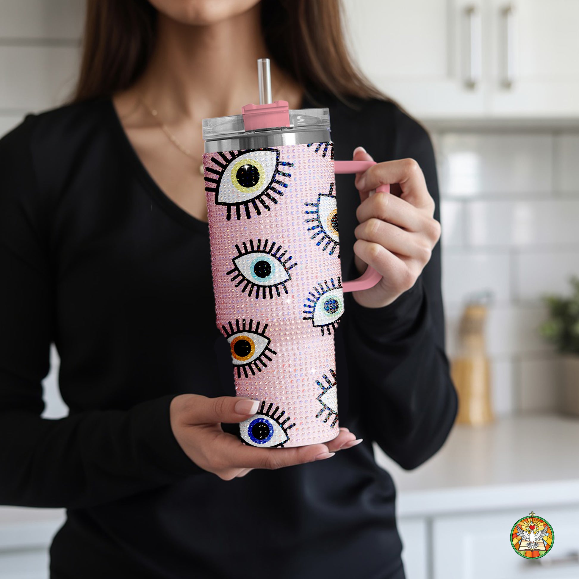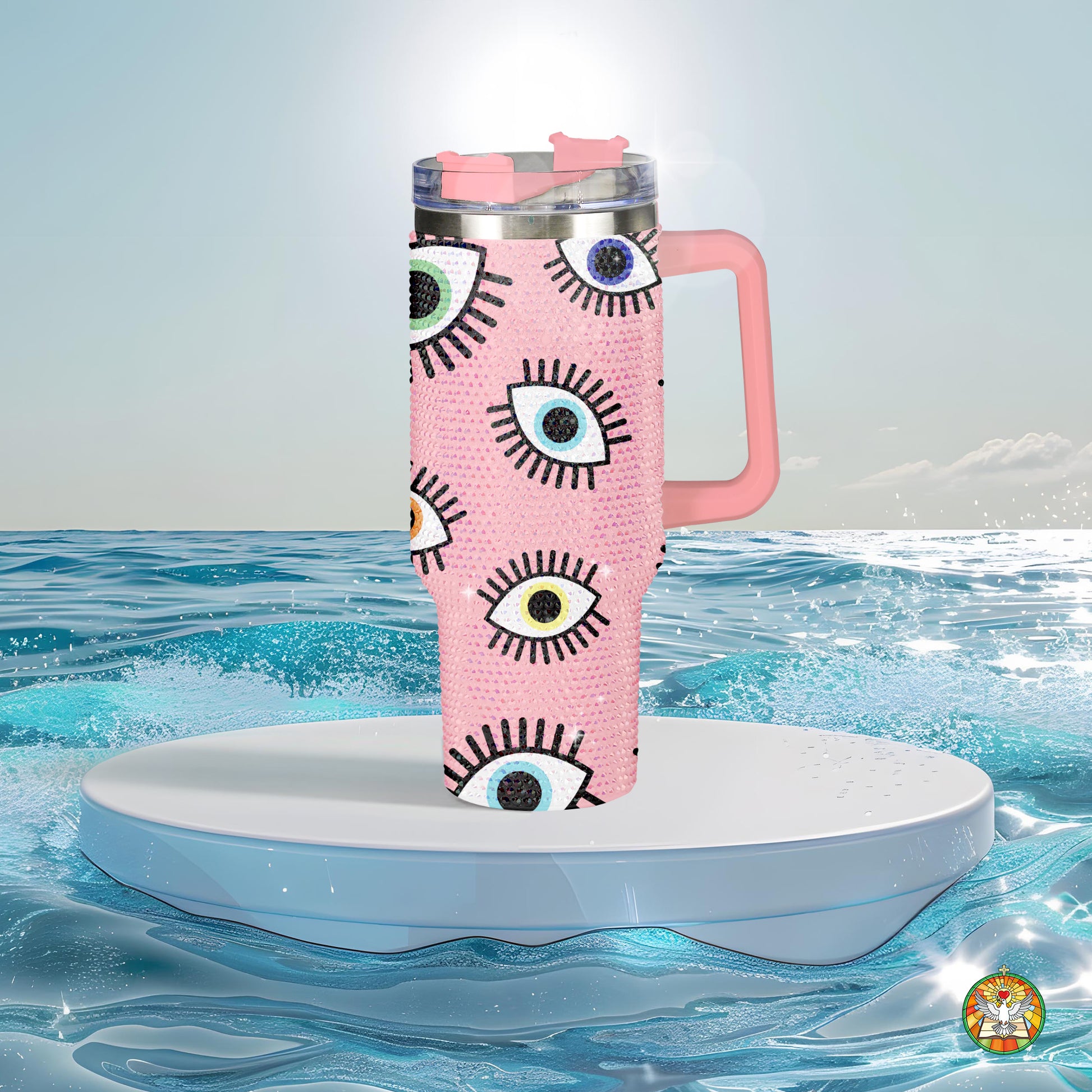 Featuring beautiful evil eye designs in vibrant colors against a stunning pink rhinestone background, this 40oz tumbler captures the ancient wisdom and protective power that evil eye symbols represent. Each crystal sparkles like protective magic, creating a mesmerizing effect that embodies the mystical beauty of spiritual protection. Whether you're enjoying hot tea during meditation sessions or iced drinks during spiritual gatherings, this tumbler brings protective energy to every moment.