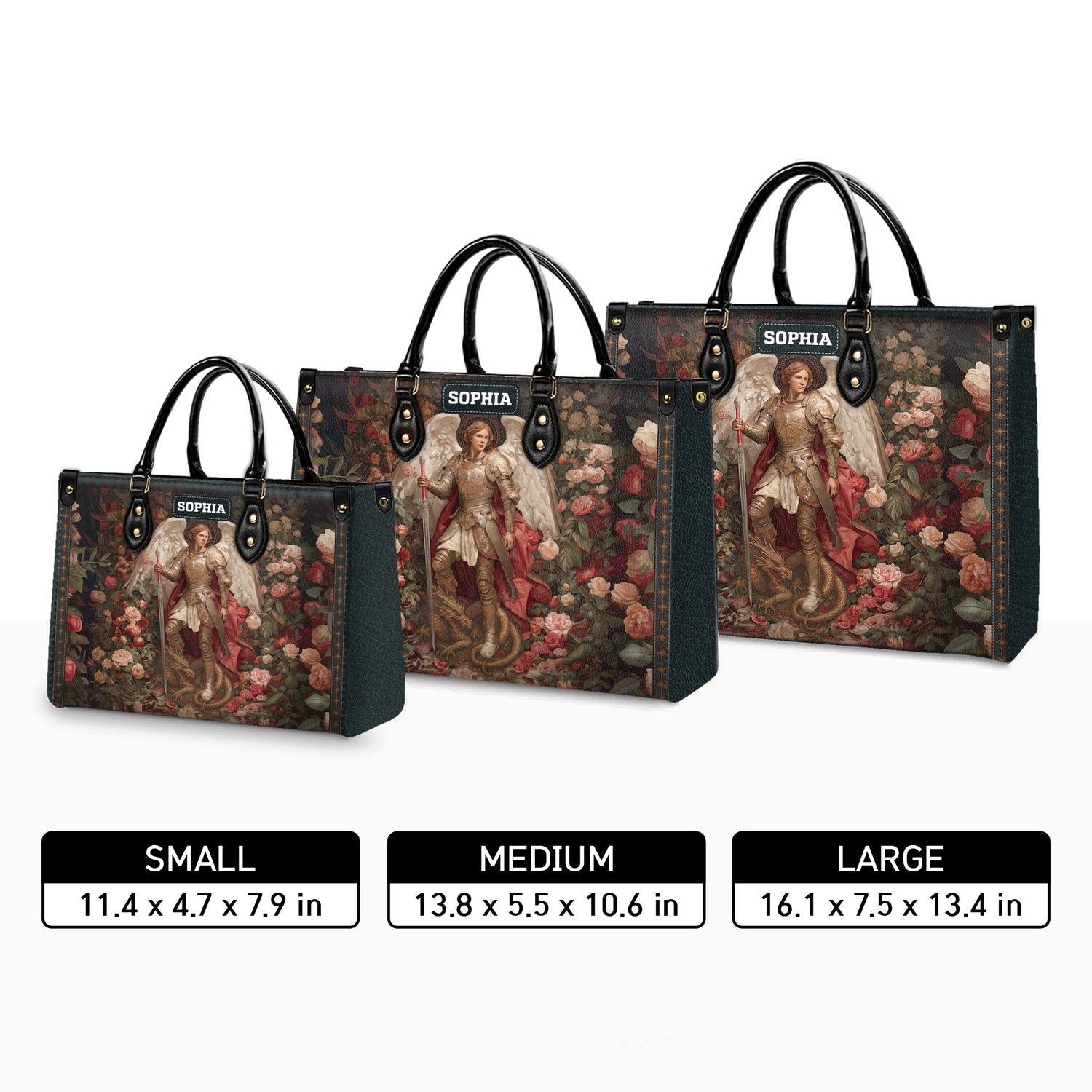 Carry your protection with heavenly strength with our "St. Michael The Archangel" Personalized Leather Handbag. This exquisite devotional accessory beautifully combines spiritual warfare with classical artistry, featuring the magnificent Prince of the Heavenly Host in golden armor with majestic wings, wielding his sword of justice over the defeated serpent, all surrounded by a garden of roses that symbolizes divine victory and beauty triumphing over evil. Perfect for the faithful woman who seeks spiritual protection while maintaining artistic elegance, this handcrafted handbag serves as both a daily companion and a meaningful reminder of St. Michael's powerful intercession and the ancient prayer: "St. Michael the Archangel, defend us in battle, be our protection against the wickedness and snares of the devil."