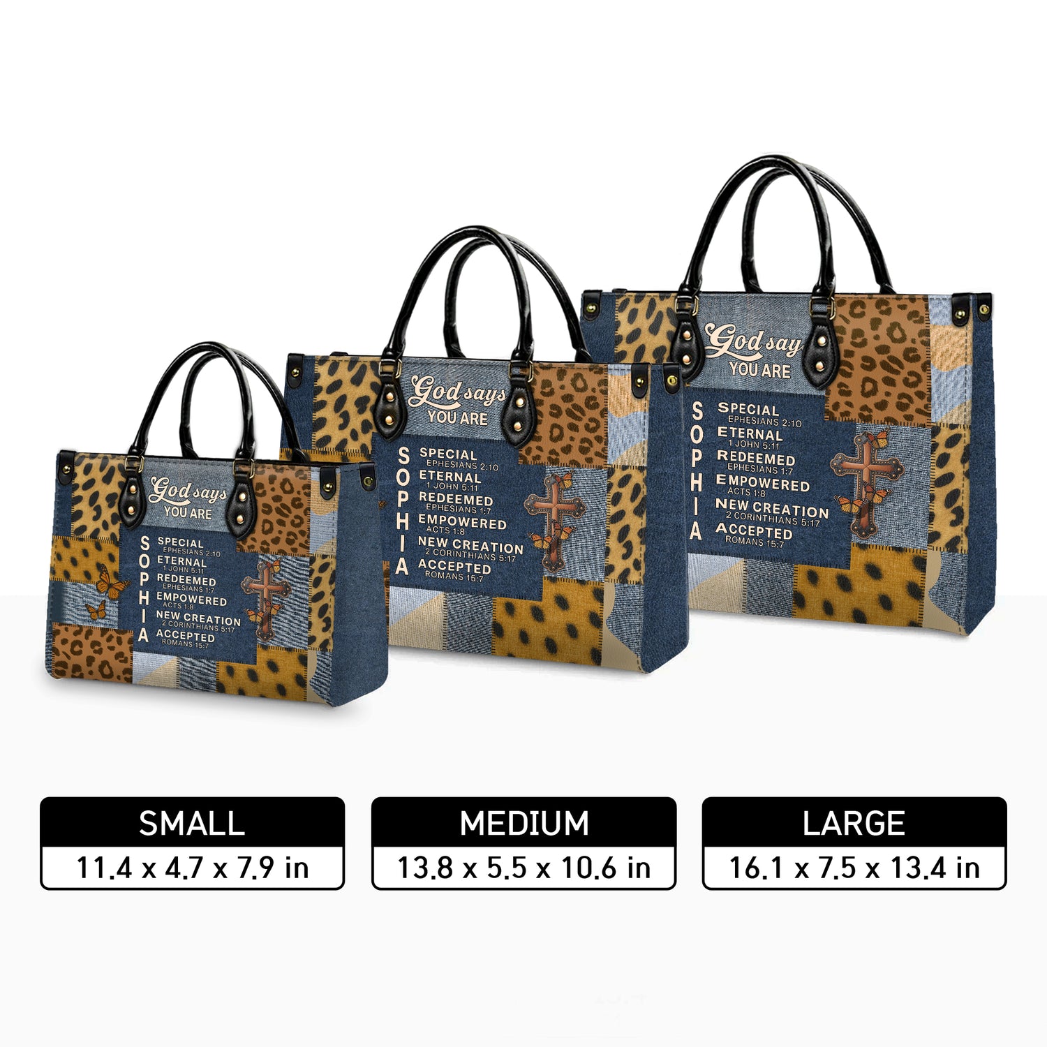 Carry your identity with divine affirmation with our "God Says You Are" Personalized Leather Handbag. This exquisite scripture-inspired accessory beautifully combines biblical truth with contemporary style, featuring a trendy patchwork of denim and leopard print adorned with monarch butterflies and a decorative cross, showcasing the powerful SOPHIA acrostic that reminds you daily of who God says you are - Special (Ephesians 2:10), Eternal (1 John 5:11), Redeemed (Ephesians 1:7), Empowered (Acts 1:8), New creation (2 Corinthians 5:17), and Accepted (Romans 15:7). Perfect for the faithful woman who embraces her God-given identity while maintaining fashion-forward style, this handcrafted handbag serves as both a daily companion and a meaningful reminder that your true worth comes not from the world, but from who your Creator says you are.