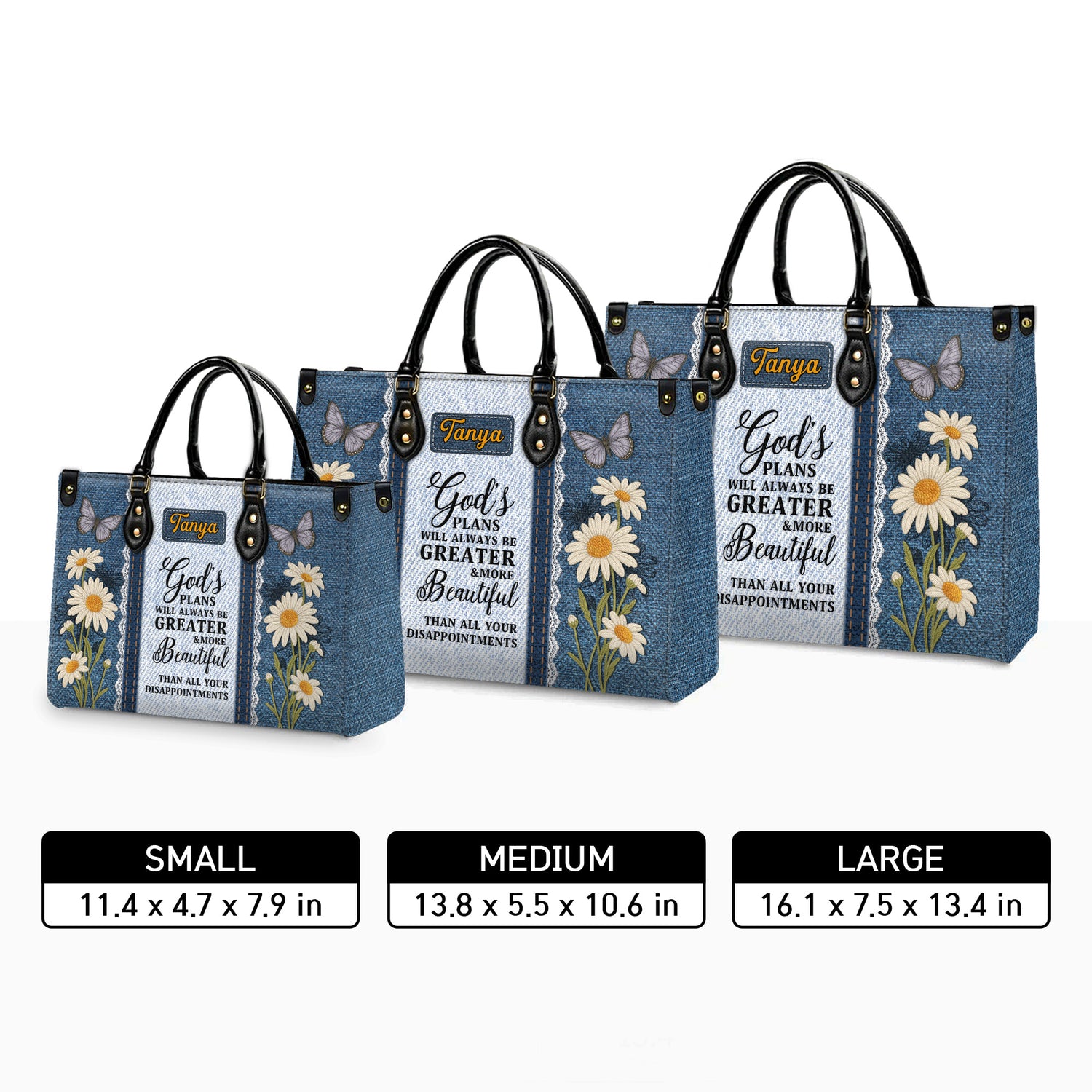 Carry your hope with divine assurance with our "God's Plans Will Always Be Greater" Personalized Leather Handbag. This exquisite hope-inspired accessory beautifully combines trust in God's timing with casual elegance, featuring cheerful white daisies and delicate butterflies against a classic denim background with white lace trim that symbolizes the beauty that emerges from life's challenges. Perfect for the faithful woman who trusts God's greater plans while maintaining effortless style, this handcrafted handbag serves as both a daily companion and a meaningful reminder that even in disappointment, His plans are always greater and more beautiful than anything we could imagine.
