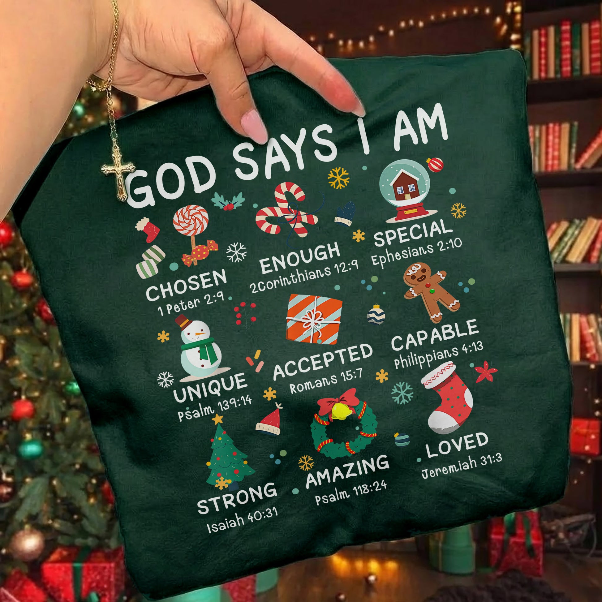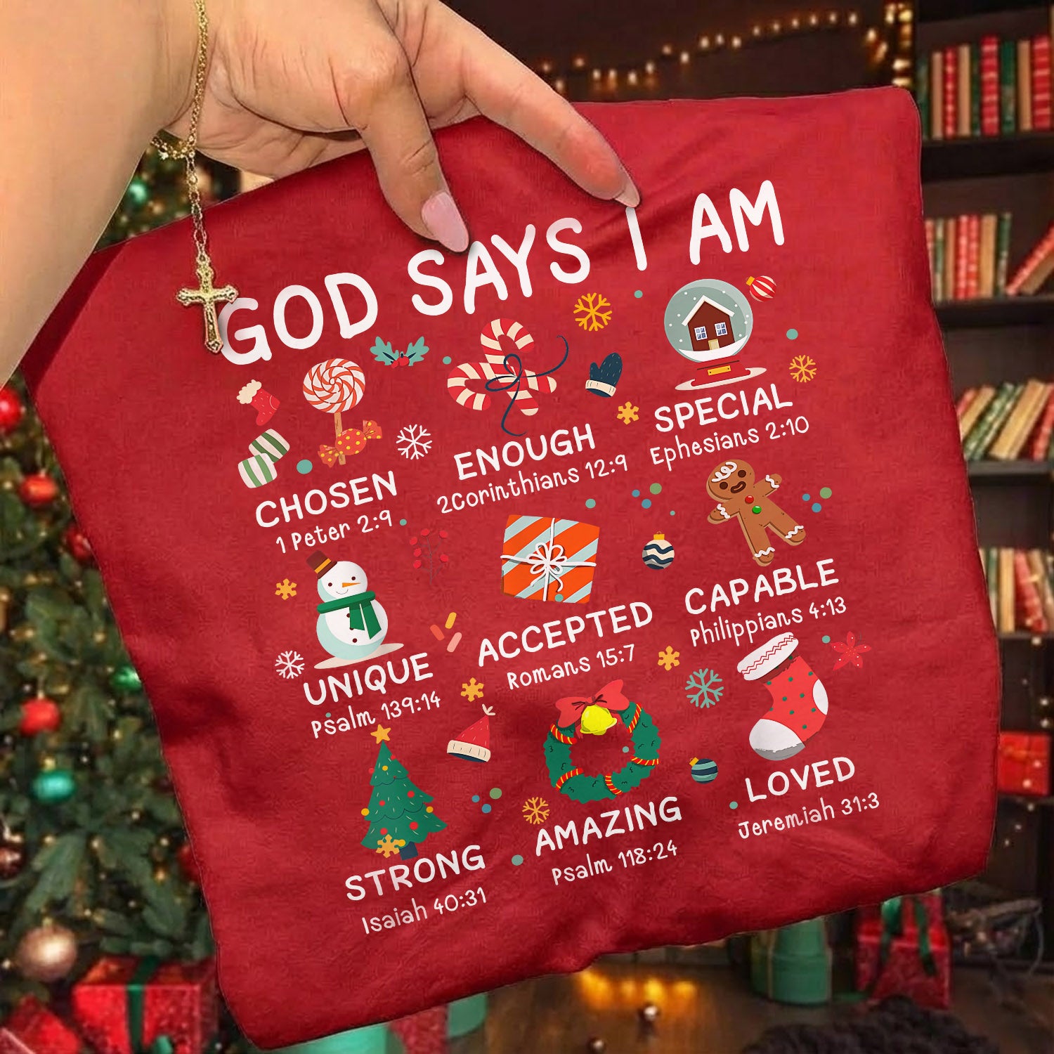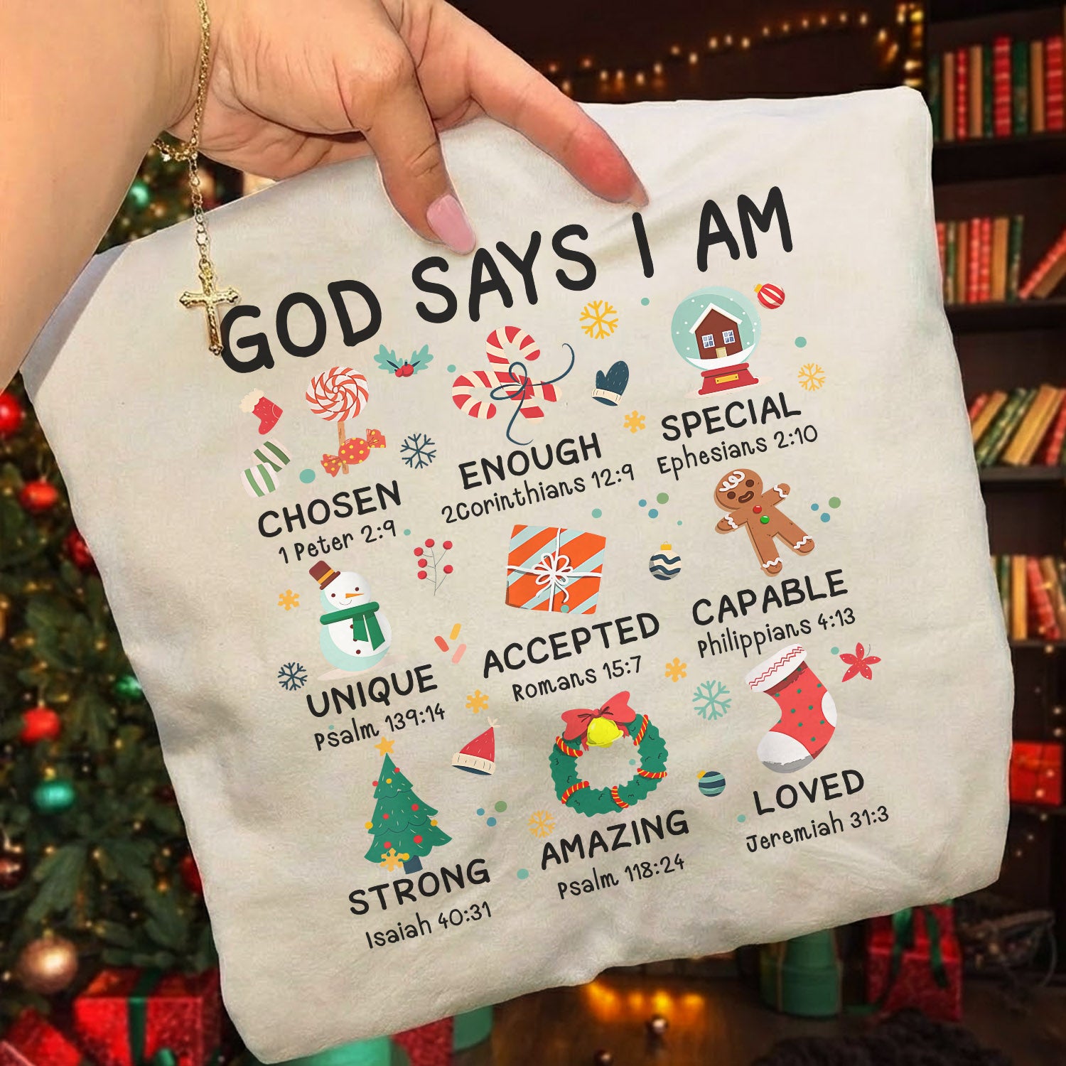 Featuring a festive snow globe and cute holiday icons paired with Bible affirmations—Strong, Unique, Accepted, Capable, Loyal—this design reminds you of who God says you are.