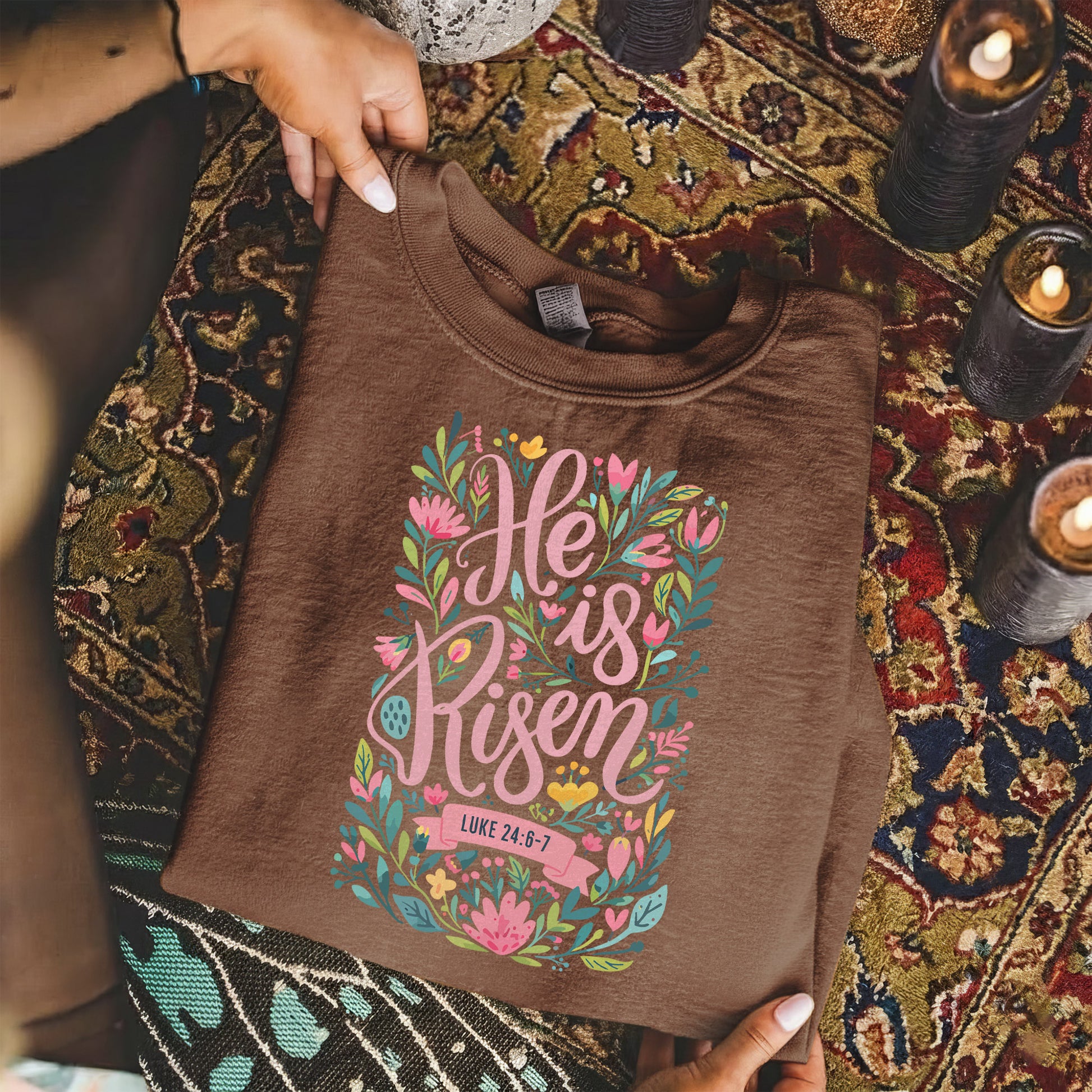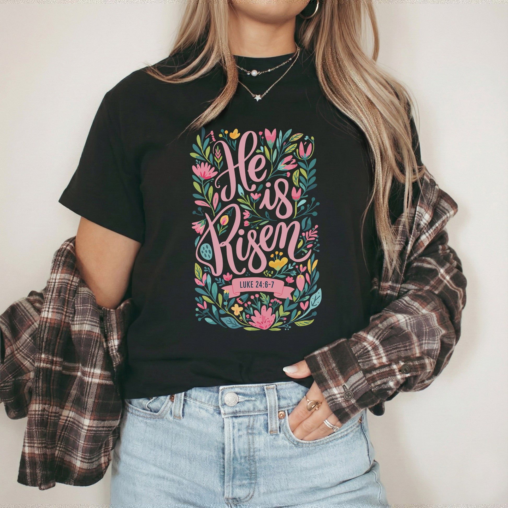 He Is Risen Luke 24:6-7 Floral Script – He is Risen – Unisex Tshirt / Hoodie / Sweatshirt