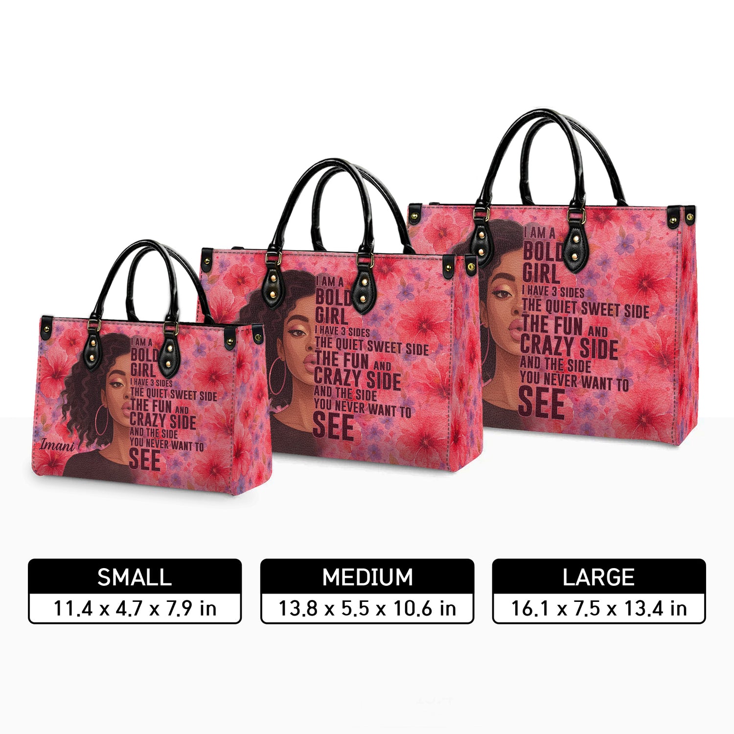 Carry your authenticity with unapologetic confidence with our "I Am A Bold Girl" Personalized Leather Handbag. This exquisite personality-inspired accessory beautifully combines feminine strength with vibrant energy, featuring a striking silhouette of a bold woman with natural curls and statement hoop earrings, surrounded by vivid pink hibiscus flowers against a warm coral background that symbolizes the multifaceted nature of a woman who embraces all her sides - the quiet sweet side, the fun and crazy side, and the side you never want to see. Perfect for the woman who owns her complexity while maintaining fierce style, this handcrafted handbag serves as both a daily companion and a powerful declaration that you contain multitudes and make no apologies for the fullness of who you are.
