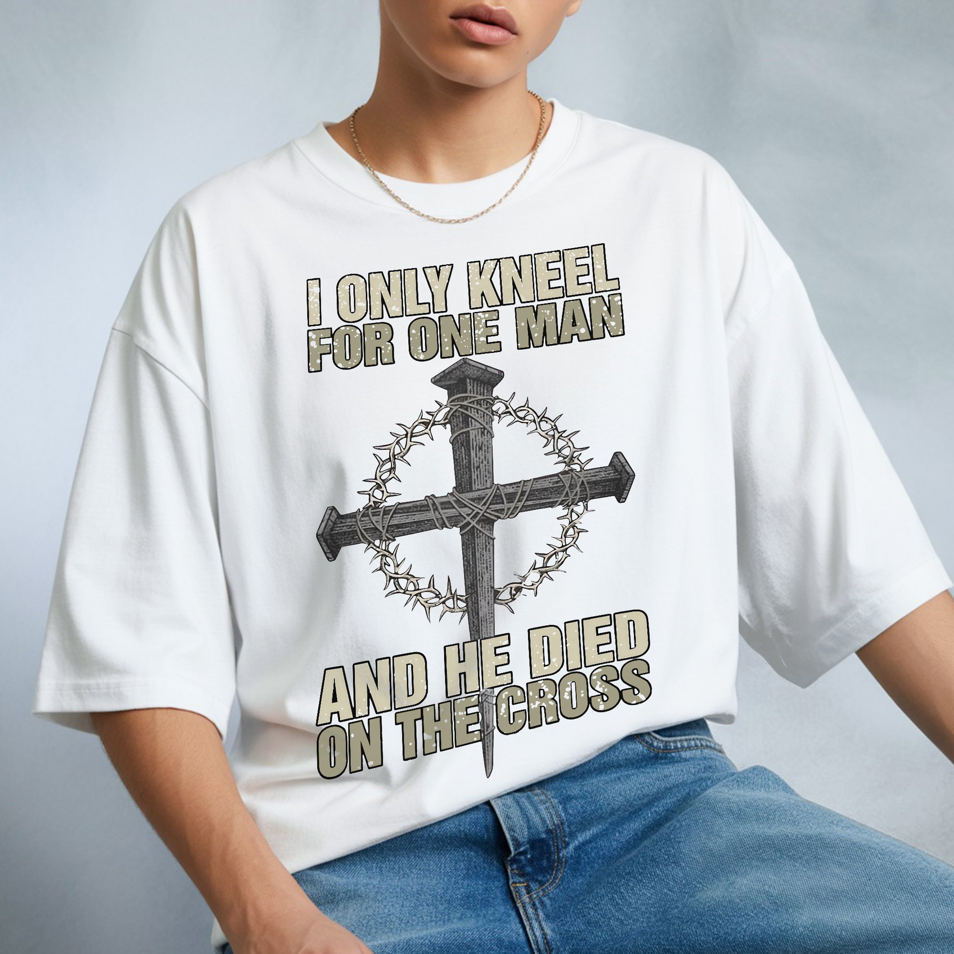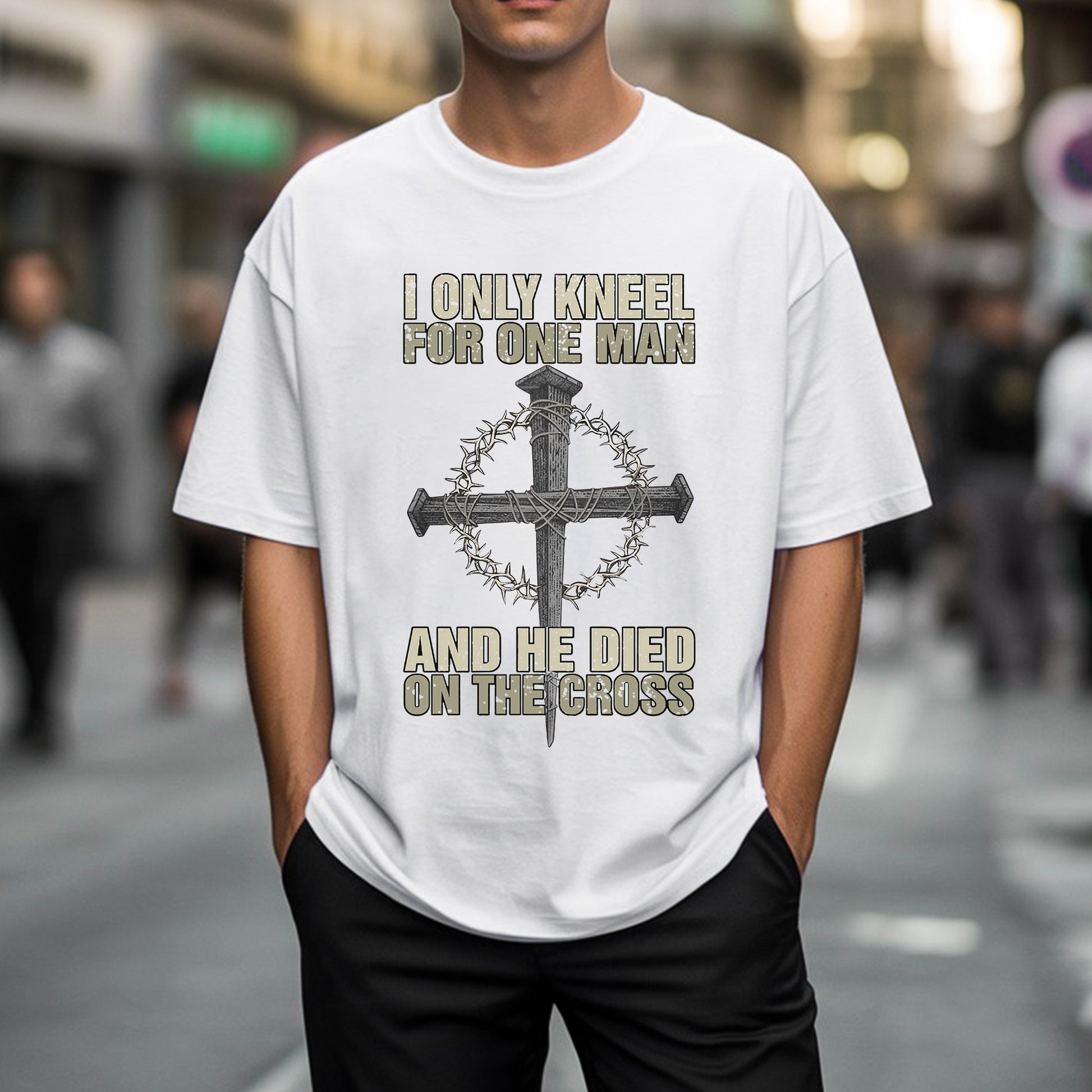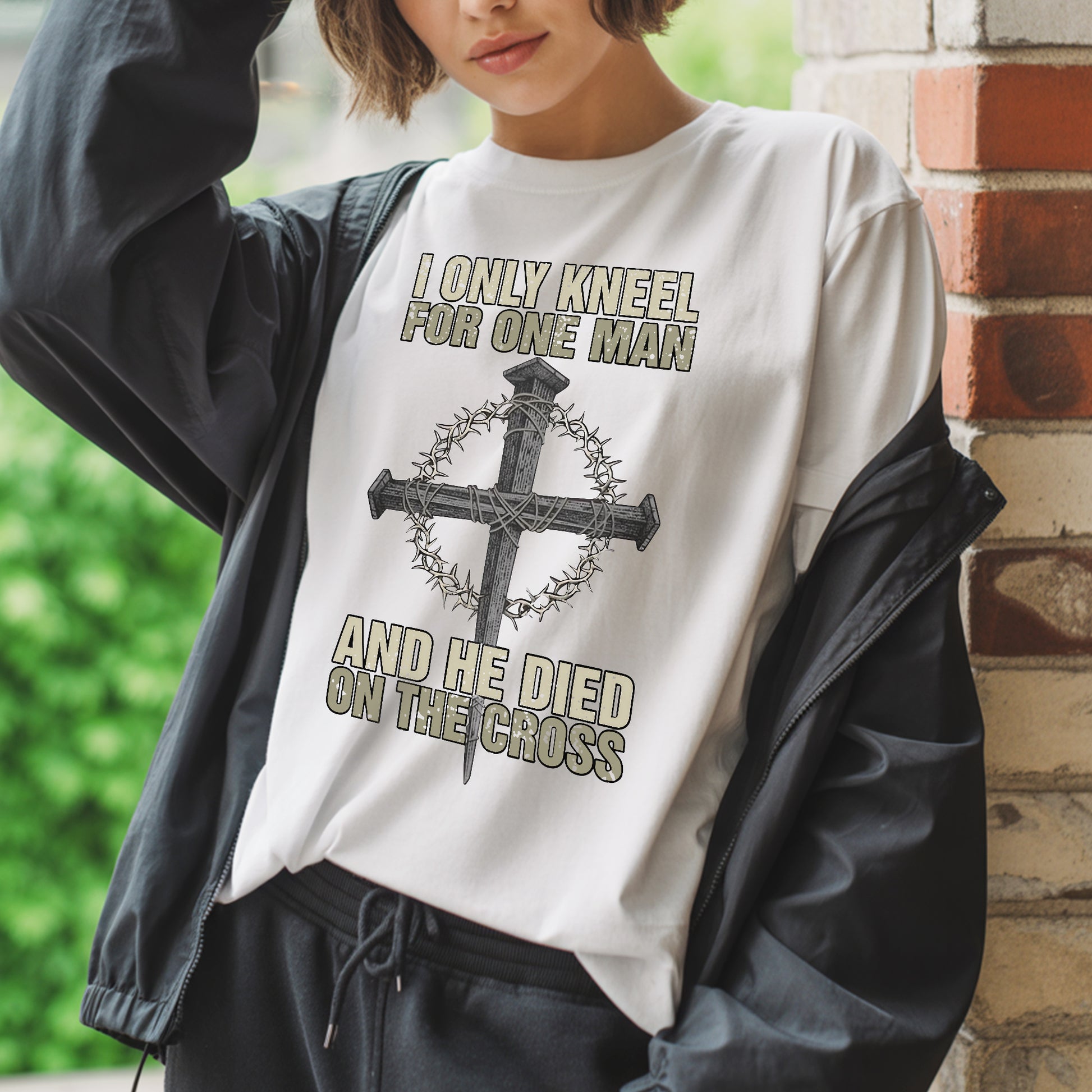 When the world demands you bow to false idols, when society pressures you to compromise your faith, when others expect you to kneel before earthly powers—there's one declaration that stands firm: I ONLY KNEEL FOR ONE MAN, AND HE DIED ON THE CROSS. Our faith declaration T-shirt carries the most powerful statement of allegiance, the words that have defined true worship for over 2,000 years.