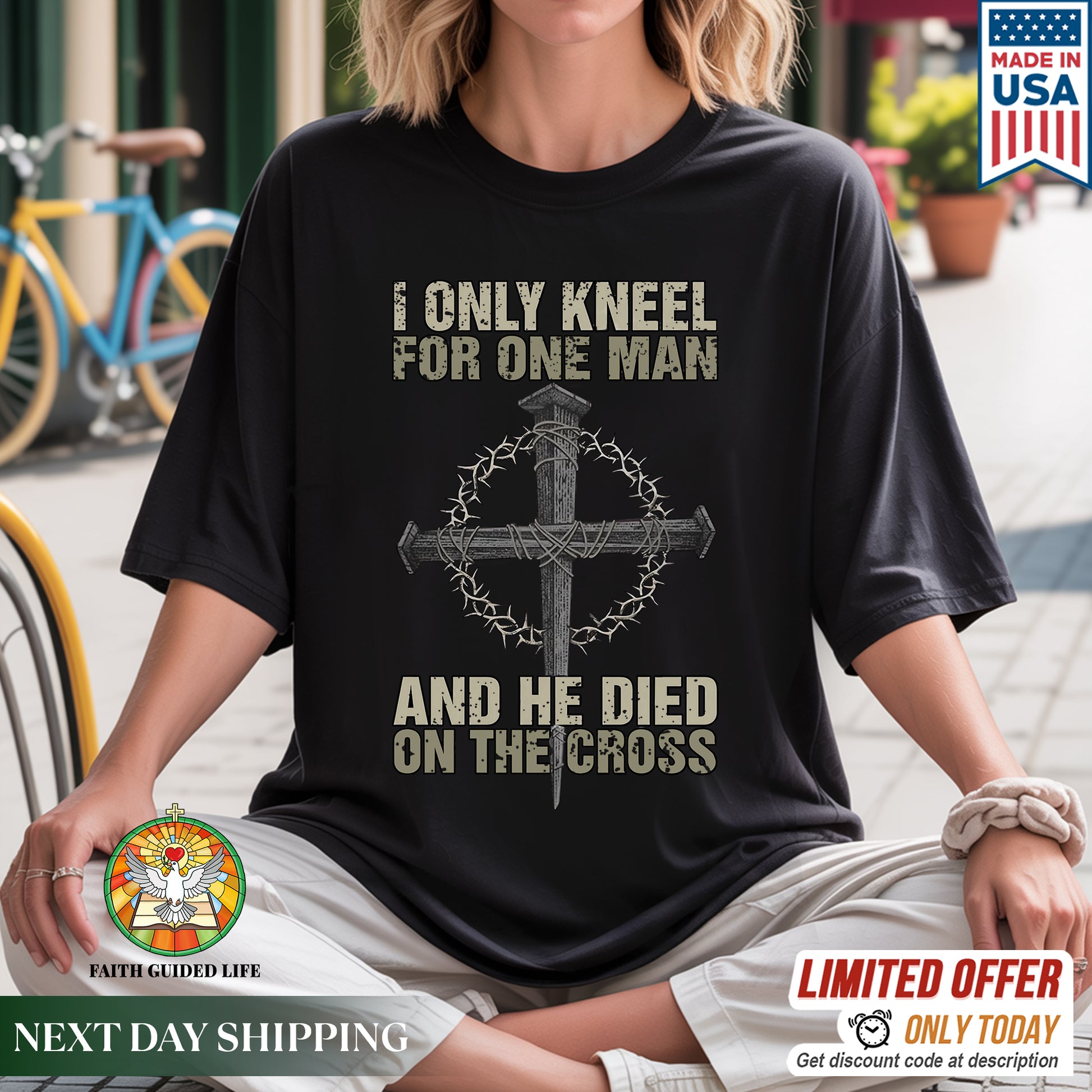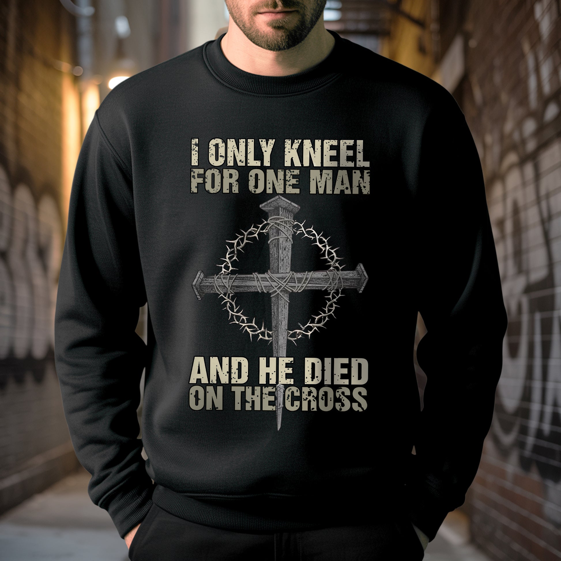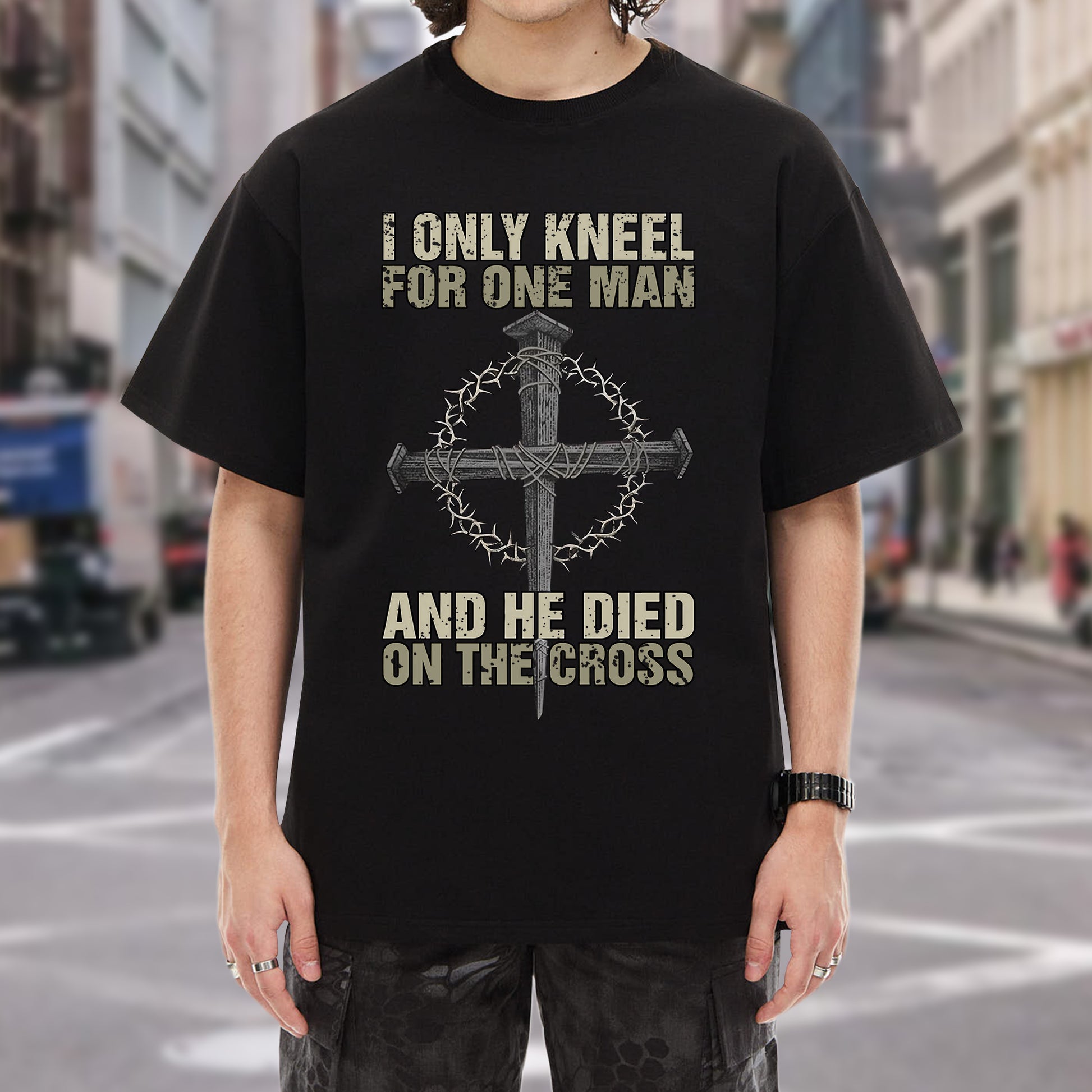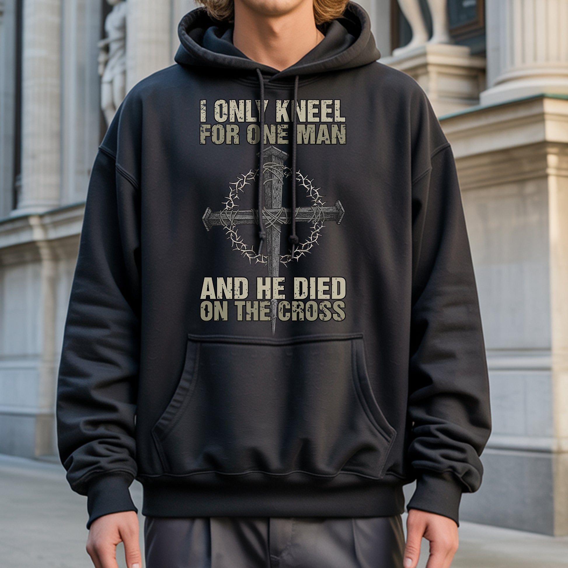 When the world demands you bow to false idols, when society pressures you to compromise your faith, when others expect you to kneel before earthly powers—there's one declaration that stands firm: I ONLY KNEEL FOR ONE MAN, AND HE DIED ON THE CROSS. Our faith declaration T-shirt carries the most powerful statement of allegiance, the words that have defined true worship for over 2,000 years.
