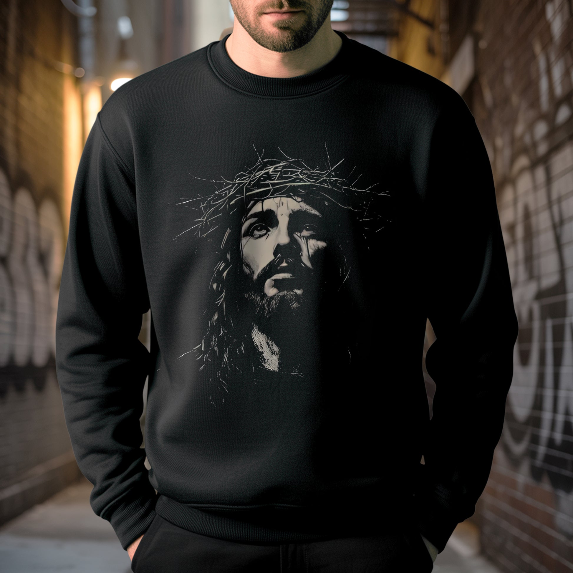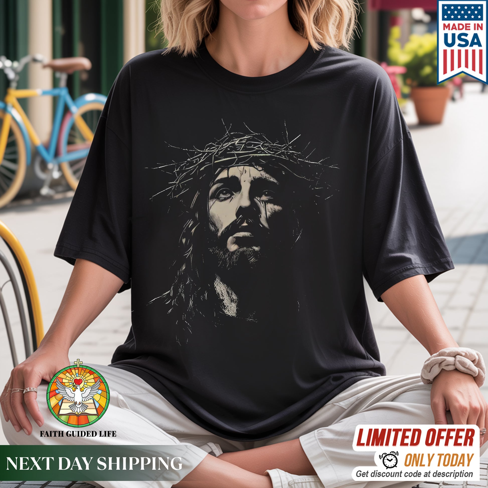 This isn't just religious art—it's the visual representation of the greatest love story ever told. When you wear this shirt, you carry the reminder that Jesus' suffering wasn't the end of the story, but the beginning of your redemption.