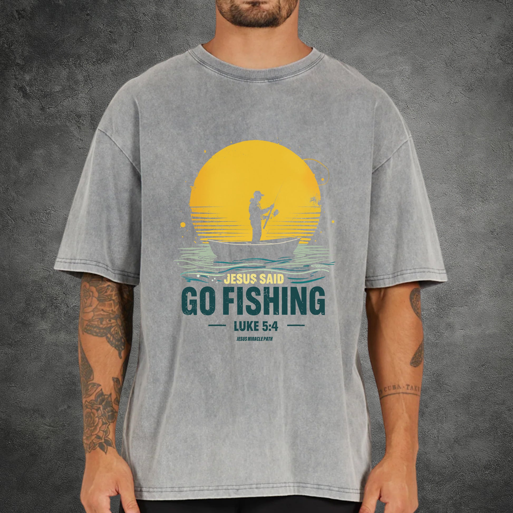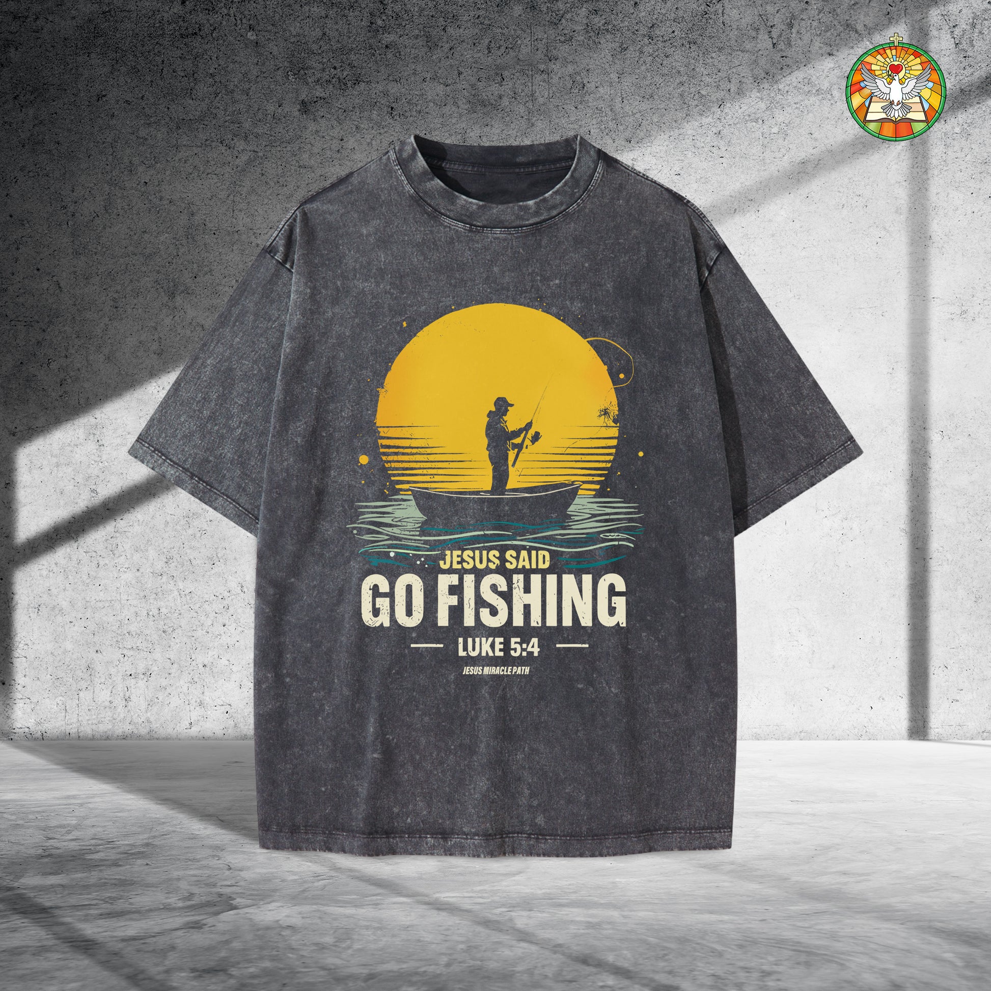 Cast your nets into deeper waters of faith with our "Jesus Said Go Fishing" Washed T-Shirt that beautifully combines the love of fishing with powerful biblical truth! This premium 100% cotton tee features a perfectly aged black wash finish and showcases a stunning sunset silhouette of a fisherman casting his line from a boat, set against a gorgeous golden sun that reflects on peaceful blue waters, representing the miraculous catch that followed Jesus's instruction in Luke 5:4. The design captures the moment when Jesus told Simon Peter to "put out into deep water, and let down the nets for a catch," leading to the miracle that would change the disciples' lives forever and transform them from fishermen of fish to fishers of men. The soft, breathable 100% cotton construction combined with the vintage washed finish creates that authentic lived-in comfort perfect for fishing trips, church events, or everyday wear that sparks conversations about faith and following Jesus's calling. Perfect for the Christian man or woman who loves fishing and finds spiritual parallels in the sport, appreciates biblical stories about Jesus and the disciples, or wants to share the message that sometimes God calls us to cast our nets in deeper waters of faith and trust His miraculous provision, this comfortable washed tee serves as both a celebration of fishing passion and a powerful reminder that when Jesus says "go fishing," He's not just talking about catching fish – He's calling us to follow Him on the miracle path where ordinary obedience leads to extraordinary blessings and life-changing encounters with the divine.