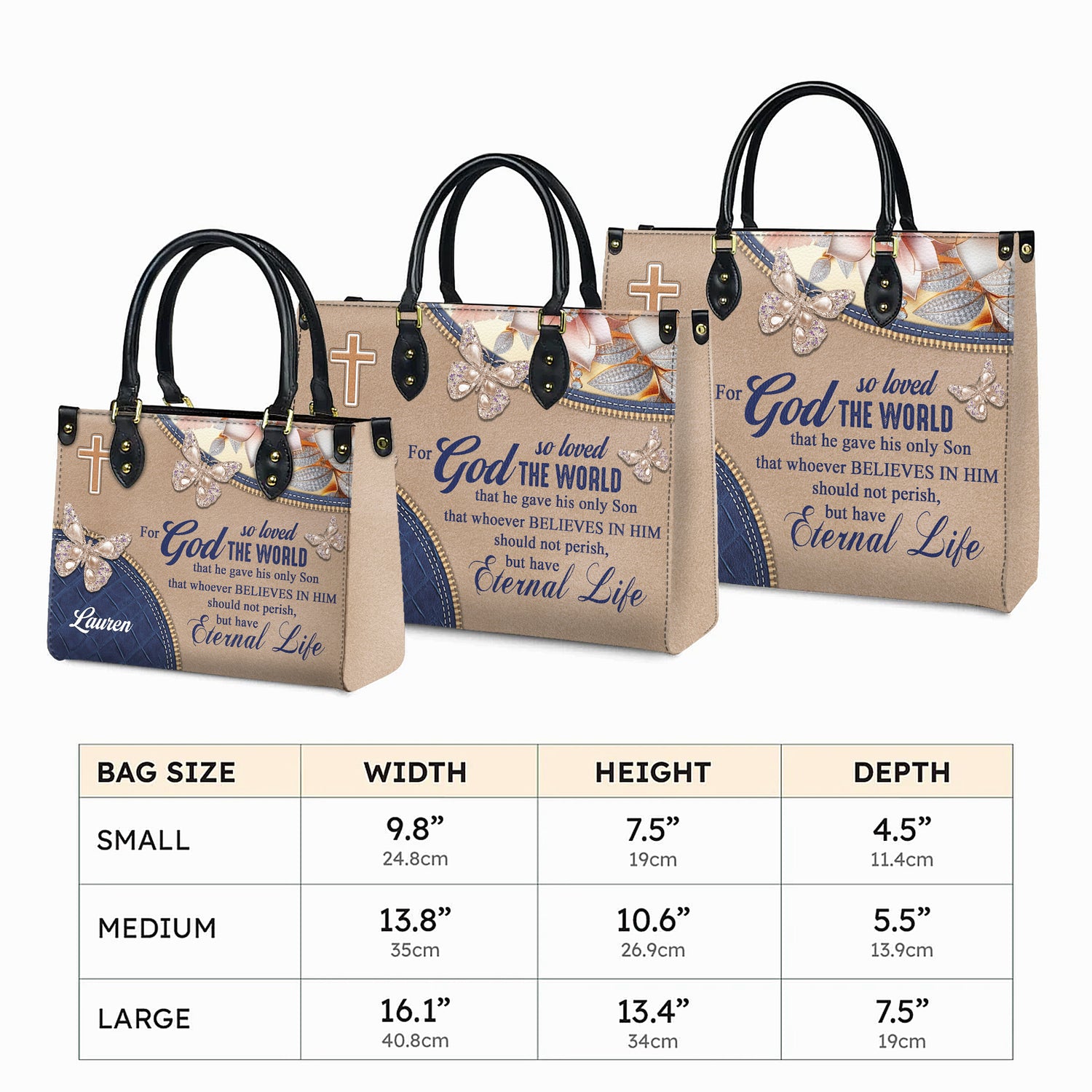 Carry the greatest love story ever told with our "For God So Loved The World" Personalized Leather Handbag featuring the most beloved scripture in Christianity, John 3:16. This breathtaking masterpiece combines elegant beige and navy denim-inspired textures with sparkling butterfly embellishments adorned with pearls, creating a sophisticated design that reflects both earthly beauty and heavenly promise. The golden cross serves as a powerful reminder of the ultimate sacrifice made for our salvation, while the complete verse speaks to the incredible depth of God's love that moved Him to give His only Son so that whoever believes in Him should not perish but have eternal life. Perfect for the faithful woman who wants to share the gospel message wherever she goes, celebrate the foundation of her faith, and carry a daily reminder that she is deeply loved by the Creator of the universe, this handcrafted leather handbag serves as both a stunning accessory and a beautiful testimony to the transformative power of God's love – a love so profound that it bridged the gap between heaven and earth, so generous that it offered the ultimate gift, and so eternal that it promises life everlasting to all who believe in the precious name of Jesus Christ.