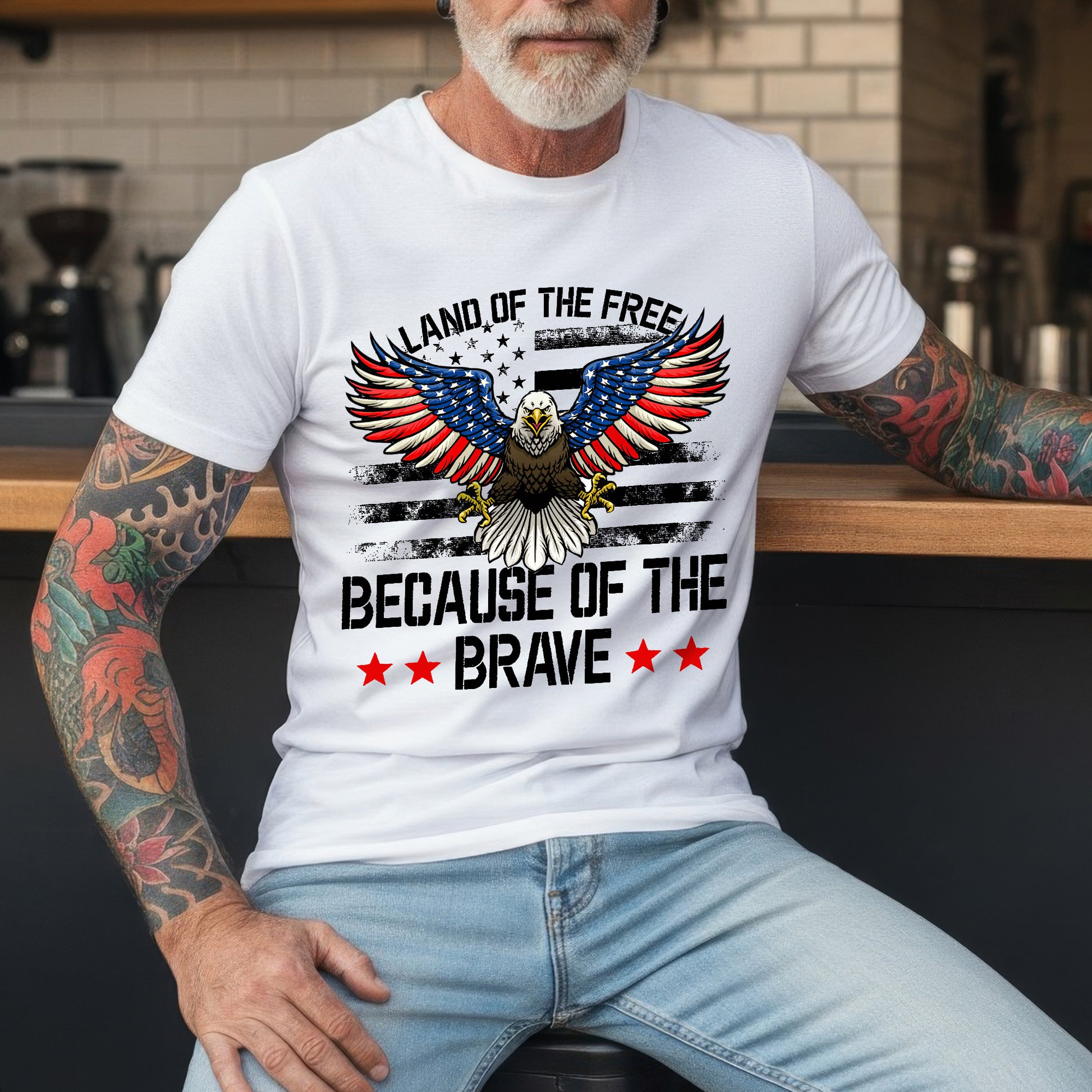 Show your American pride with this bold tshirt featuring a powerful bald eagle, stars and stripes wings, and the patriotic message "Land of the Free Because of the Brave." Perfect for veterans, military supporters, and anyone who loves the USA, this shirt celebrates freedom and honors the brave heroes who protect it. Ideal for Independence Day, Veterans Day, Memorial Day, or everyday wear to keep the spirit of freedom alive.