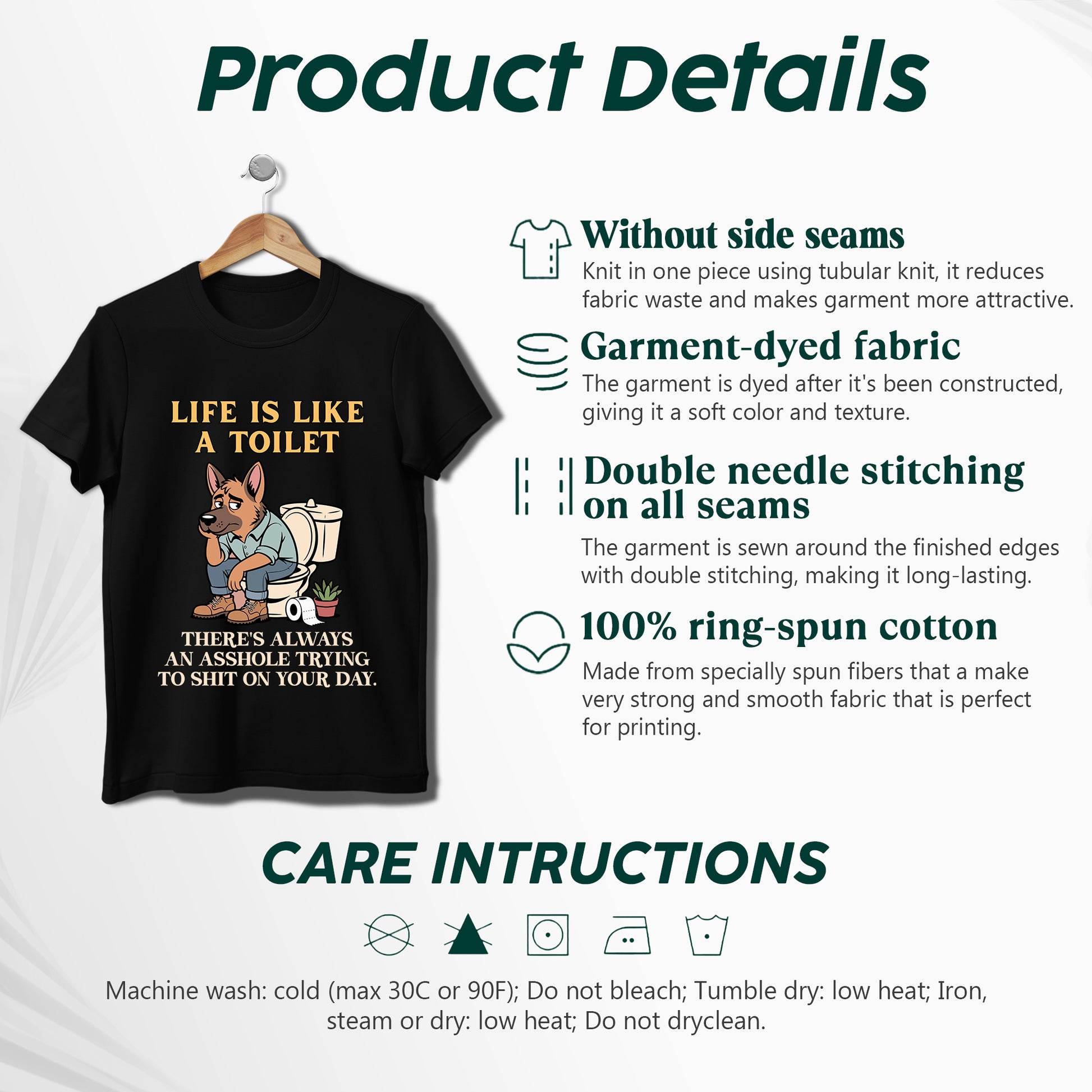Embrace life's harsh realities with dark humor wearing our brutally honest "Life Is Like A Toilet" T-Shirt that perfectly captures the frustrating truth about dealing with difficult people! This hilariously crude design features an adorable dog sitting on a toilet, casually sipping coffee while delivering one of the most relatable life observations ever made - that there's always someone trying to ruin your day, just like there's always someone trying to mess with your peace. The clever toilet metaphor combined with the unexpected sight of a dog in this very human situation creates a perfect storm of absurd humor that speaks to anyone who's ever had their good mood destroyed by someone else's negativity. Made from premium soft cotton that's more comfortable than dealing with actual assholes, this tee is perfect for people who appreciate dark humor, aren't easily offended by crude language, or simply want to wear their cynical worldview with pride. Perfect for the woman who's tired of pretending life is all sunshine and rainbows, loves humor that's as raw and unfiltered as her morning coffee, or wants to bond with fellow humans who understand that sometimes the best way to deal with life's bullshit is to laugh about it while sitting on an actual toilet, this unapologetically honest tee serves as both a conversation starter and a warning that you're not here for anyone's drama – because when life feels like a toilet, sometimes the only thing you can do is grab your coffee, sit down, and wait for the assholes to finish their business so you can get back to enjoying your day in peace.