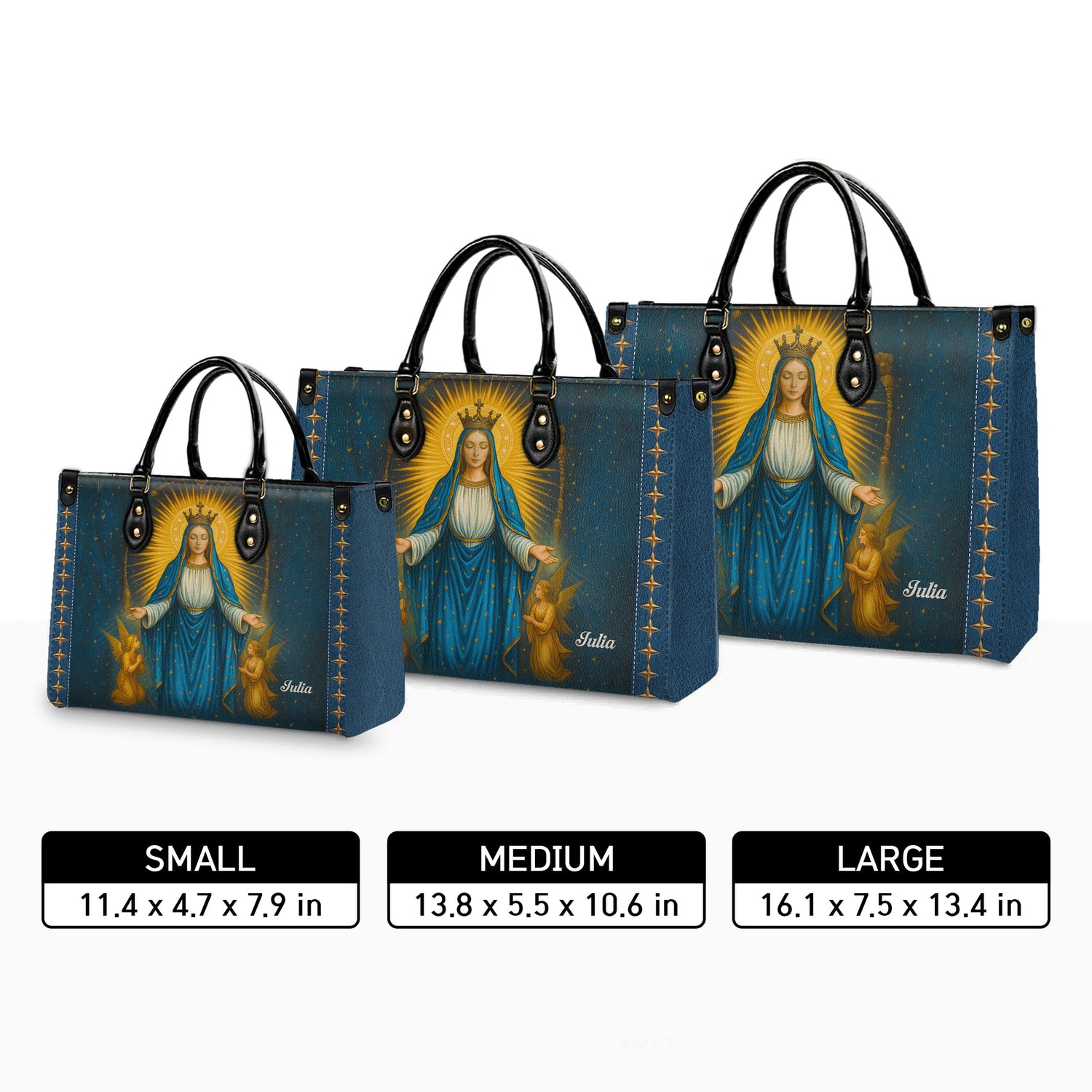 Carry your devotion with celestial grace with our "Miraculous Medal Blessed Virgin Mary" Personalized Leather Handbag. This exquisite devotional accessory beautifully combines sacred Catholic tradition with heavenly artistry, featuring the iconic image of Our Lady of Grace with outstretched arms, crowned and radiant, surrounded by golden rays and adoring angels against a deep blue starry background that symbolizes Mary's queenship over heaven and earth. Perfect for the faithful woman who cherishes Marian devotion while maintaining reverent style, this handcrafted handbag serves as both a daily companion and a meaningful reminder of the Blessed Mother's promise: "All who wear it will receive great graces" - now carried in a beautiful form that honors her Immaculate Conception.