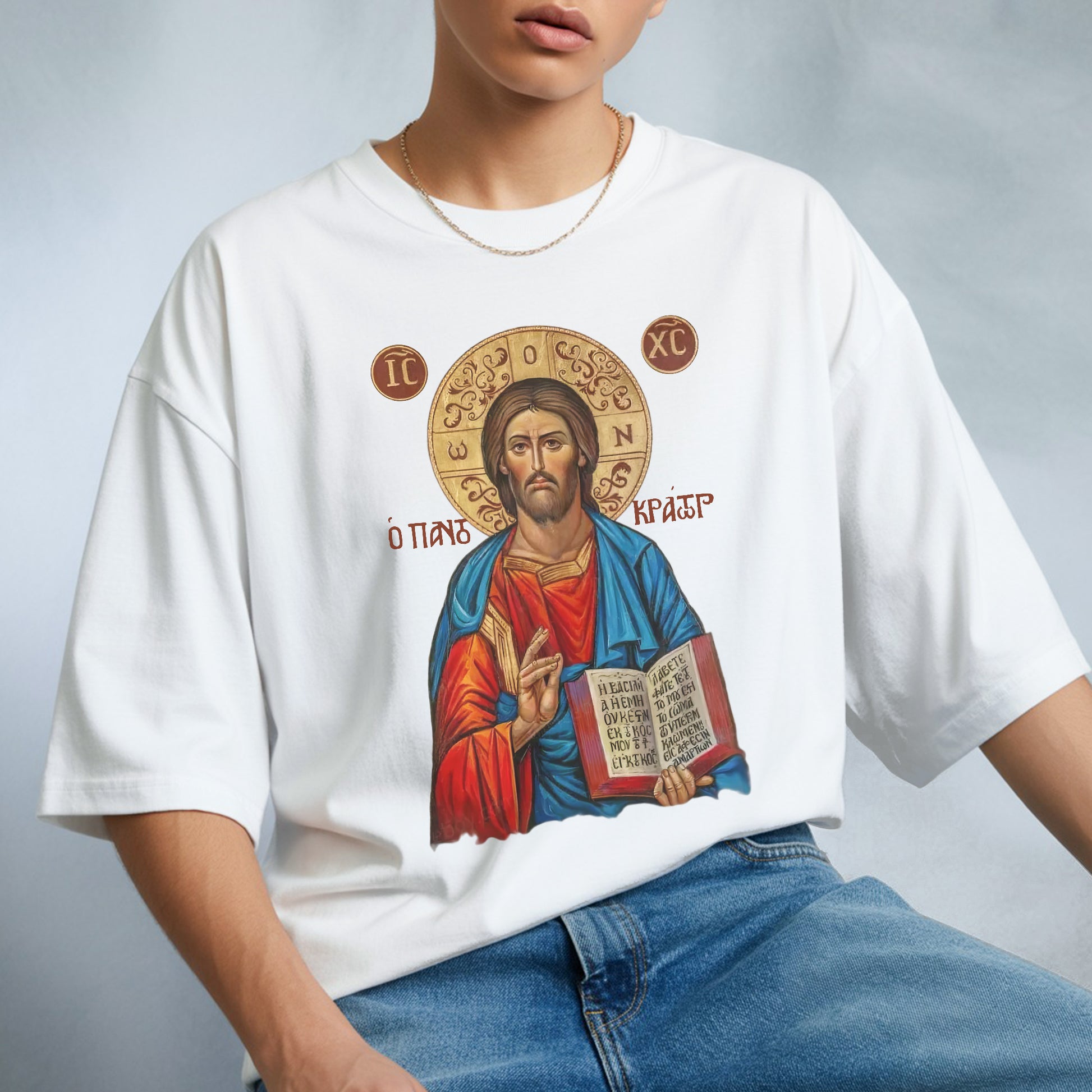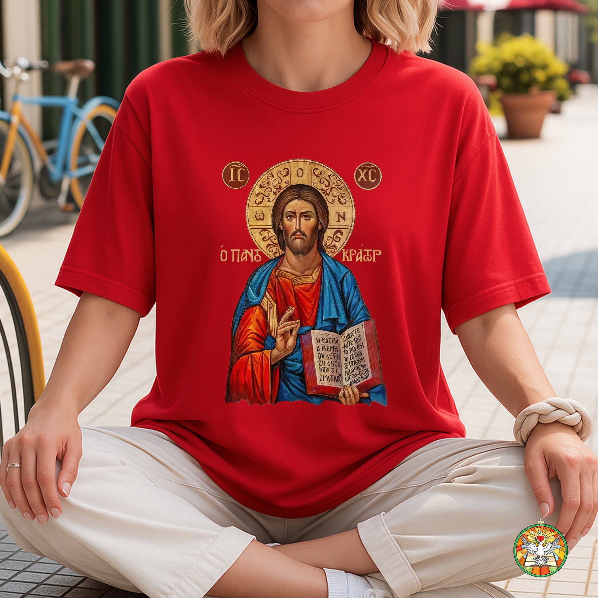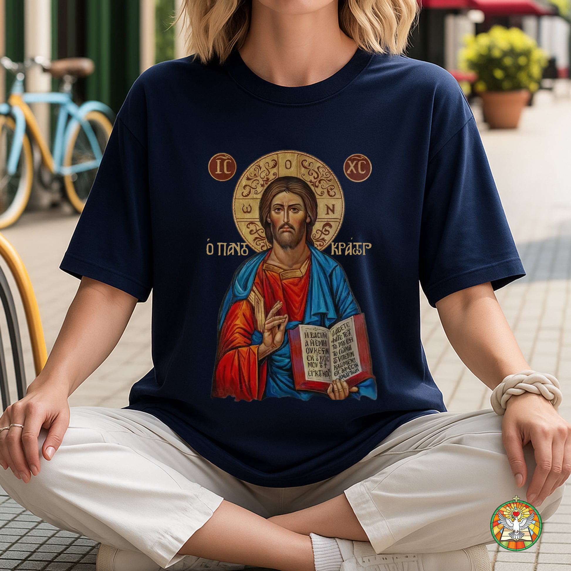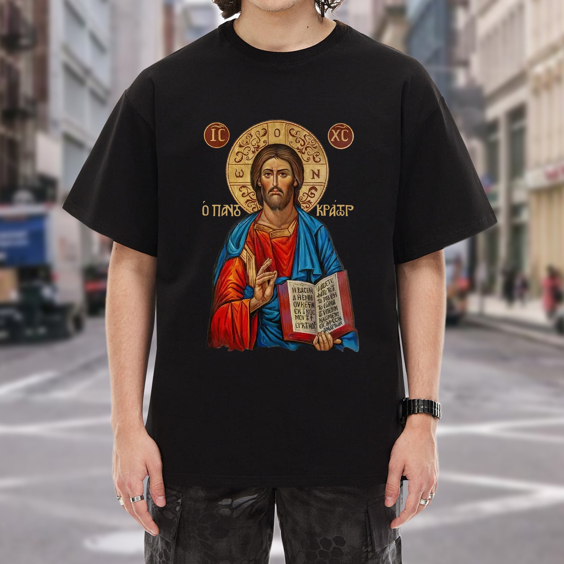 Inspired by the ancient Orthodox tradition of iconography combined with the sacred Cyrillic script that has preserved Scripture and liturgy for generations, this tee serves as a daily reminder that in a world of changing languages and forgotten traditions, there is eternal beauty in the Orthodox faith expressed through its original sacred language. When Saints Cyril and Methodius created the Cyrillic alphabet, when Orthodox monks illuminated manuscripts, when Slavic believers sought to honor Christ through their native script, they gave us this timeless fusion of image and sacred text.