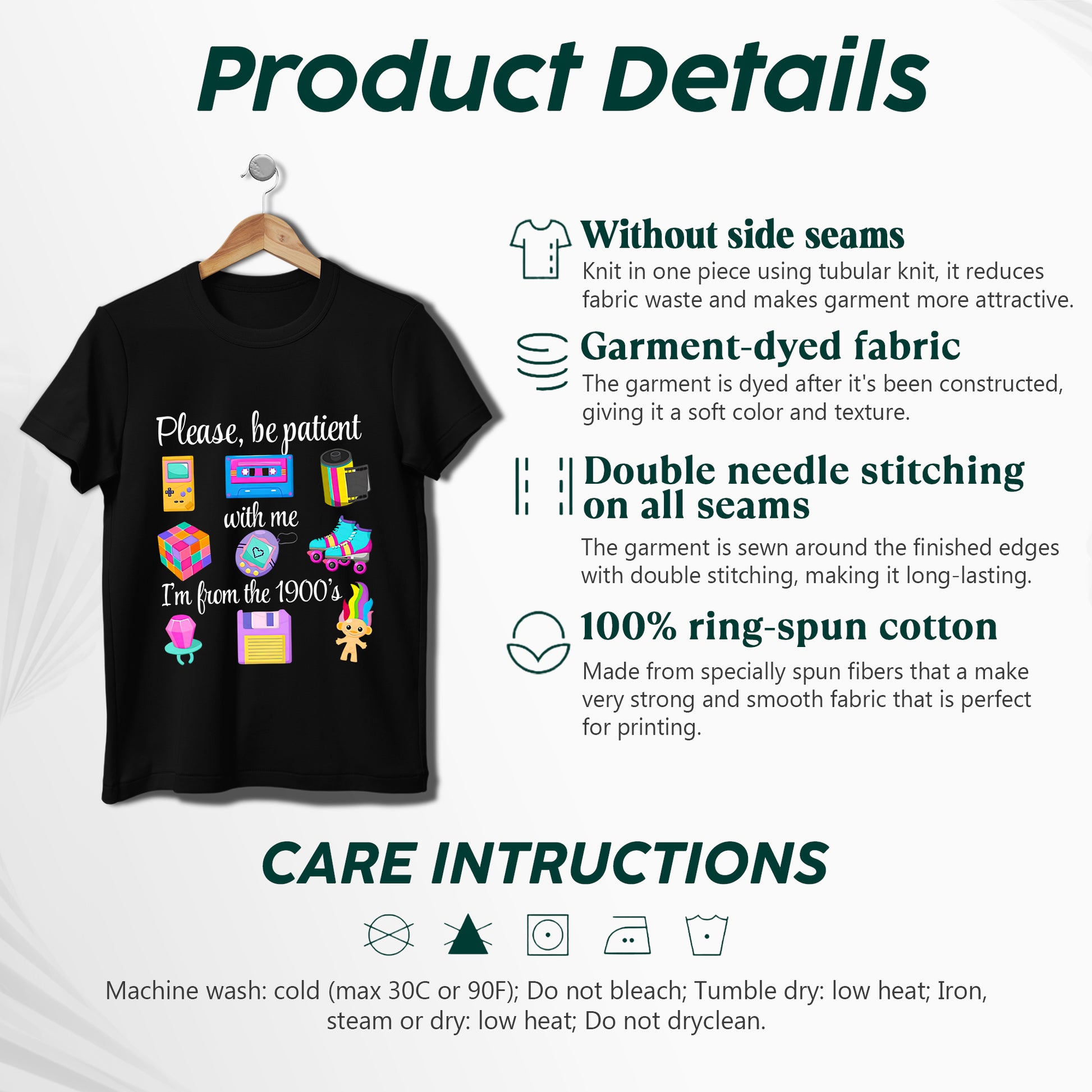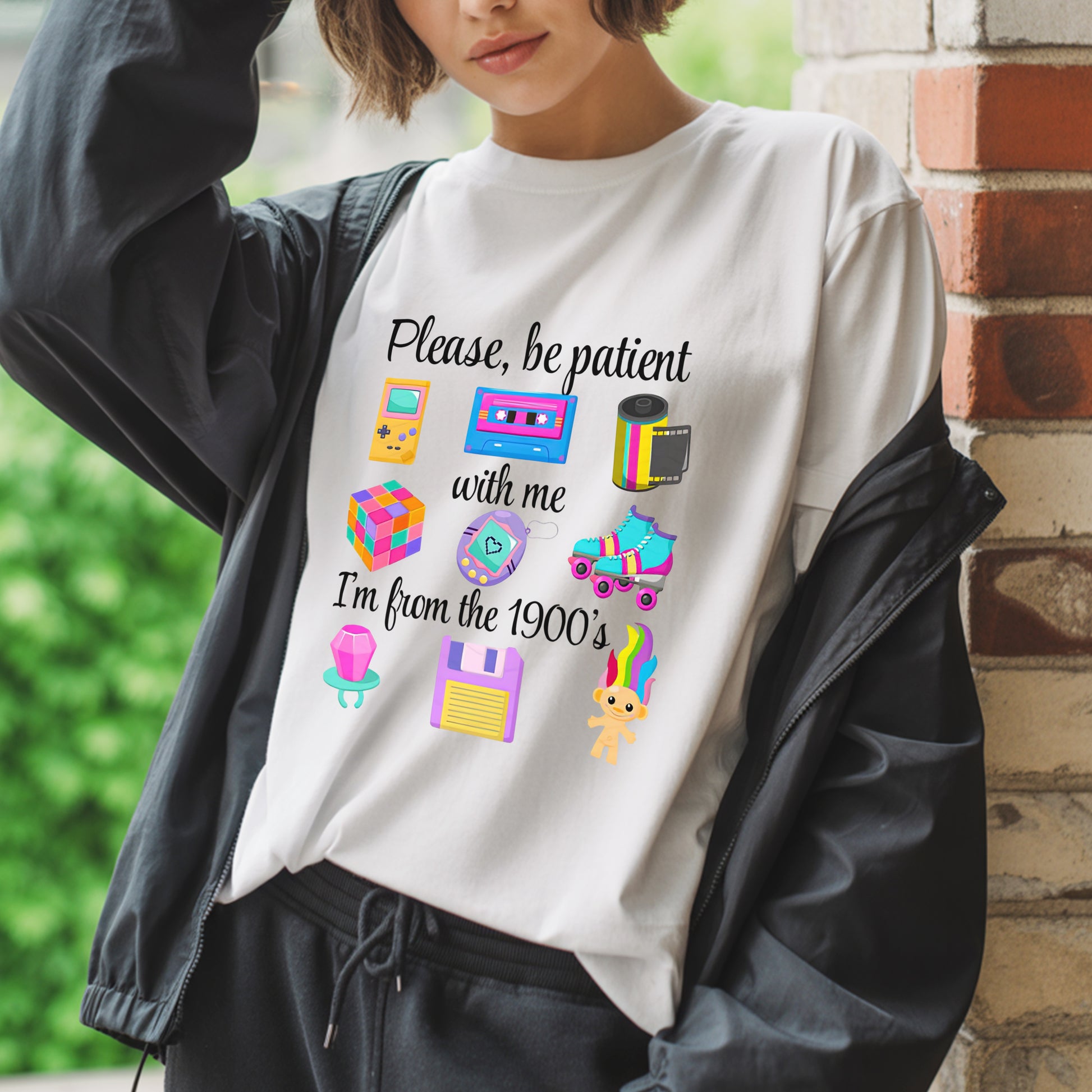 Embrace your vintage roots with humor and pride wearing our "Please, Be Patient With Me I'm From The 1900's" Nostalgia T-Shirt that perfectly captures the struggle of adapting to modern technology when you grew up in a simpler time! This delightfully relatable design features an adorable collection of iconic 90s and early 2000s items including a classic Game Boy, colorful cassette tape, film roll, Rubik's cube, beloved Tamagotchi, retro roller skates, rainbow-haired troll doll, purple floppy disk, and mystical crystal that instantly transport you back to the golden age of childhood when life was less complicated and technology actually made sense. The playful message serves as both a gentle explanation and a humorous reminder that some of us need a little extra patience when navigating today's fast-paced digital world because we remember when phones had cords, music came on physical media, and the internet made that distinctive dial-up sound. Made from premium soft cotton that feels as comfortable as your favorite childhood memories, this tee is perfect for millennials and Gen X who want to wear their vintage pride with humor, anyone who feels overwhelmed by modern technology, or those who simply want to celebrate the amazing decade that shaped their childhood. Perfect for the woman who remembers when MTV played music videos, knows the pain of a tangled cassette tape, or still has muscle memory for blowing into video game cartridges, this nostalgic tee serves as both a conversation starter and a badge of honor that says you survived the best decade ever and you're doing your best to keep up with this crazy modern world – because being from the 1900s isn't just about age, it's about having the coolest childhood memories and the most authentic vintage experience that money can't buy.