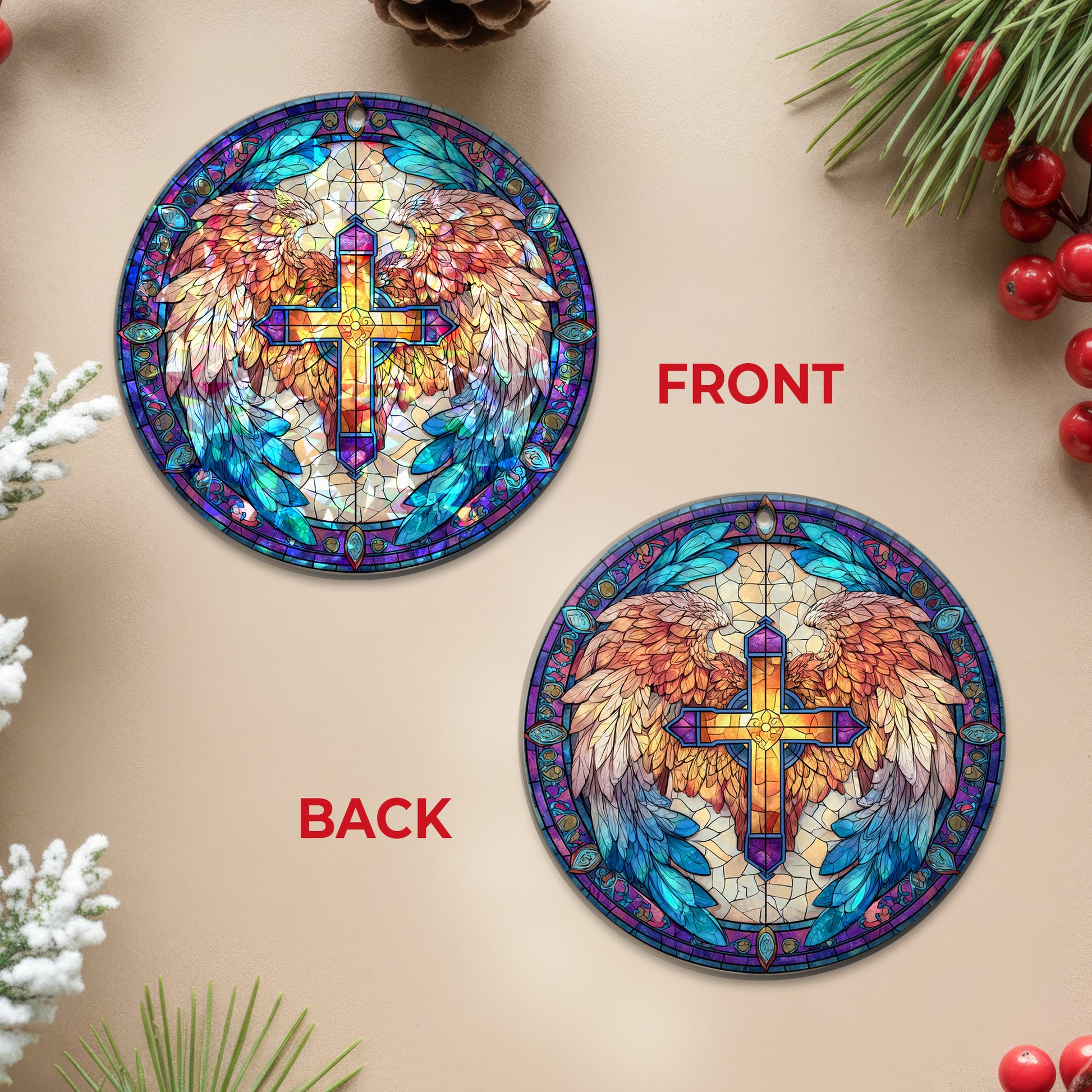 Let your faith take flight this Christmas with this powerful and breathtaking Angel Wing Cross ornament. This unique piece beautifully marries the ultimate symbol of salvation—the Holy Cross—with the divine protection and victory represented by angelic wings. Rendered in a stunning stained glass style and finished with a mesmerizing holographic effect, this ornament is a radiant declaration of a faith that overcomes all things.