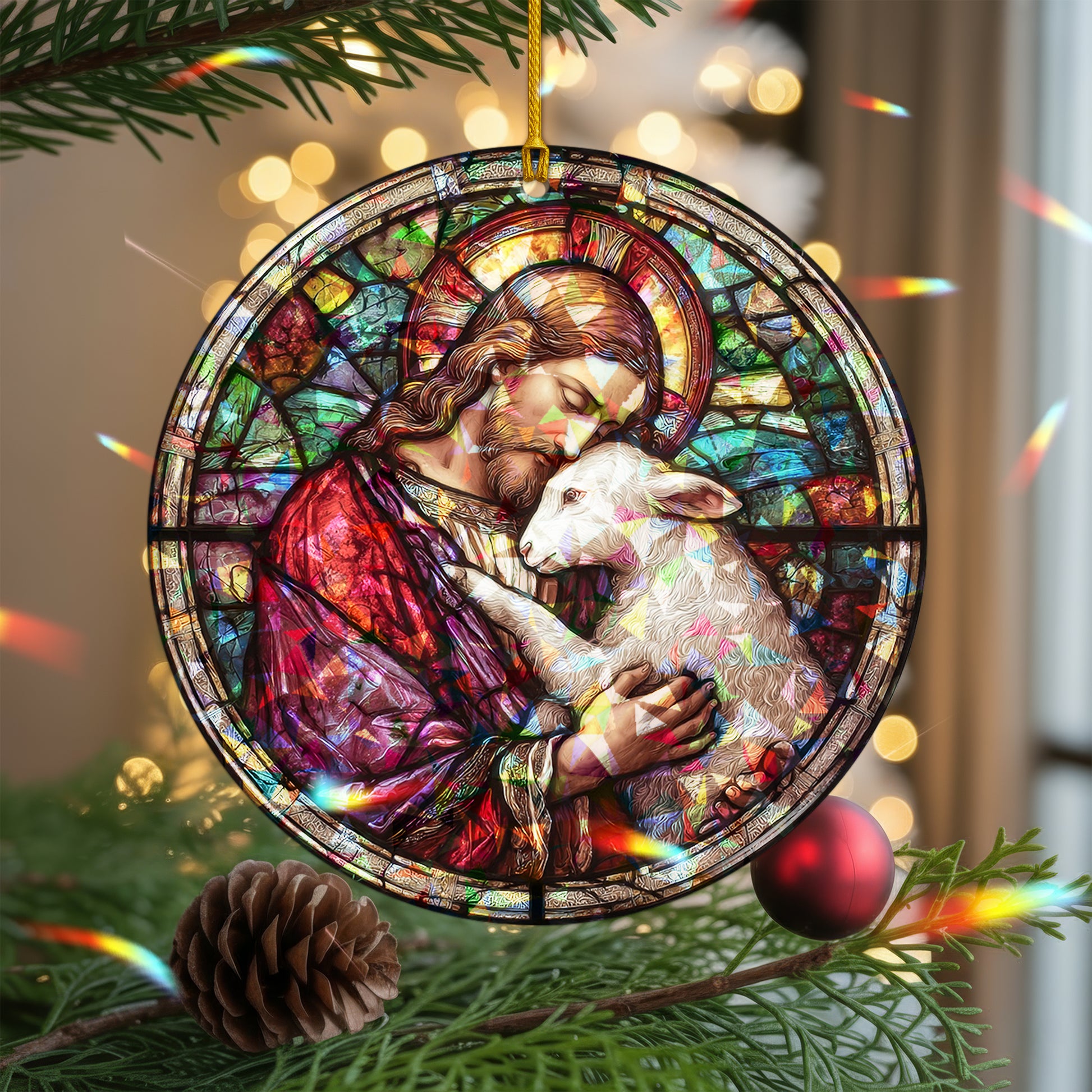Let the gentle heart of the Good Shepherd grace your Christmas tree this season. This exquisite ornament captures the tender moment between Jesus and a gentle lamb, a timeless symbol of His loving care for each of us. Rendered in a stunning stained glass design and brought to life by a mesmerizing holographic finish, this piece is a profound reminder that we are always held in the arms of our Savior.