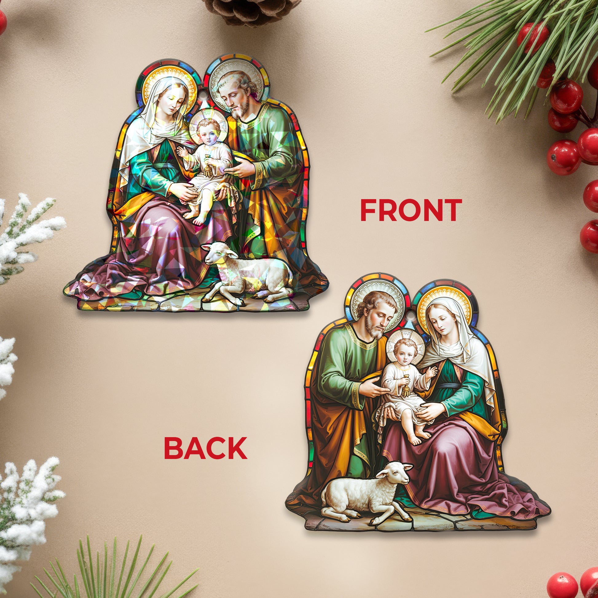 • Unique Bell Shape Artistry: This design beautifully combines the joyful shape of a Christmas bell with the sacred scene of the Nativity. The artwork, inspired by cathedral windows, features Mary, Joseph, and Baby Jesus, complete with a gentle lamb at their feet—a symbol of the Lamb of God.