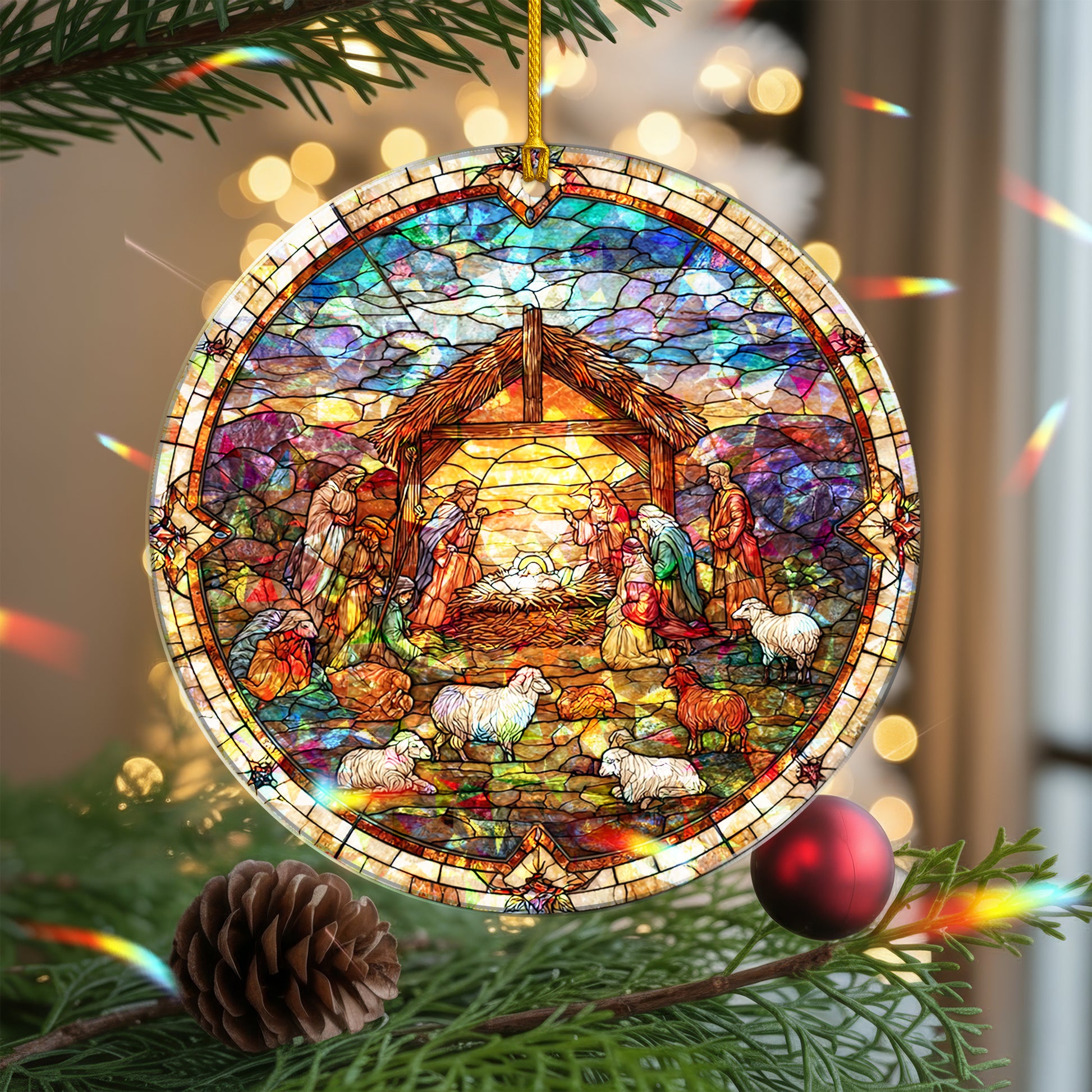 Stained Glass Nativity Scene Holographic Christmas Ornament | Full Manger Scene | Religious Christian Keepsake