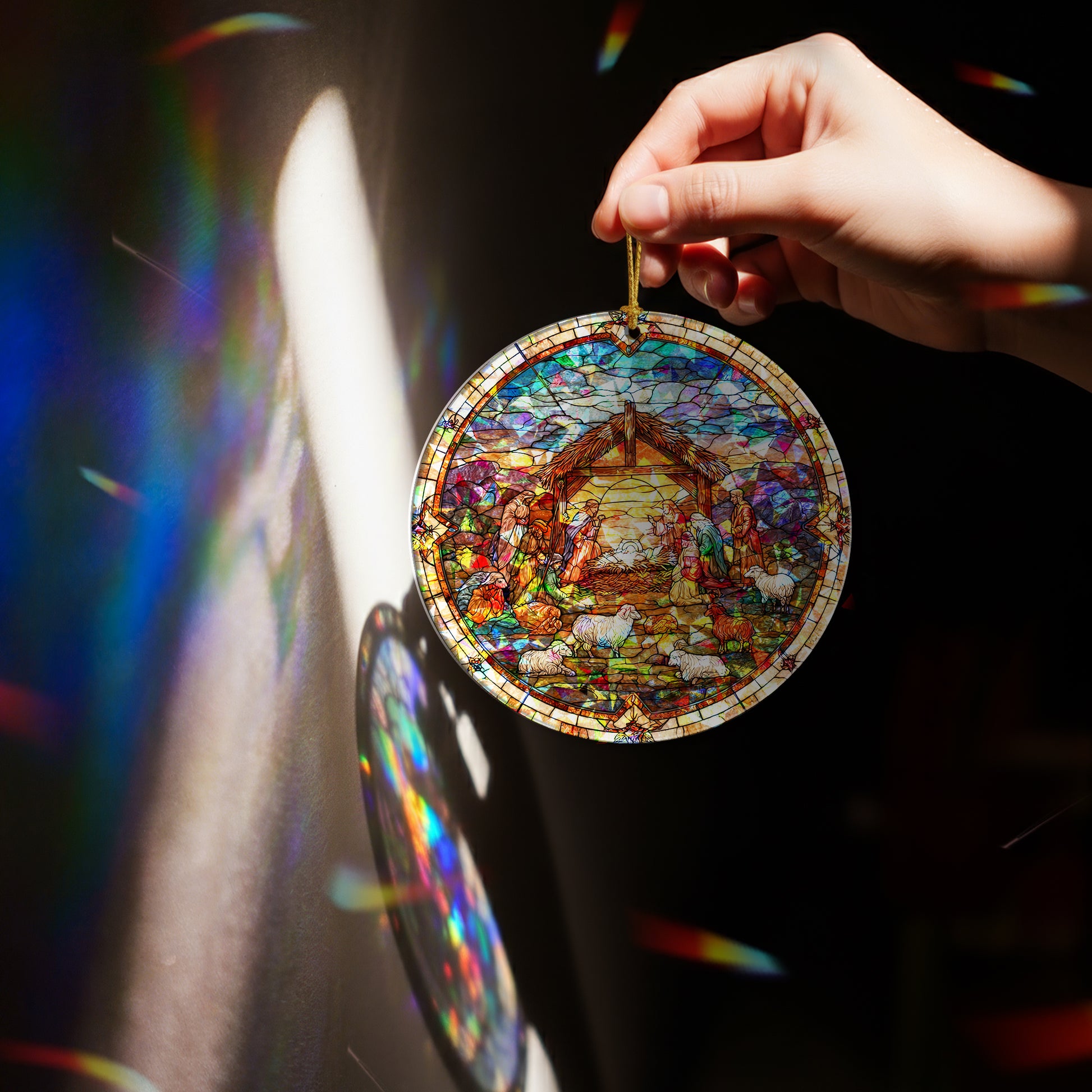 Behold the entire miracle of the first Christmas, captured in one breathtaking ornament. This piece doesn't just show the Holy Family; it tells the whole story of that sacred night in Bethlehem—the humble manger, the watchful shepherds, and the star of wonder, all brought to life in a radiant stained glass design. A special holographic finish makes the scene shimmer and dance with light, turning your Christmas tree into a window to that holy night.