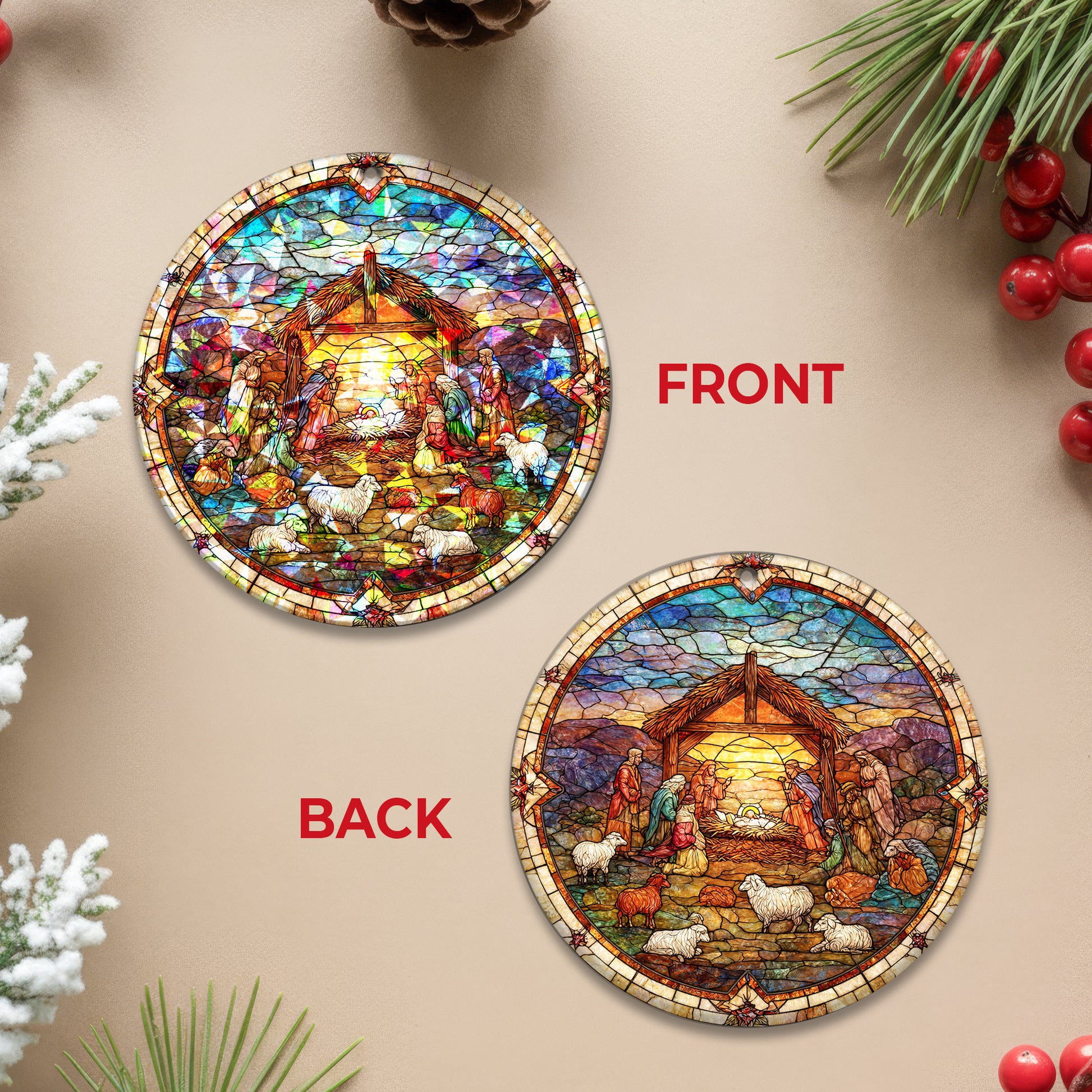 • Complete Nativity Scene: Inspired by classic cathedral art, this richly detailed design features the full manger scene: Mary, Joseph, Baby Jesus, the shepherds, and their flock, all gathered under the Star of Bethlehem.
