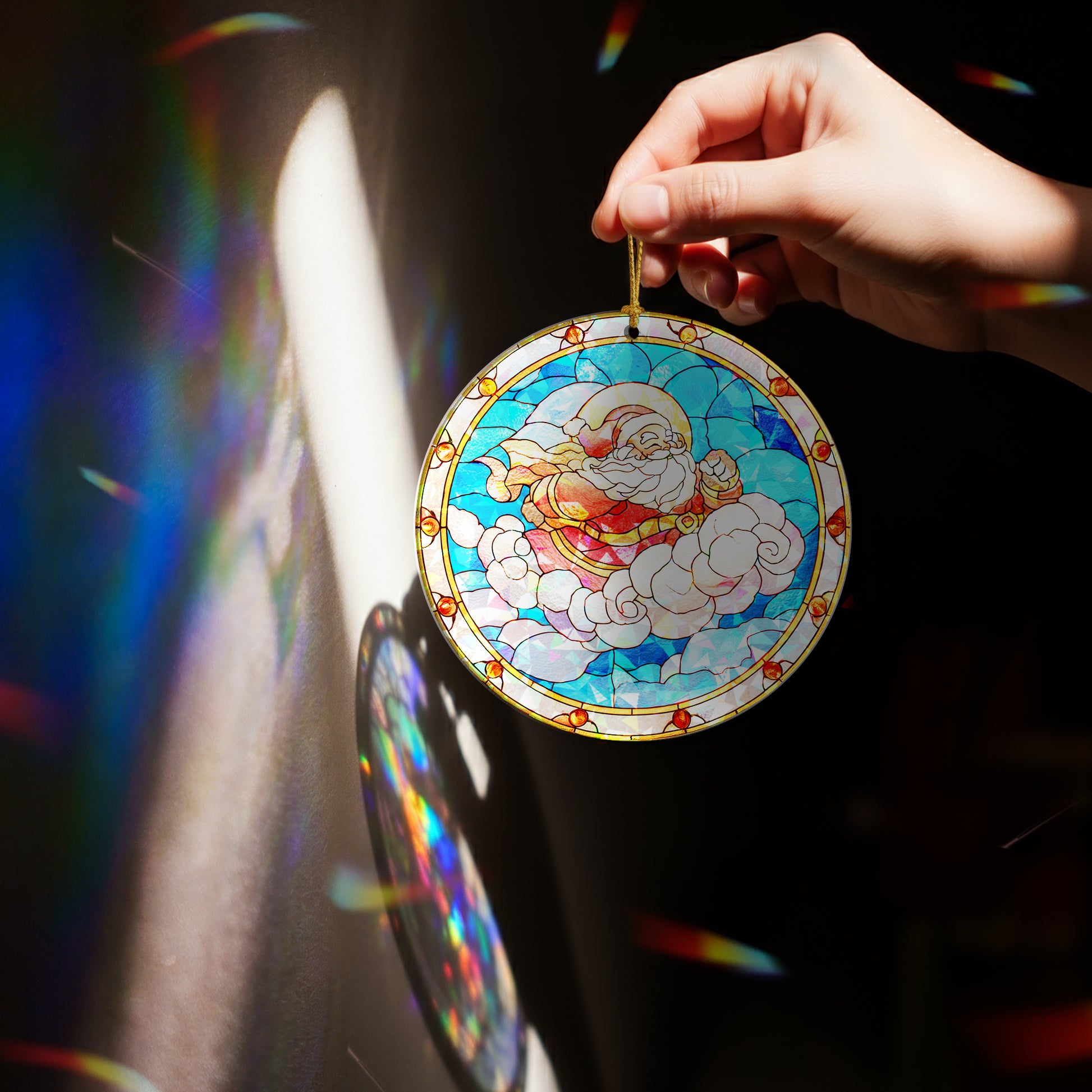 Bring a touch of Christmas magic to your tree with this enchanting Santa Claus ornament. Captured in a vibrant stained glass style, this isn't just any depiction of St. Nick; it's a piece of art that glows with the jolly spirit of the season. Watch as a special holographic finish brings this festive scene to life, casting a kaleidoscope of cheerful color that dances with your Christmas lights.