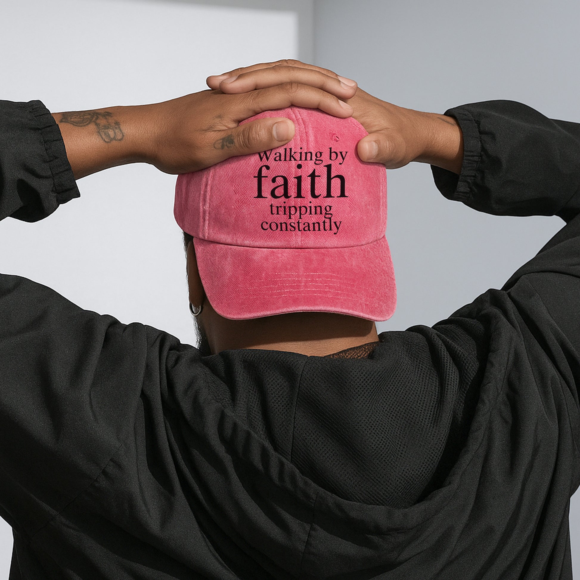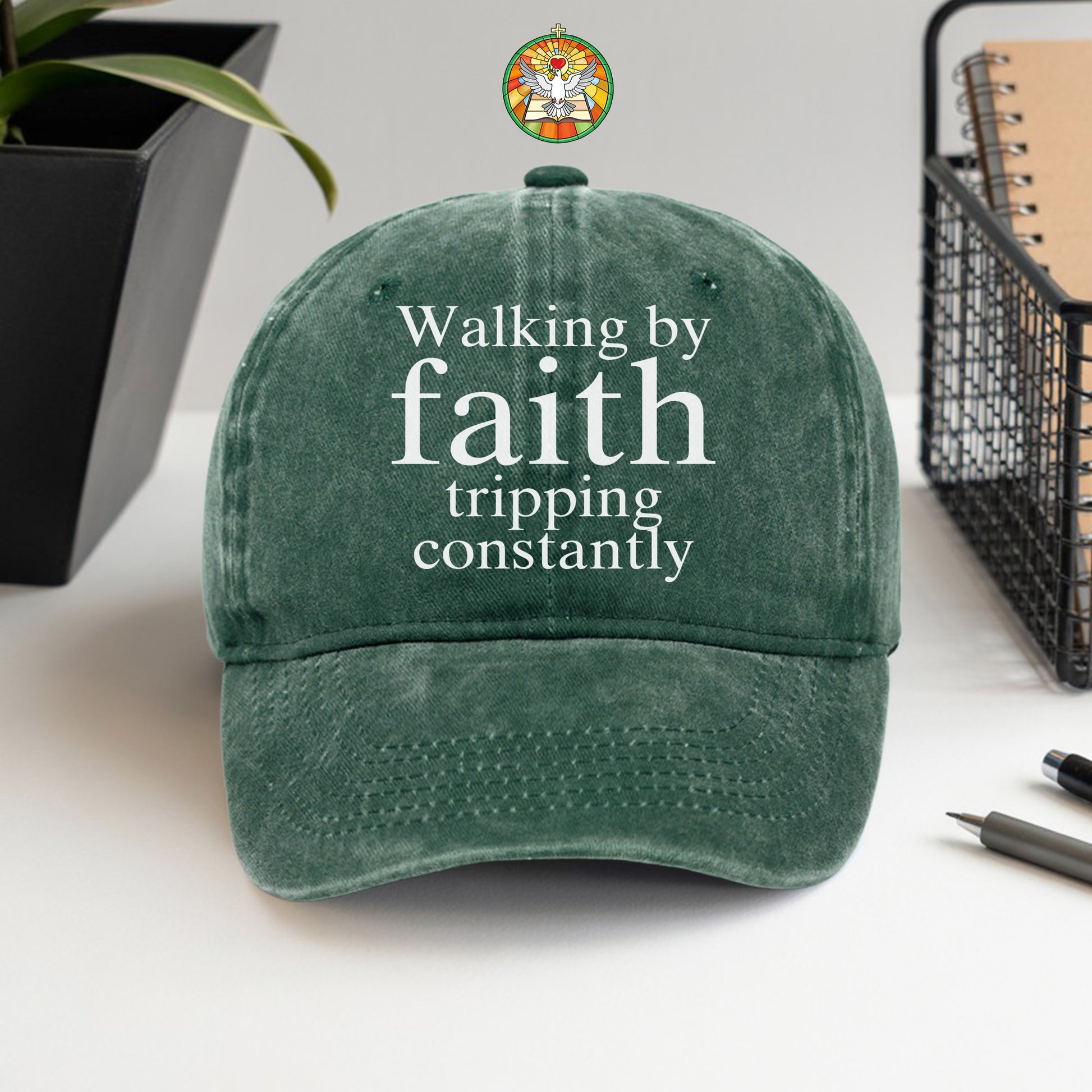 - High-quality embroidered design featuring Walking by faith tripping constantly in clean, readable typography