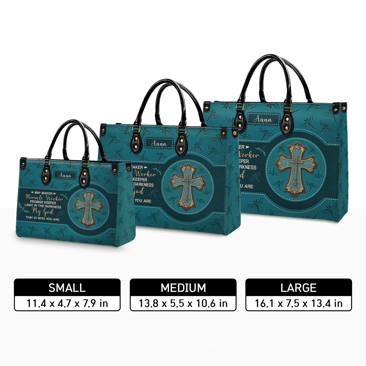 Carry your worship with divine declaration with our "Way Maker Miracle Worker Promise Keeper" Personalized Leather Handbag. This exquisite worship-inspired accessory beautifully combines praise with natural elegance, featuring an ornate bronze cross surrounded by delicate dragonflies against a rich teal leather background that symbolizes the flowing waters of God's faithfulness. Perfect for the faithful woman who declares God's attributes through song while maintaining sophisticated style, this handcrafted handbag serves as both a daily companion and a meaningful reminder that our God is Way Maker, Miracle Worker, Promise Keeper, and Light in the Darkness - that is who He is.
