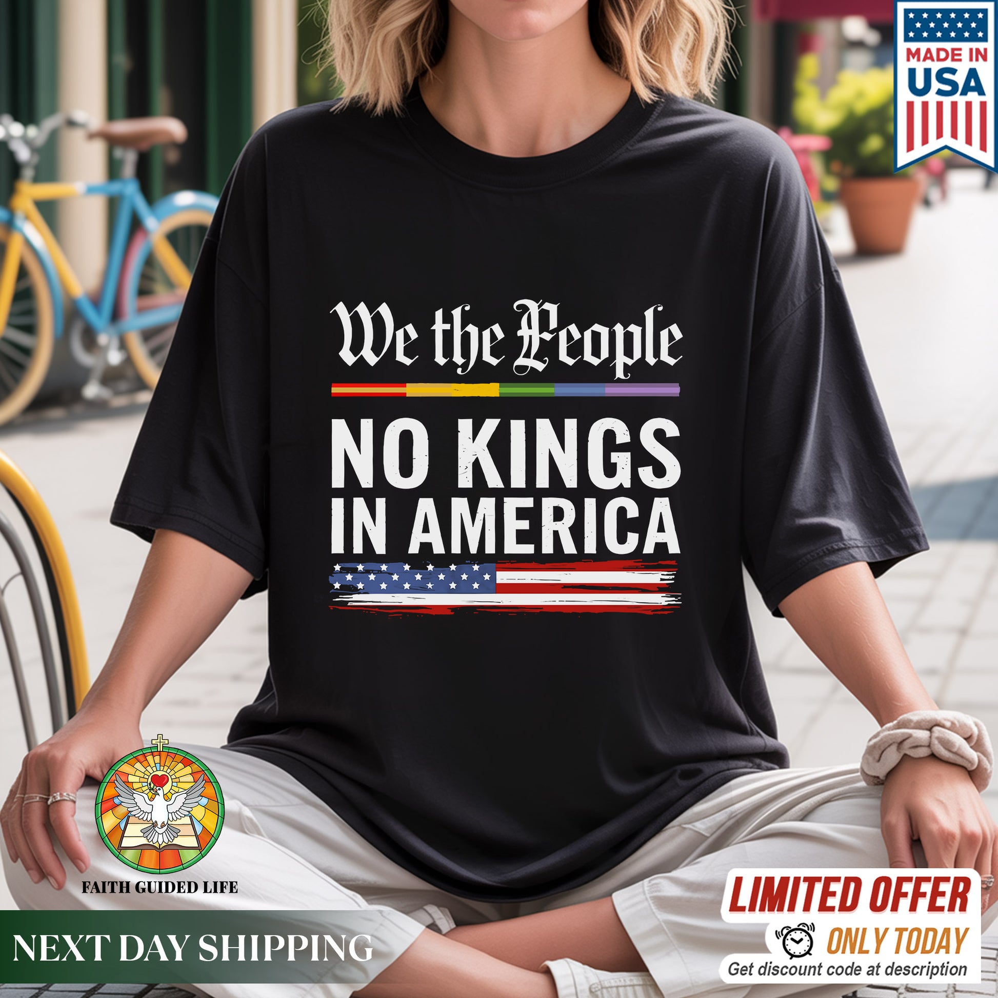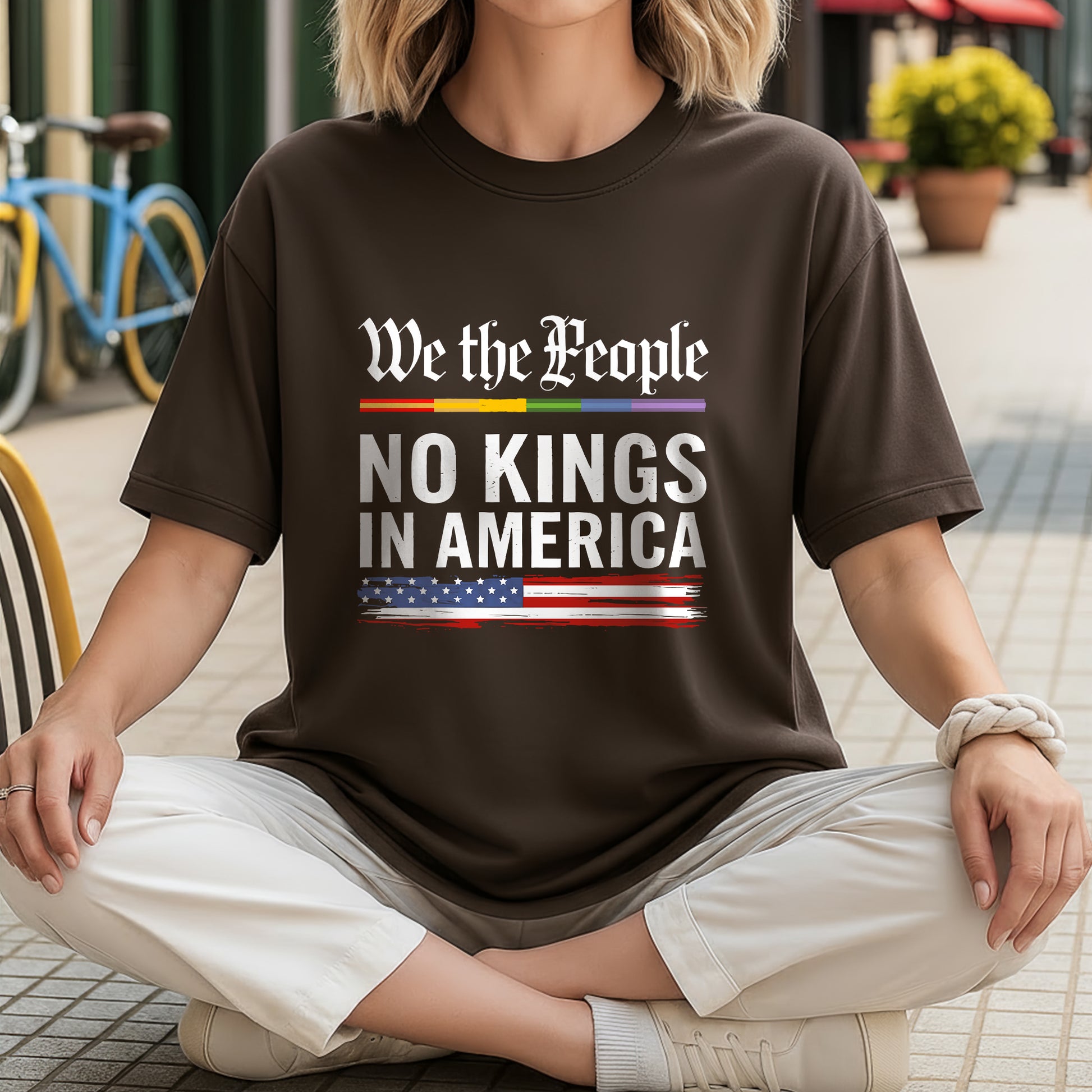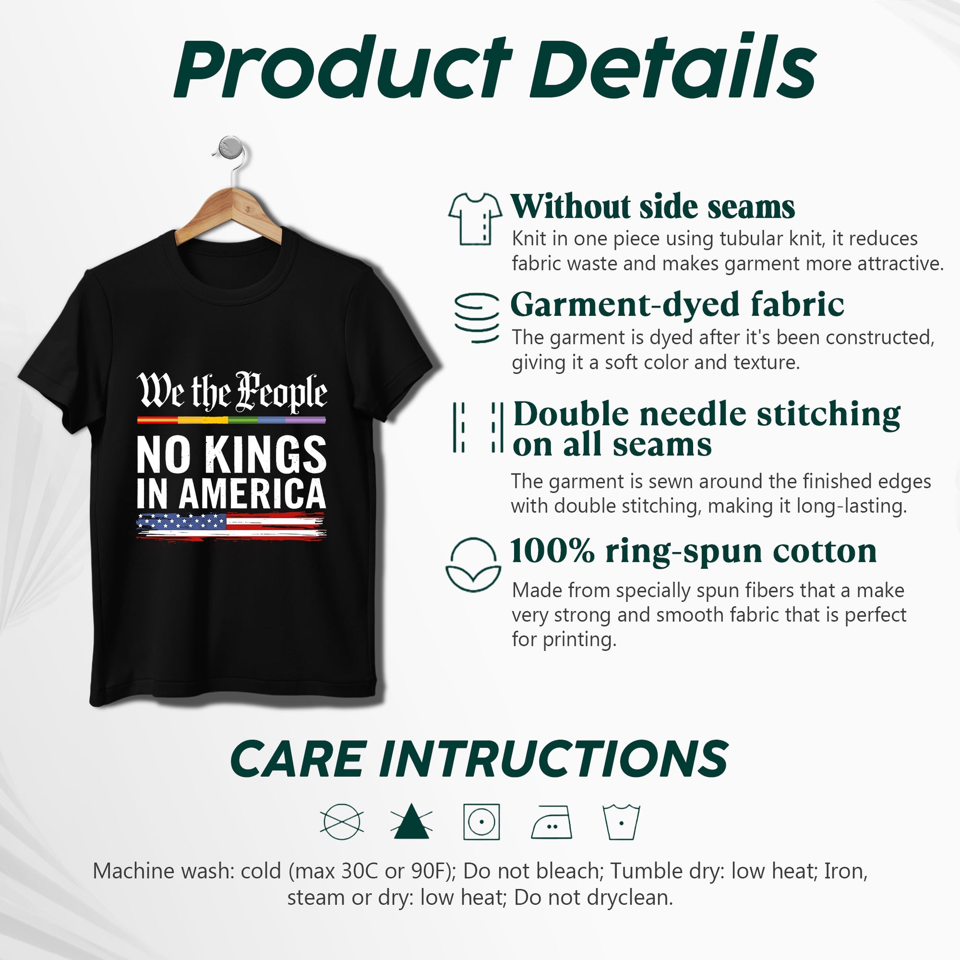 Celebrate true American values with our "We the People – No Kings in America" T-shirt from the American Heritage collection. Crafted with premium cotton, this shirt honors the enduring legacy of individual freedom, equality, and patriotism. Featuring a bold design with classic American symbolism, it's perfect for anyone who embraces the spirit of democracy and seeks quality, comfort, and style made in the USA.