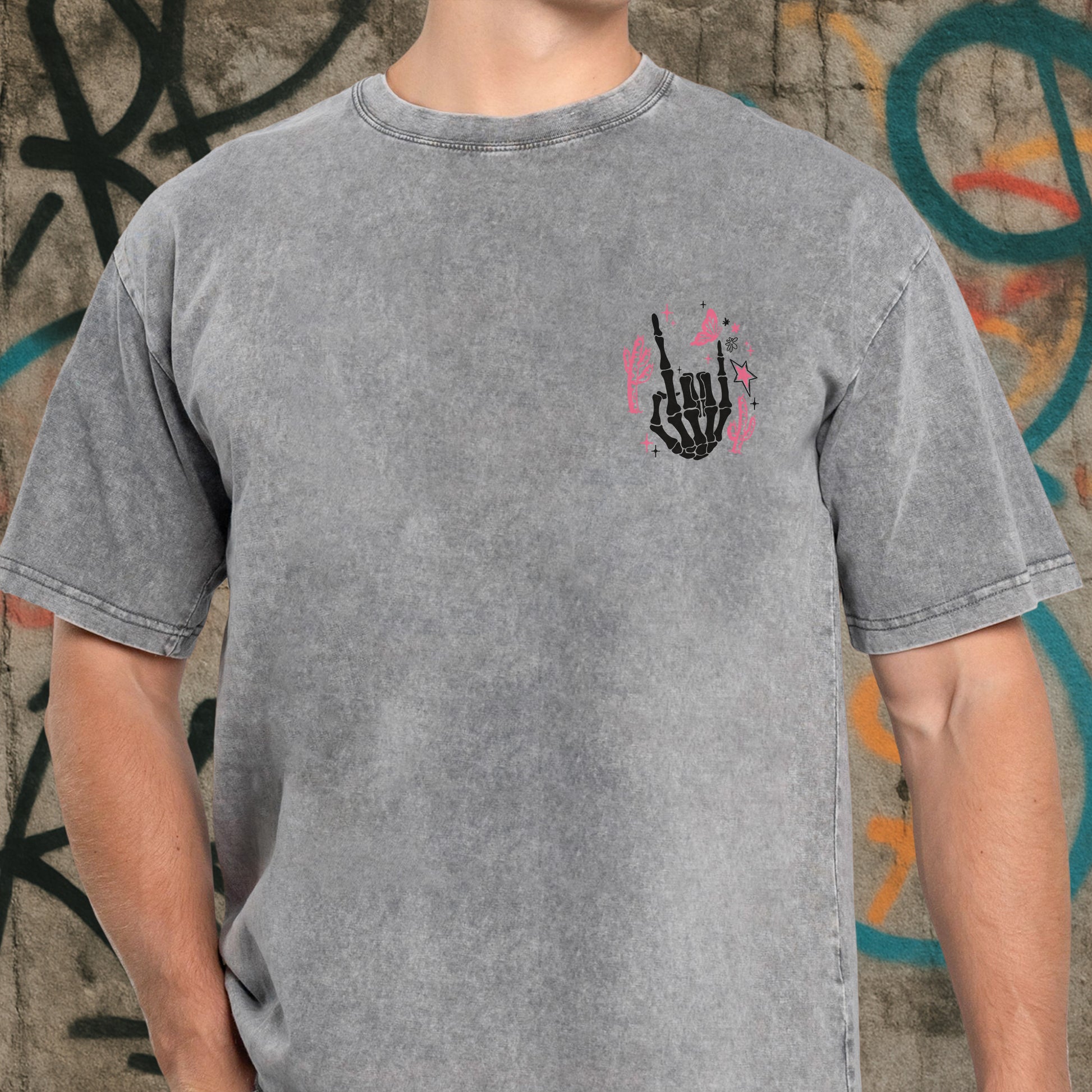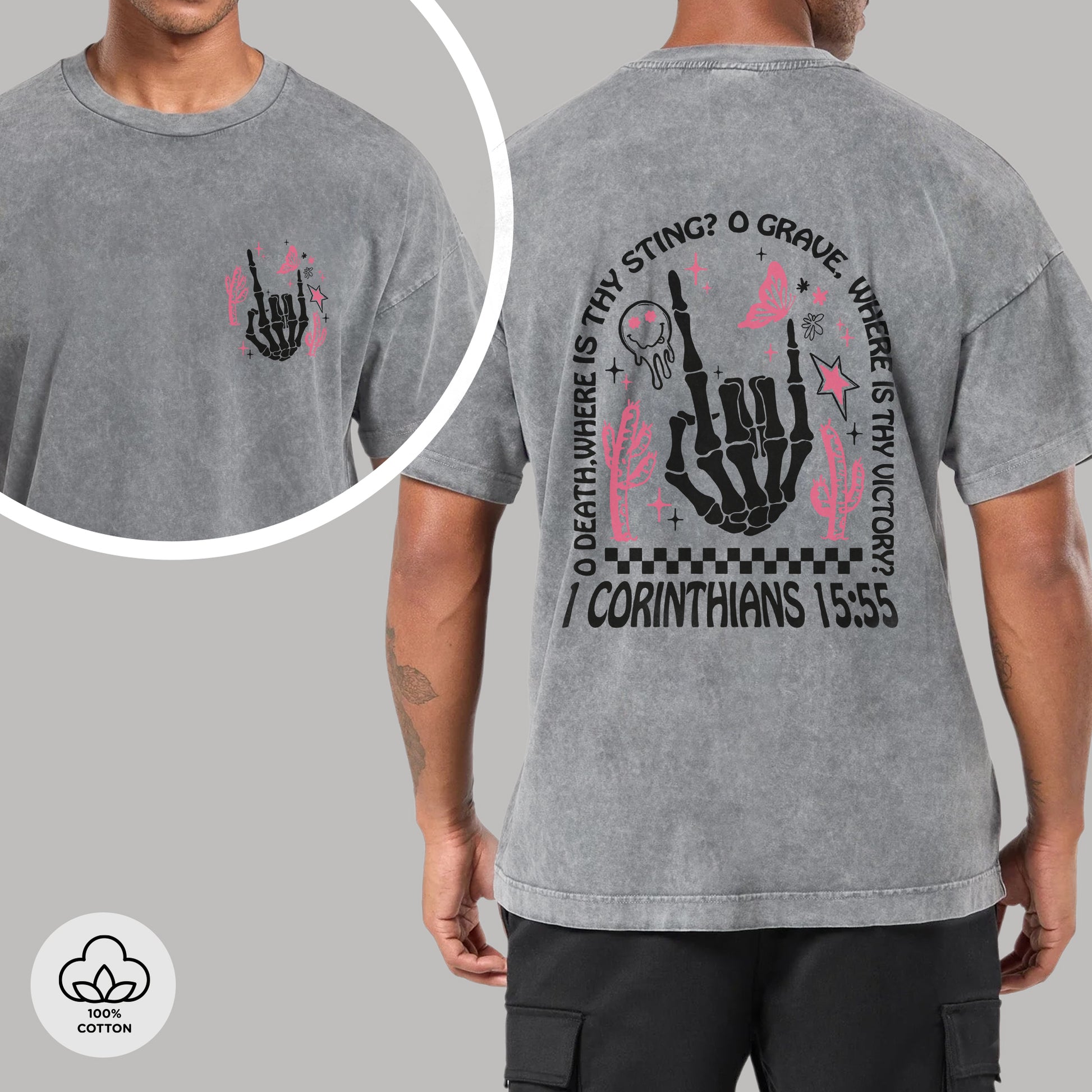 Make a bold statement about victory over death with our "Where Is Thy Sting? O Grave Where Is Thy Victory?" Washed T-Shirt that combines rebellious attitude with powerful Christian truth! This premium 100% cotton tee features a perfectly aged black wash finish and showcases a striking skeleton hand making a defiant gesture toward death itself, surrounded by vibrant pink decorative elements including butterflies, stars, and floral accents that represent the beauty and life that triumph over darkness. The design references 1 Corinthians 15:55, one of the most powerful verses about Christ's victory over death and the grave, presented both as an edgy chest print and a bold back statement with checkered pattern details that add a punk rock aesthetic to this profound biblical message. The soft, breathable 100% cotton construction combined with the vintage washed finish creates that authentic lived-in comfort perfect for making a statement about your unshakeable faith in Christ's resurrection power. Perfect for the Christian woman who isn't afraid to be bold about her faith, appreciates edgy religious expression, or wants to remind the world that death has no power over those who believe in Jesus, this comfortable washed tee serves as both a rebellious declaration and a powerful testimony that when Christ conquered the grave, He gave believers the ultimate reason to flip off fear, death, and everything that tries to intimidate us – because where sin and death once reigned, victory and eternal life now rule supreme through our Lord and Savior.
