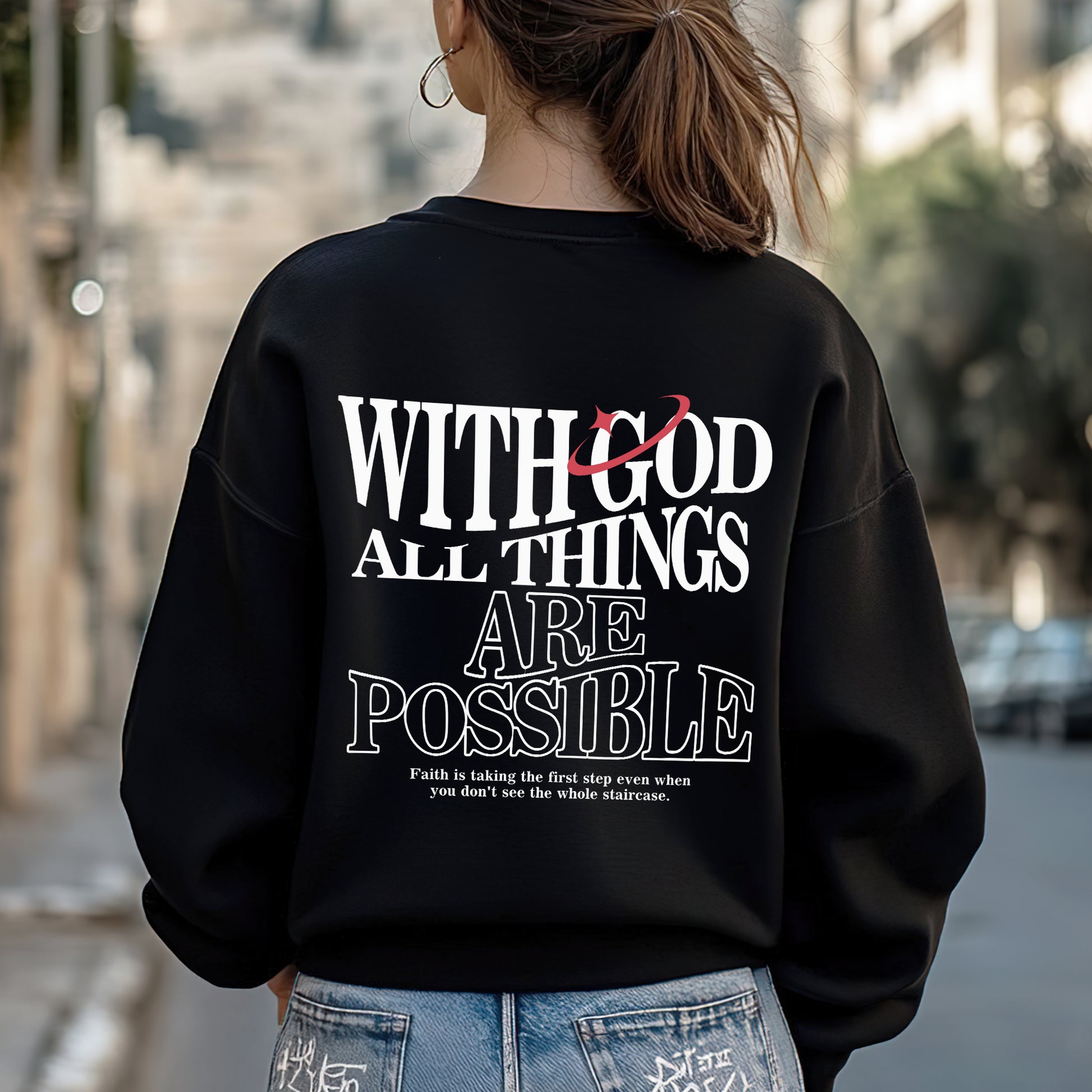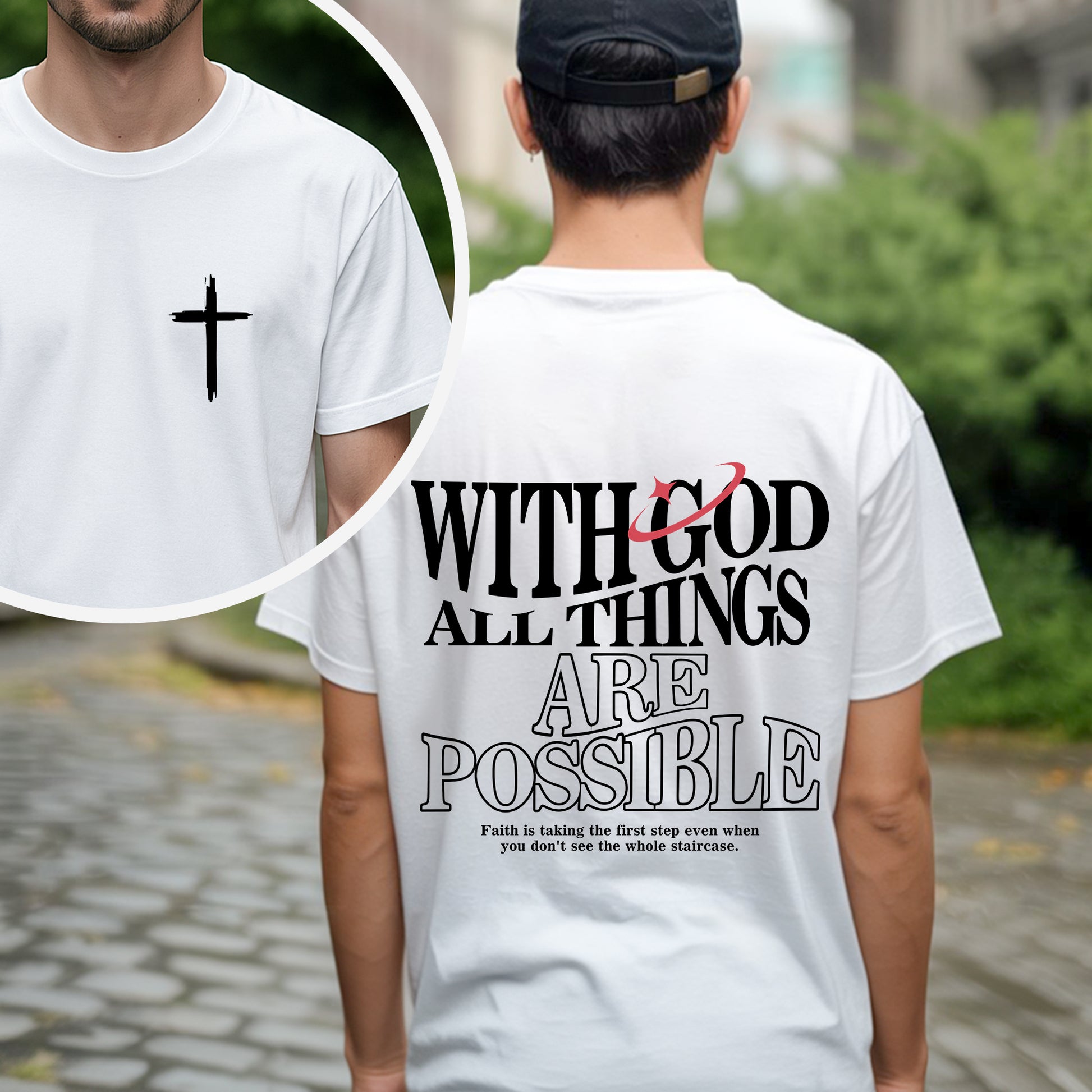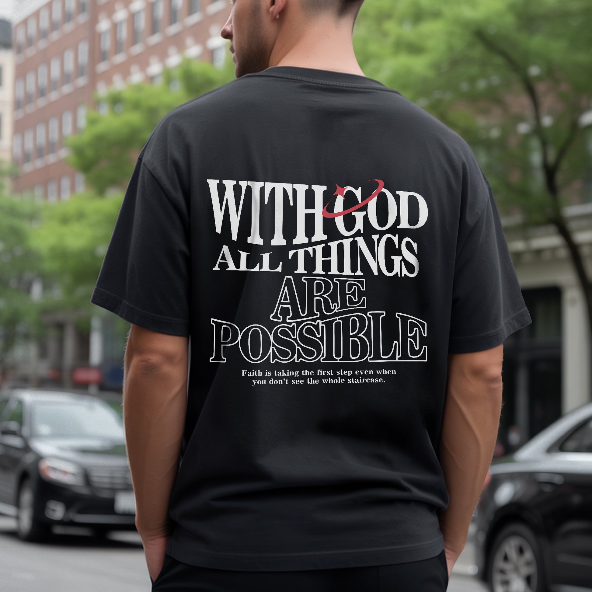 - Bold "WITH GOD ALL THINGS ARE POSSIBLE" design with inspiring typography and red accent