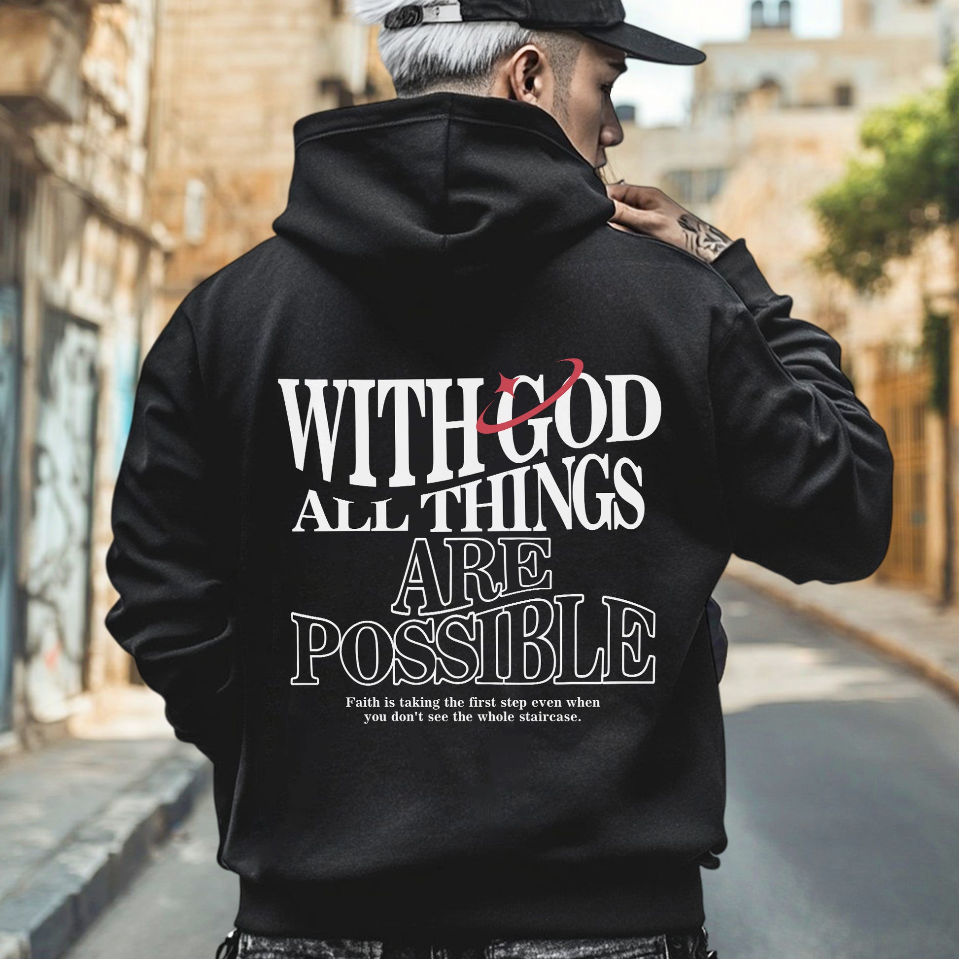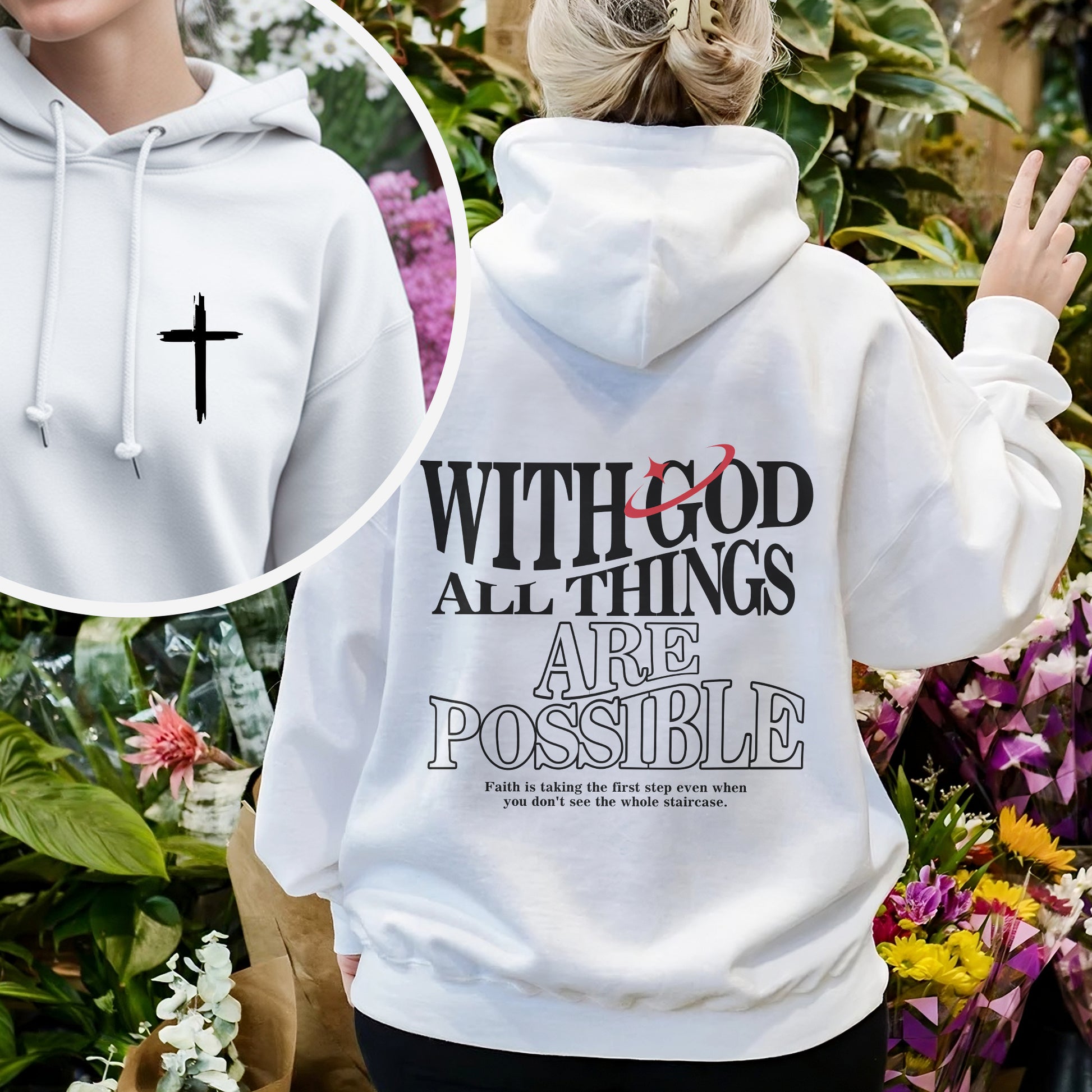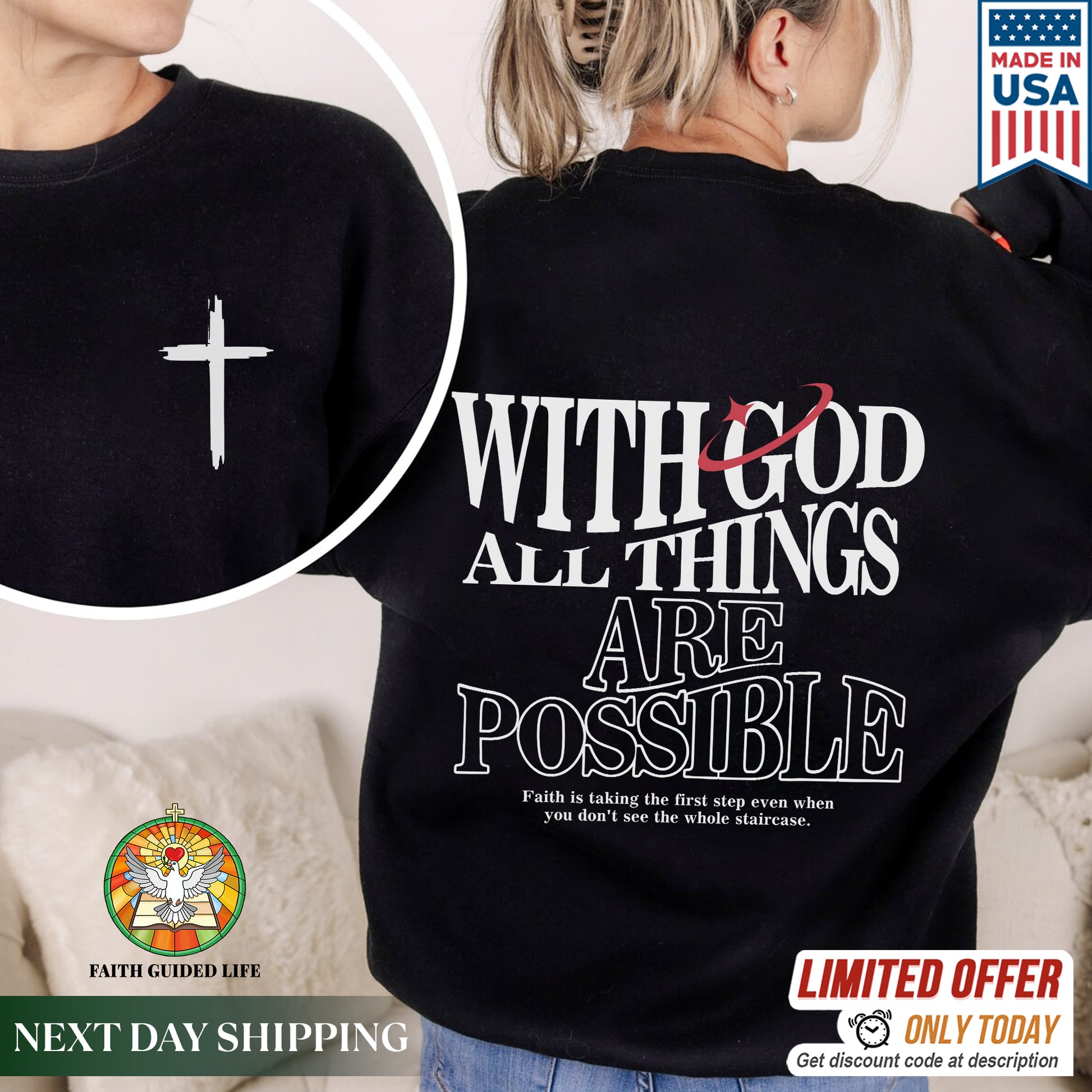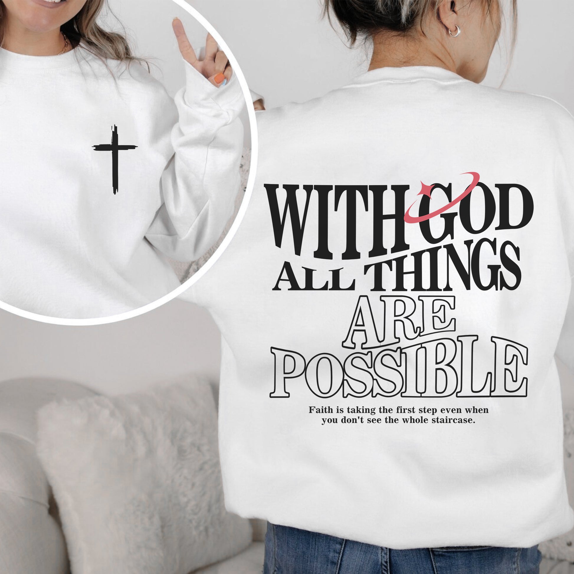 - Bold "WITH GOD ALL THINGS ARE POSSIBLE" design with inspiring typography and red accent